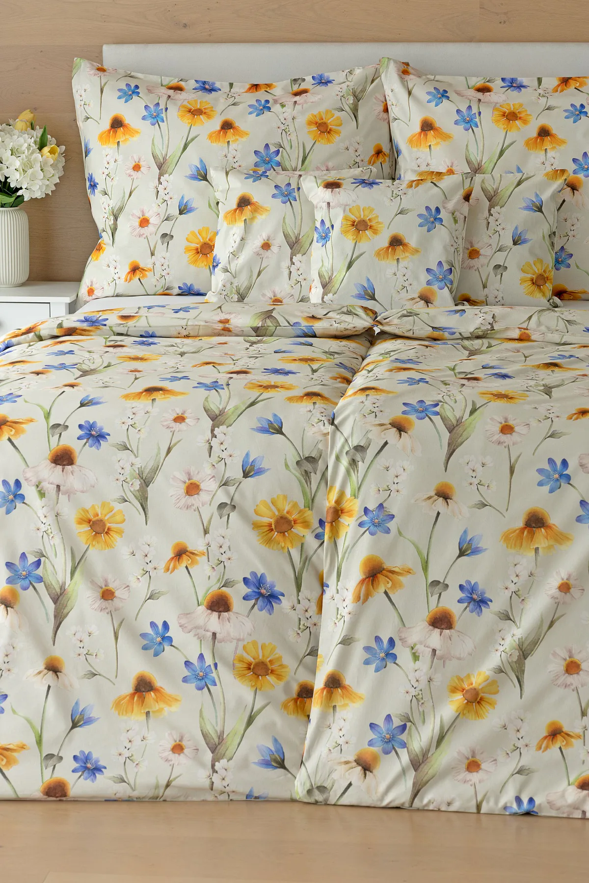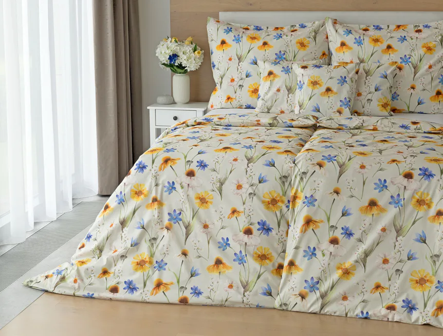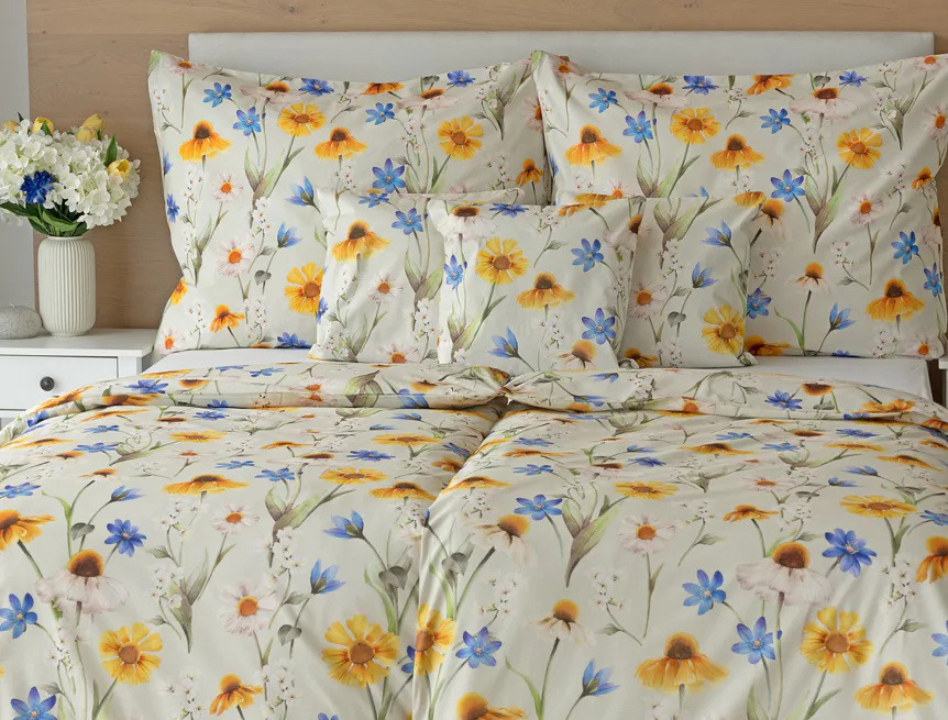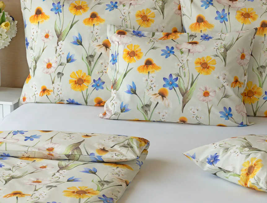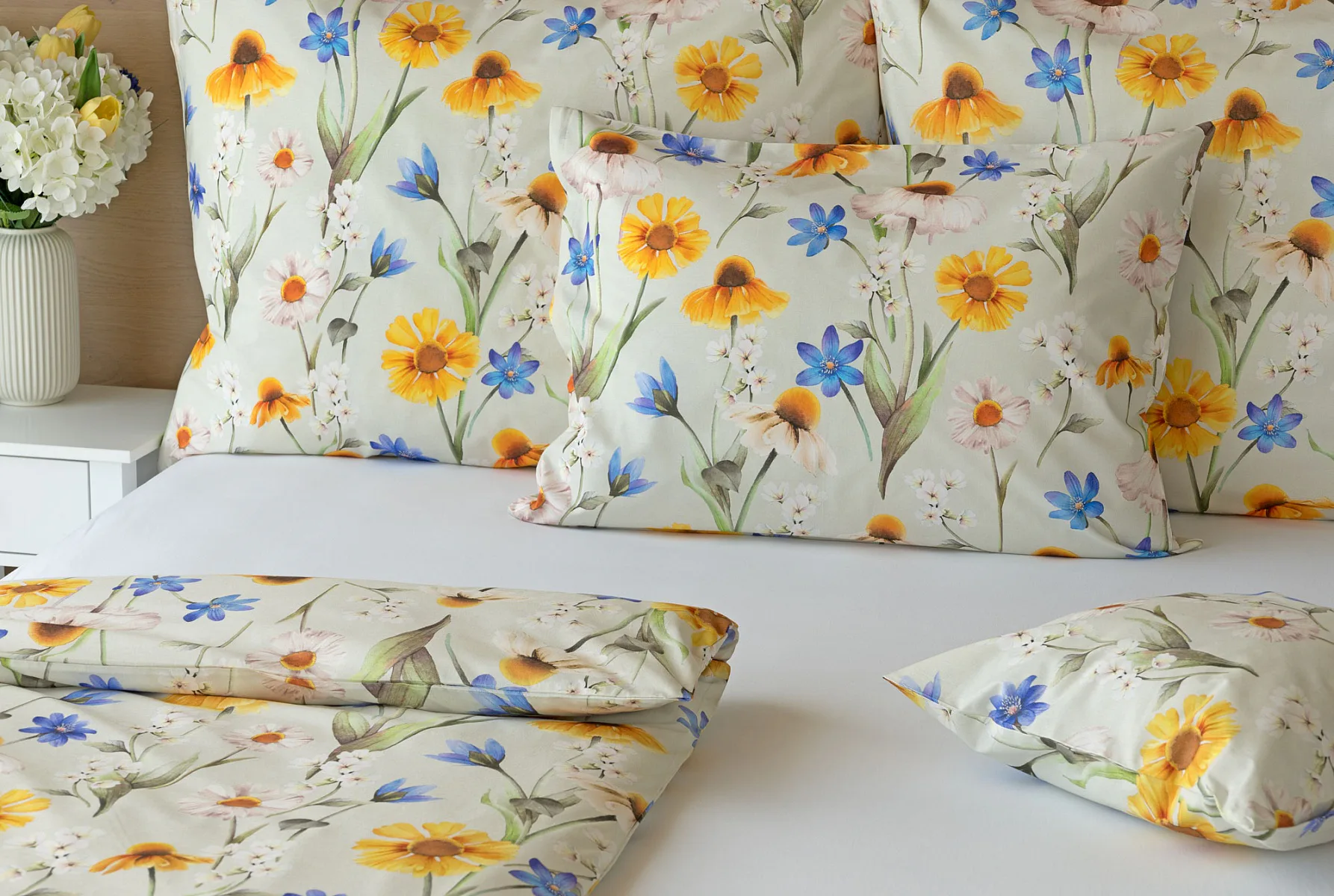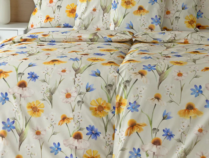 Dopřejte své ložnici svěží nádech s bavlněným povlečením Zaria. Směsice lučního kvítí v odstínech žluté, oranžové a fialovomodré barvy vyniká na decentním podkladu v tlumeném zeleném tónu. Díky nejmodernějšímu digitálnímu tisku vyniká vzor v precizním detailu.