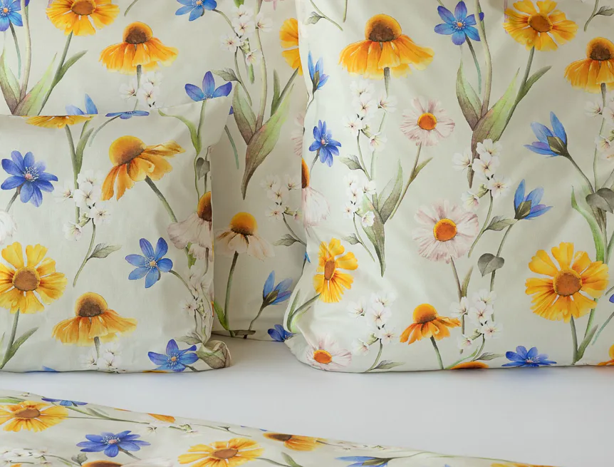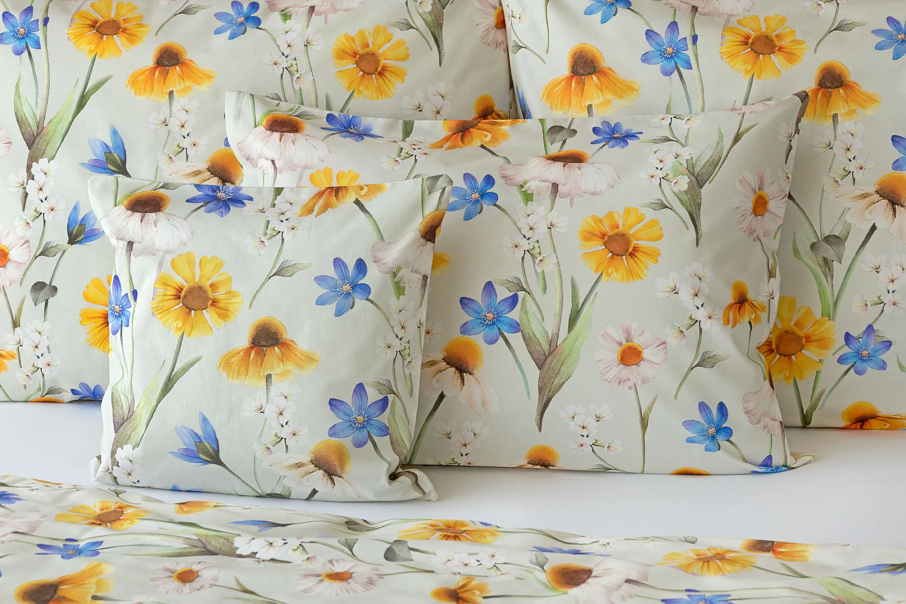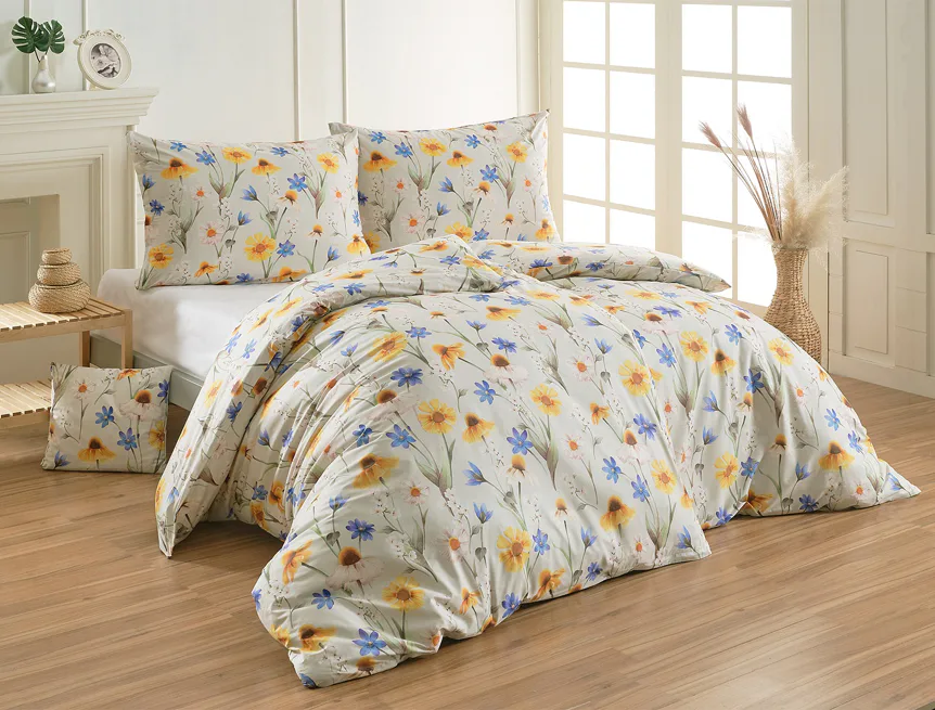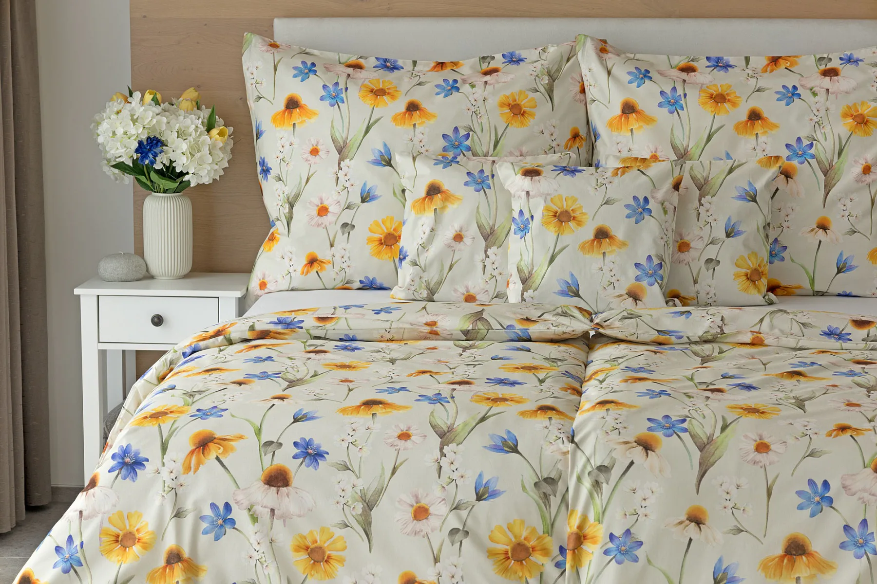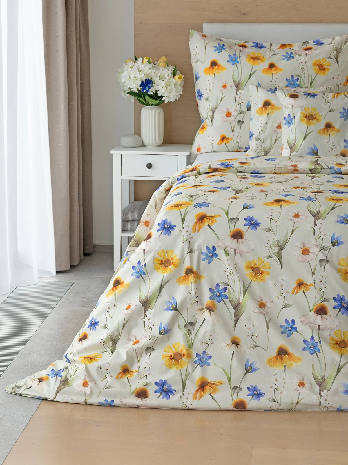 Dopřejte své ložnici svěží nádech s bavlněným povlečením Zaria. Směsice lučního kvítí v odstínech žluté, oranžové a fialovomodré barvy vyniká na decentním podkladu v tlumeném zeleném tónu. Díky nejmodernějšímu digitálnímu tisku vyniká vzor v precizním detailu.