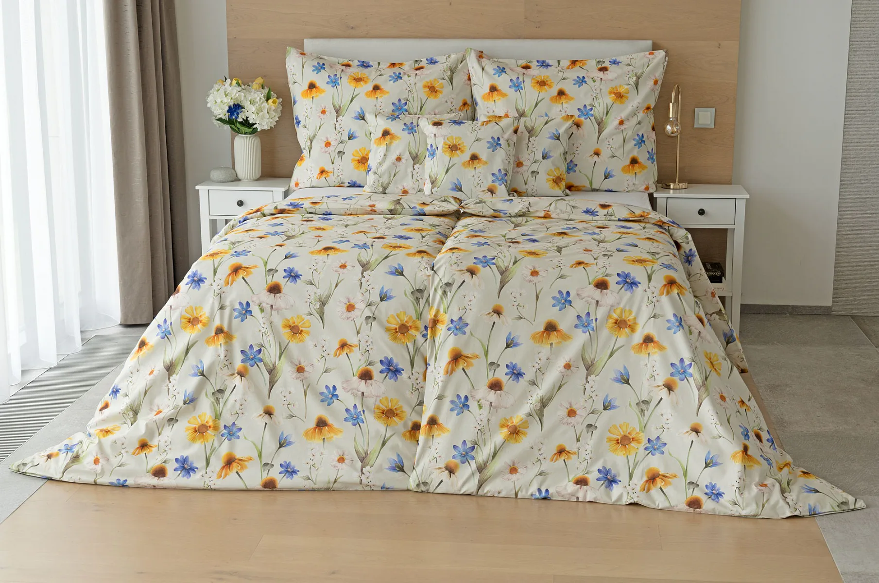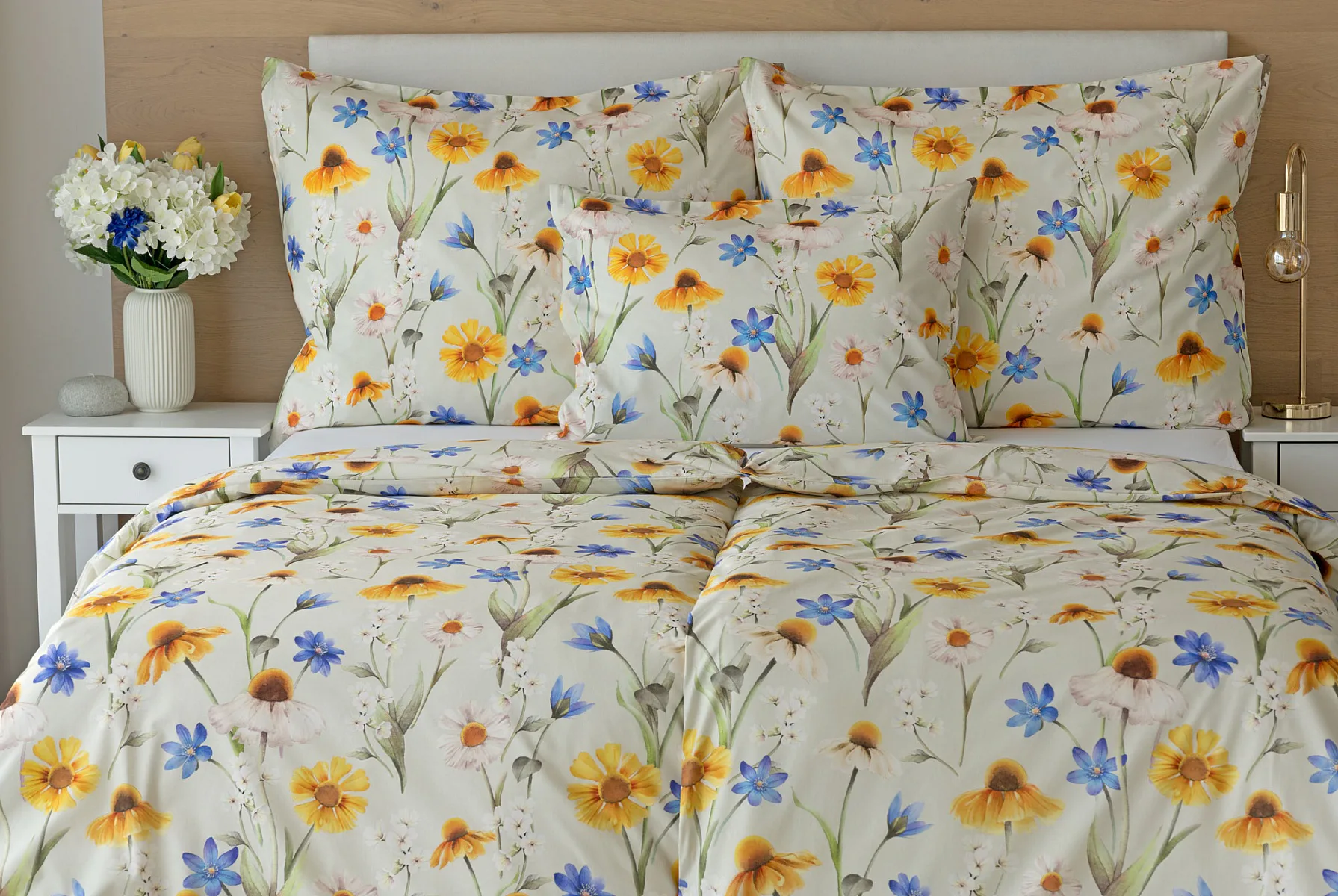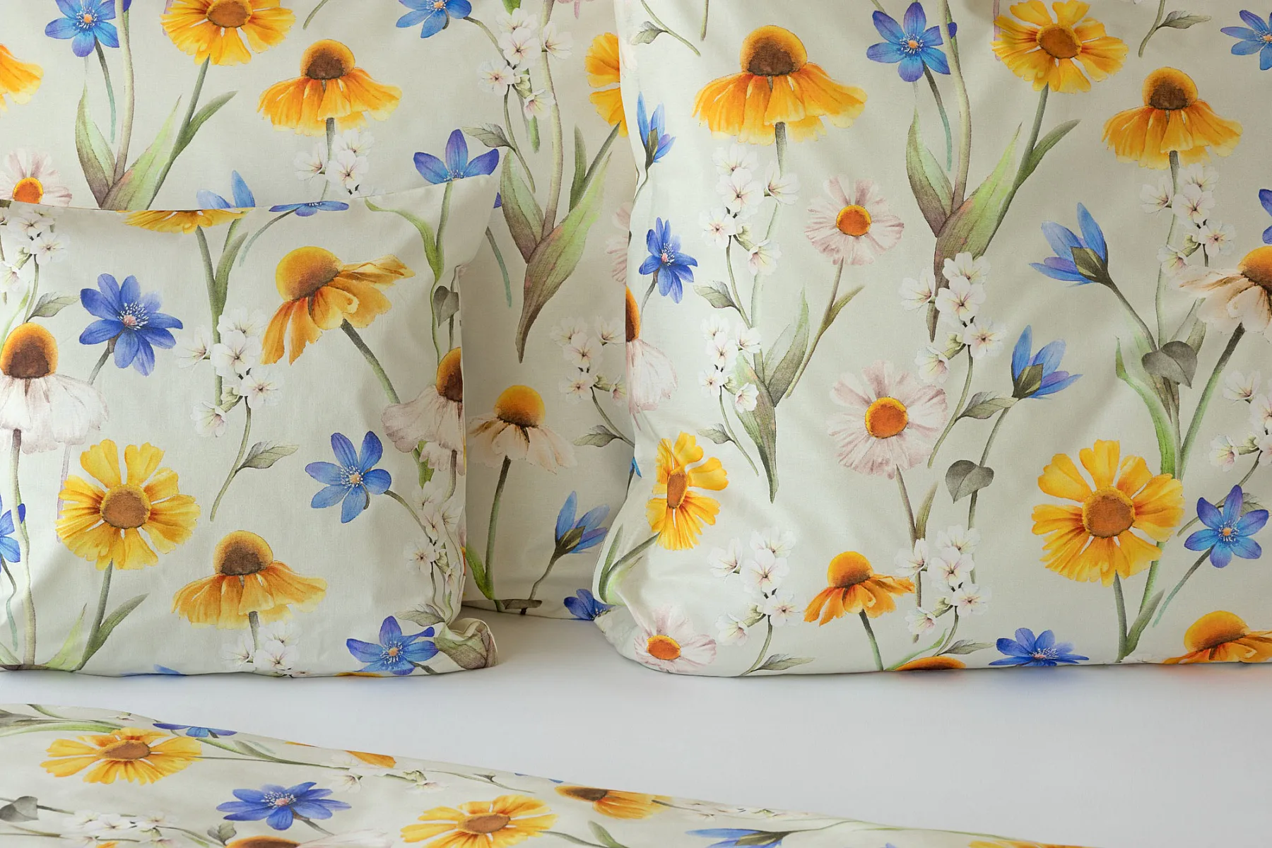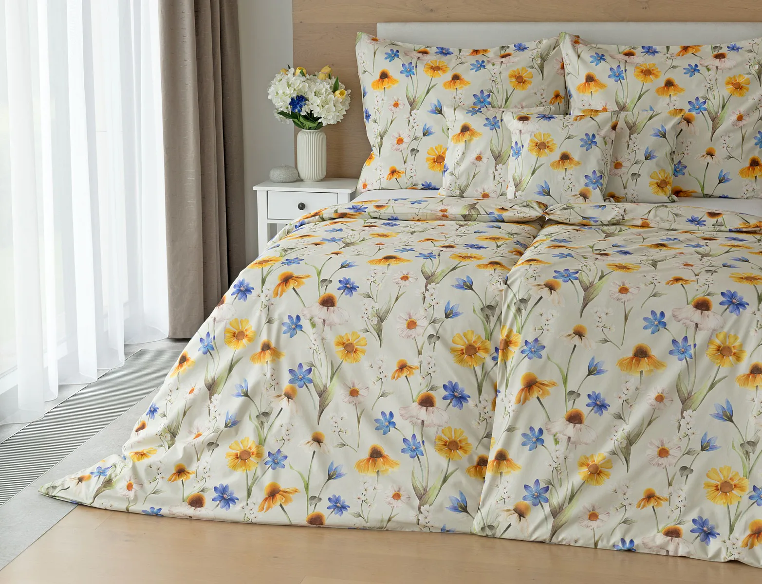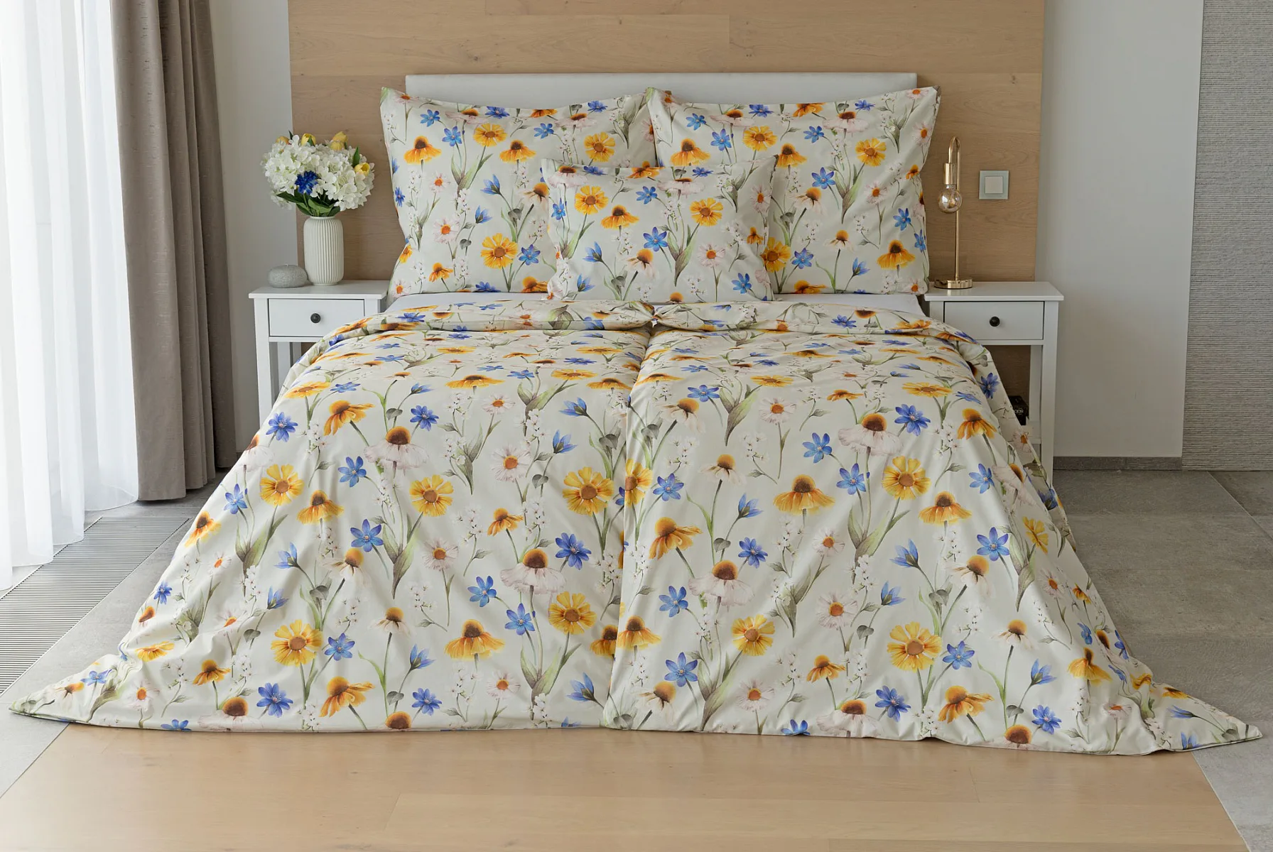 Dopřejte své ložnici svěží nádech s bavlněným povlečením Zaria. Směsice lučního kvítí v odstínech žluté, oranžové a fialovomodré barvy vyniká na decentním podkladu v tlumeném zeleném tónu. Díky nejmodernějšímu digitálnímu tisku vyniká vzor v precizním detailu.