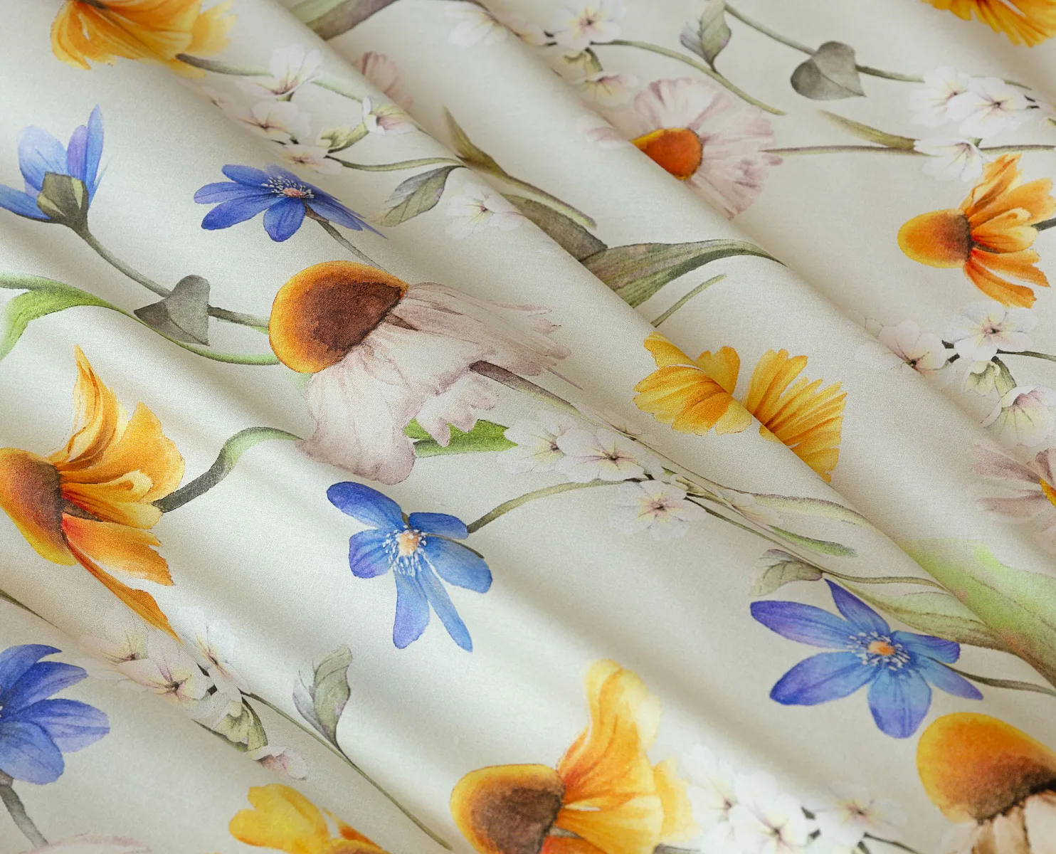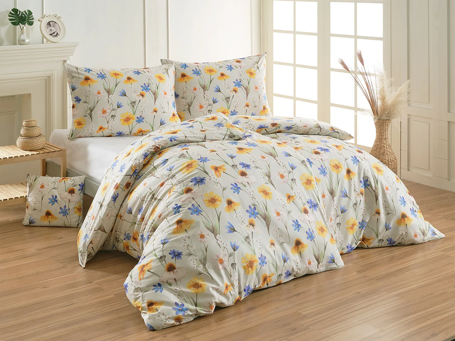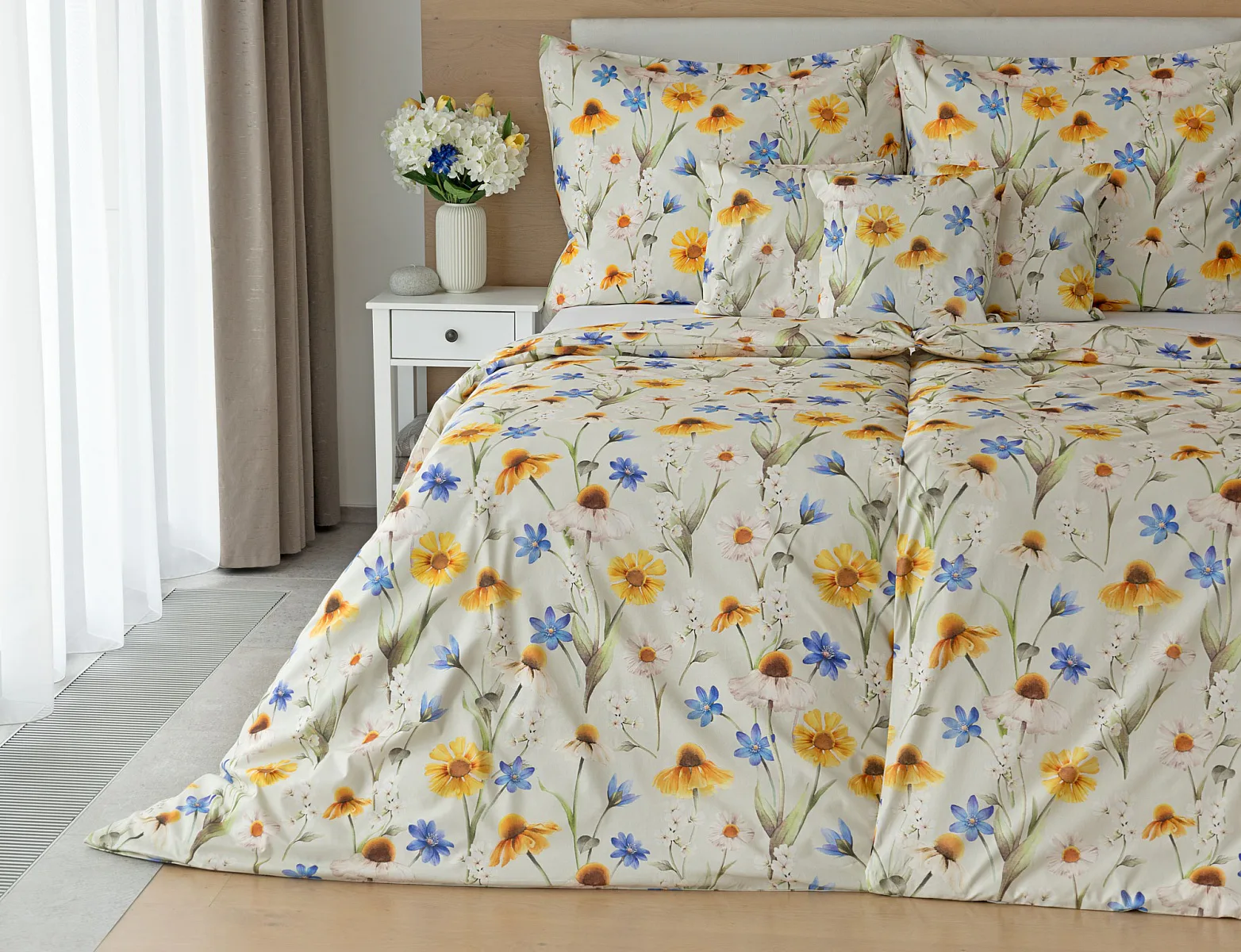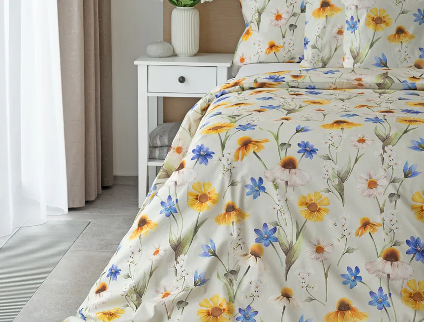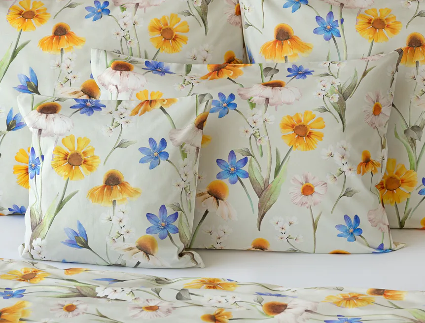 Dopřejte své ložnici svěží nádech s bavlněným povlečením Zaria. Směsice lučního kvítí v odstínech žluté, oranžové a fialovomodré barvy vyniká na decentním podkladu v tlumeném zeleném tónu. Díky nejmodernějšímu digitálnímu tisku vyniká vzor v precizním detailu.