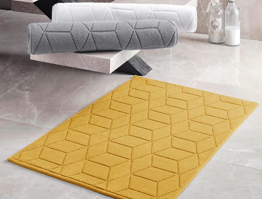 Nepostradatelný doplněk každé koupelny v provedení výběrové bavlny s vysokou gramáží, která zajistí nezaměnitelný komfort. Jednoduchý vytkávaný geometrický vzor na koupelnové předložce v kombinaci s dokonalým odstínem medově žluté barvy zútulní vaši koupelnu.