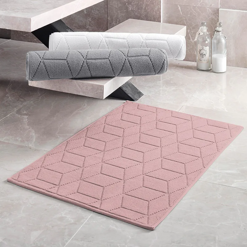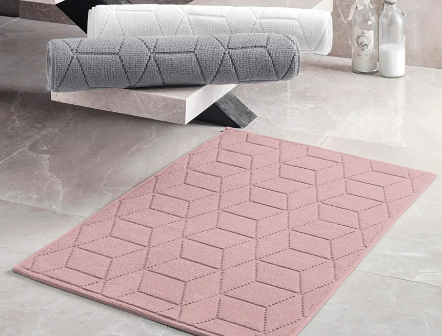 Nepostradatelný doplněk každé koupelny v provedení výběrové bavlny s vysokou gramáží, která zajistí nezaměnitelný komfort. Jednoduchý vytkávaný geometrický vzor na koupelnové předložce v kombinaci s půvabným odstínem pudrové barvy s lehkými růžovo fialovými tóny zútulní vaši koupelnu.