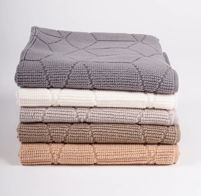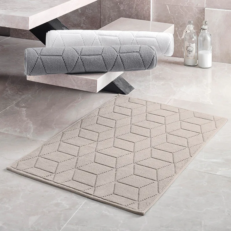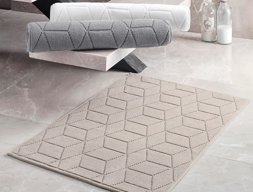 Nepostradatelný doplněk každé koupelny v provedení výběrové bavlny o vysoké gramáži, která zajistí nezaměnitelný komfort. Jednoduchý vytkávaný geometrický vzor na koupelnové předložce v kombinaci s decentním odstínem světle béžové barvy s lehkými šedými podtóny zútulní vaši koupelnu.
