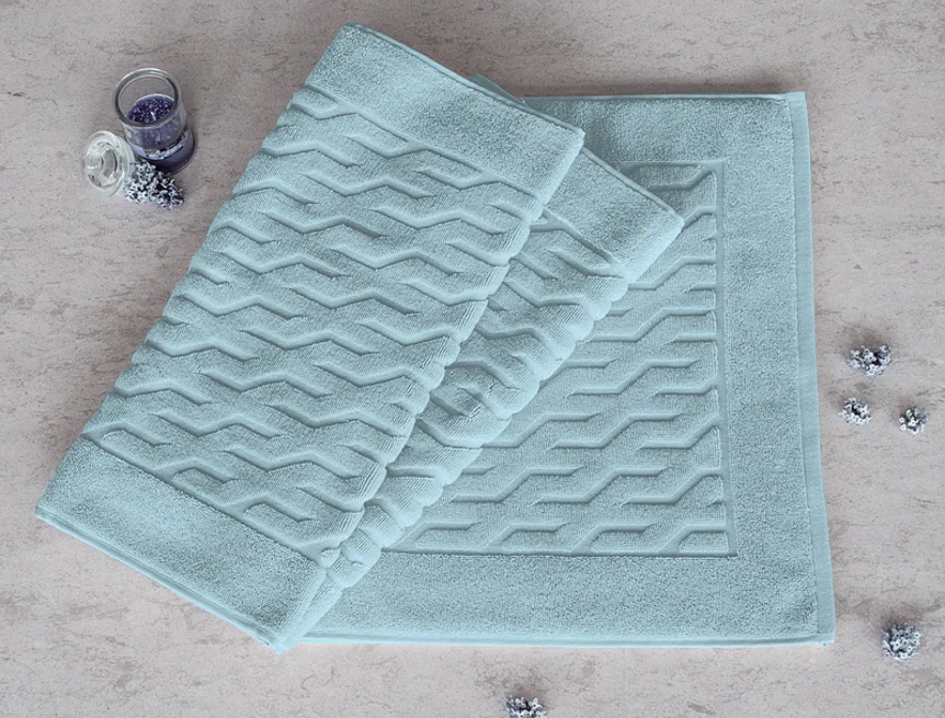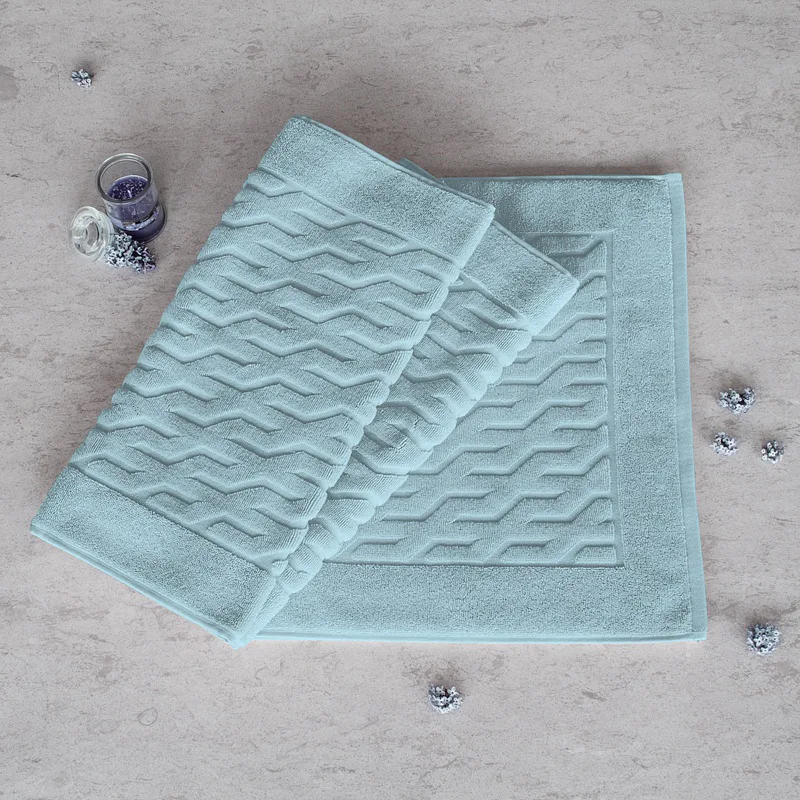 Nepostradatelný doplněk každé koupelny v provedení výběrové bavlny o vysoké gramáži, která zajistí nezaměnitelný komfort. Jednoduchý geometrický vzor na koupelnové předložce v kombinaci s dokonalým odstínem šedomodré pastelové barvy zútulní vaši koupelnu.