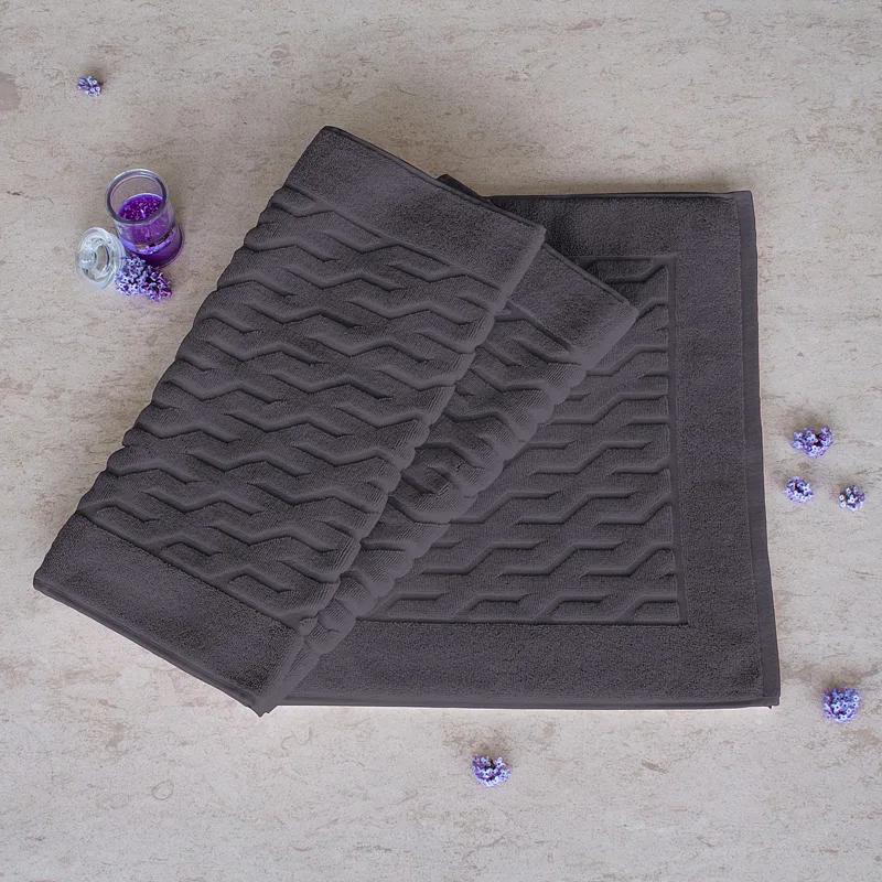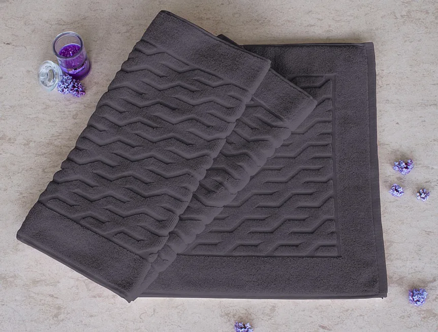 Nepostradatelný doplněk každé koupelny v provedení výběrové bavlny o vysoké gramáži, která zajistí nezaměnitelný komfort. Jednoduchý geometrický vzor na koupelnové předložce v kombinaci s dokonalým odstínem šedofialové kovové barvy zútulní Vaši koupelnu.