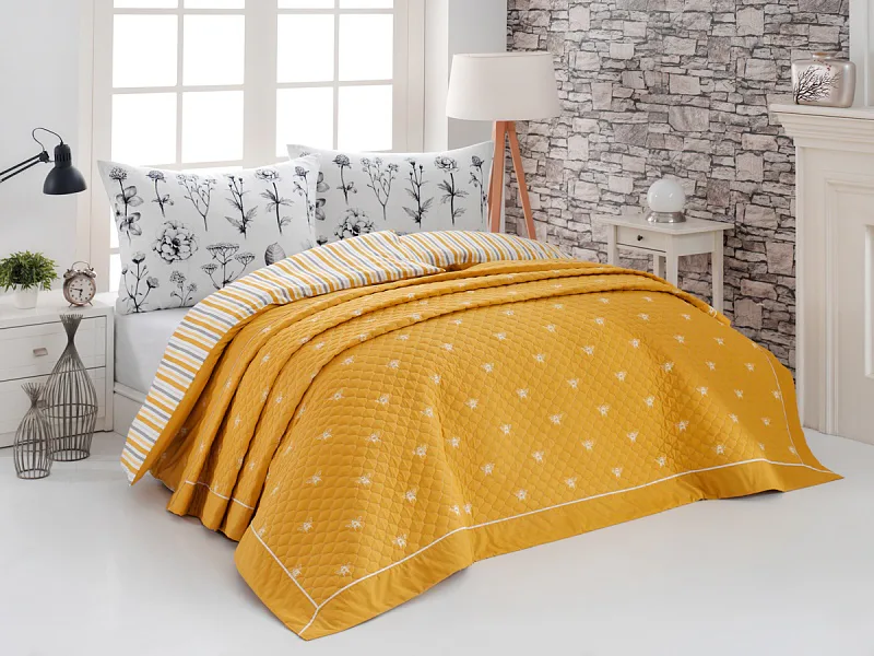 Barevné provedení: kombinace medově žluté, světle žluté, světle šedé a bílé, vrchní strana přehozu odpovídá fotografii, spodní je v provedení proužků, přehoz je doplněný o barevně sladěnou paspuli
