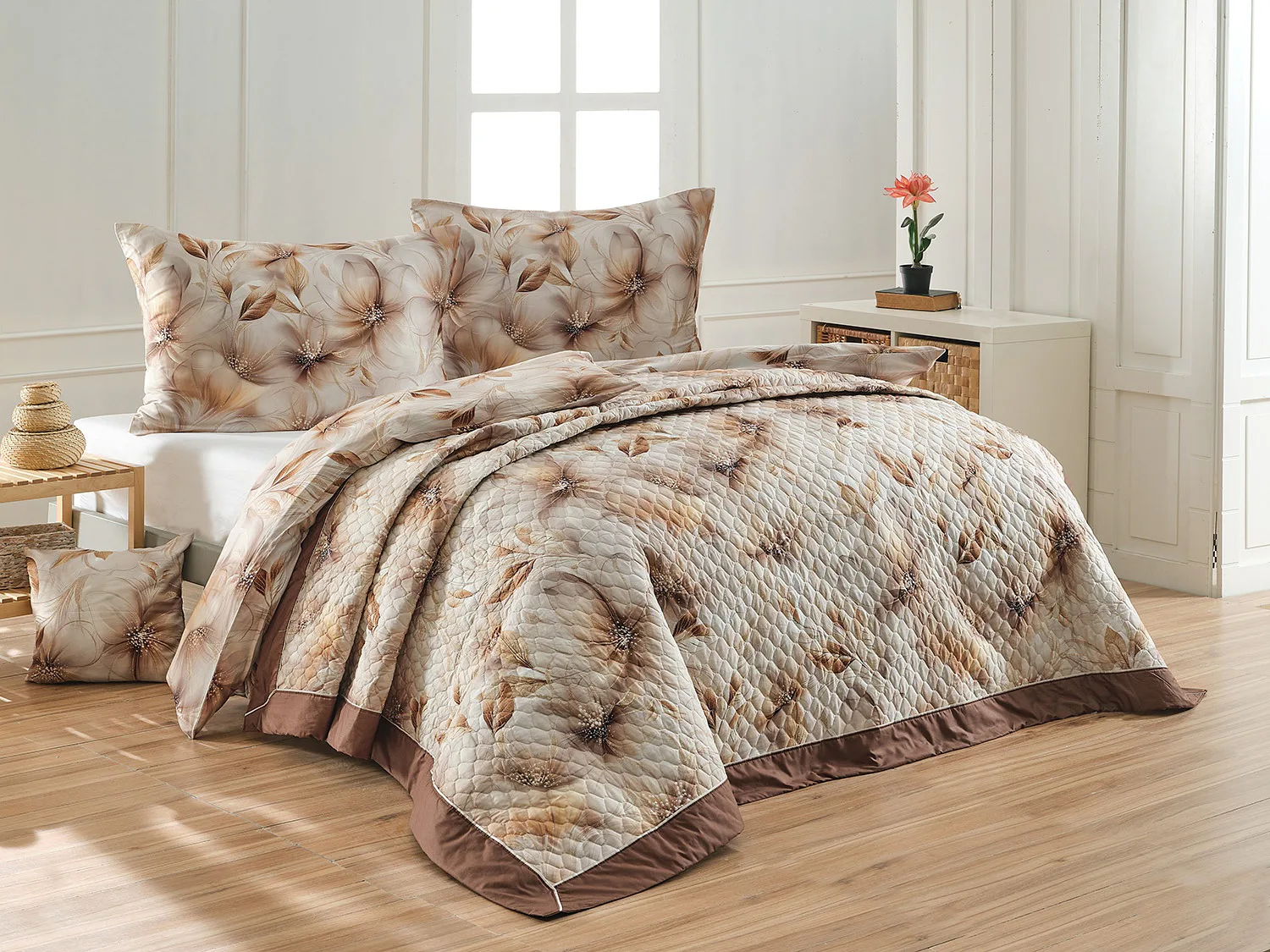 Barevné provedení: Elegantní florální motiv v hřejivé paletě béžových a hnědých tónů, který je z obou stran přehozu stejný. Okraje zdobí hnědé lemování doplněné na vrchní straně paspulí v přírodní béžové barvě.