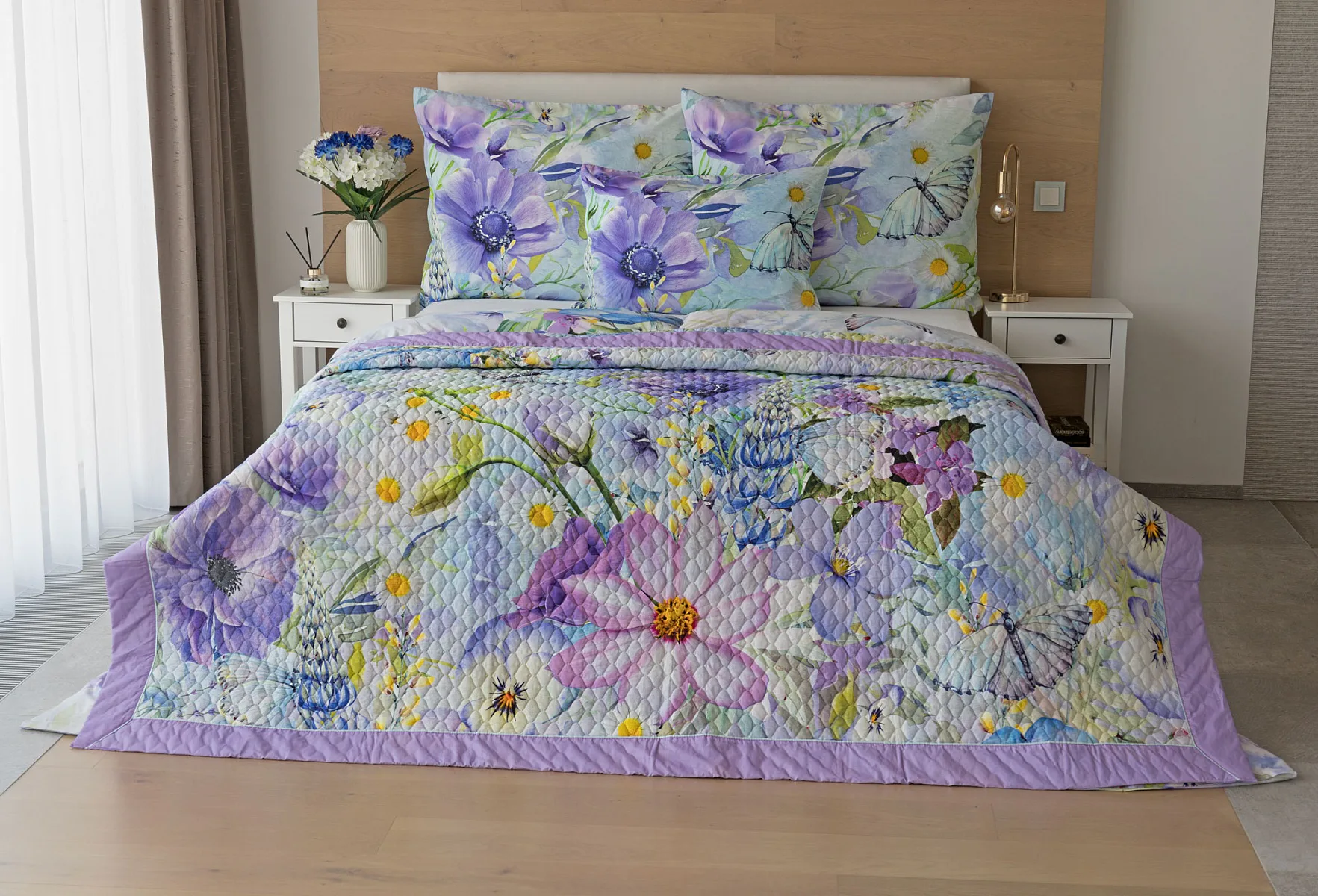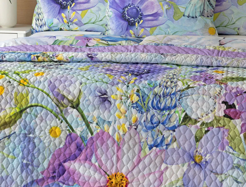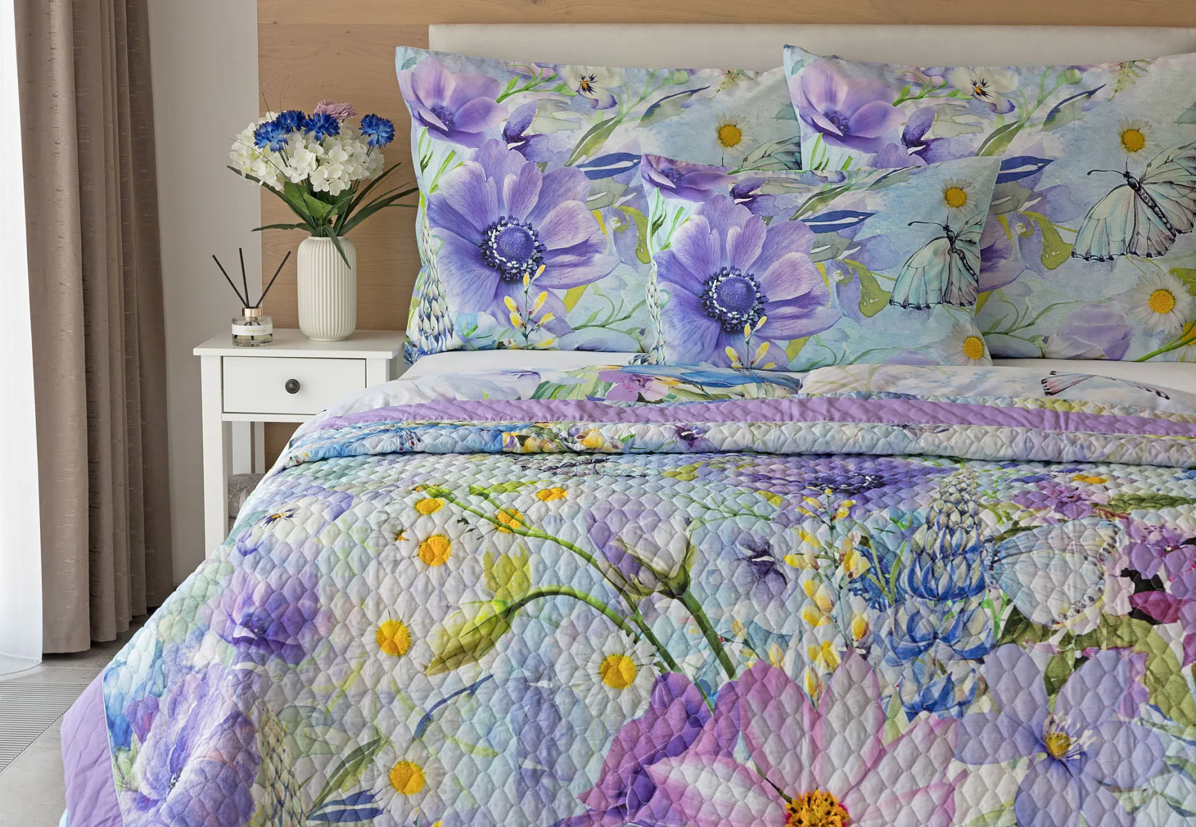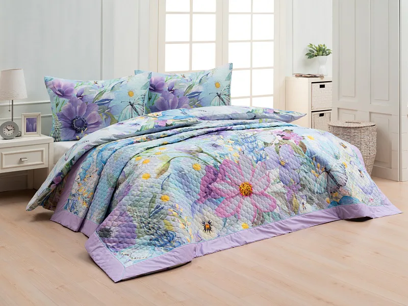 Barevné provedení: Impozantní květinový vzor, který je z obou stran přehozu stejný. Okraje zdobí pastelově fialové lemování doplněné na vrchní straně světle modrou paspulí.