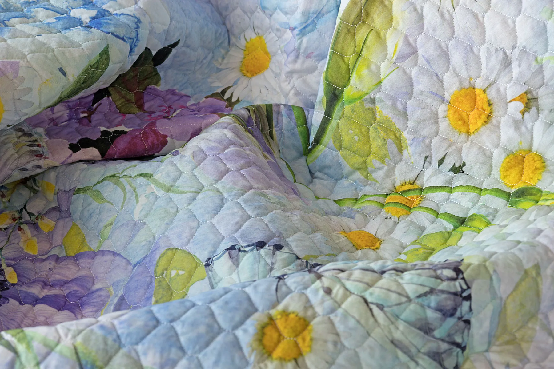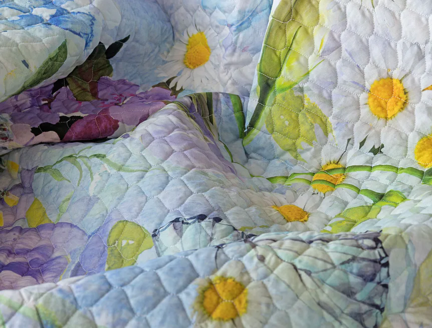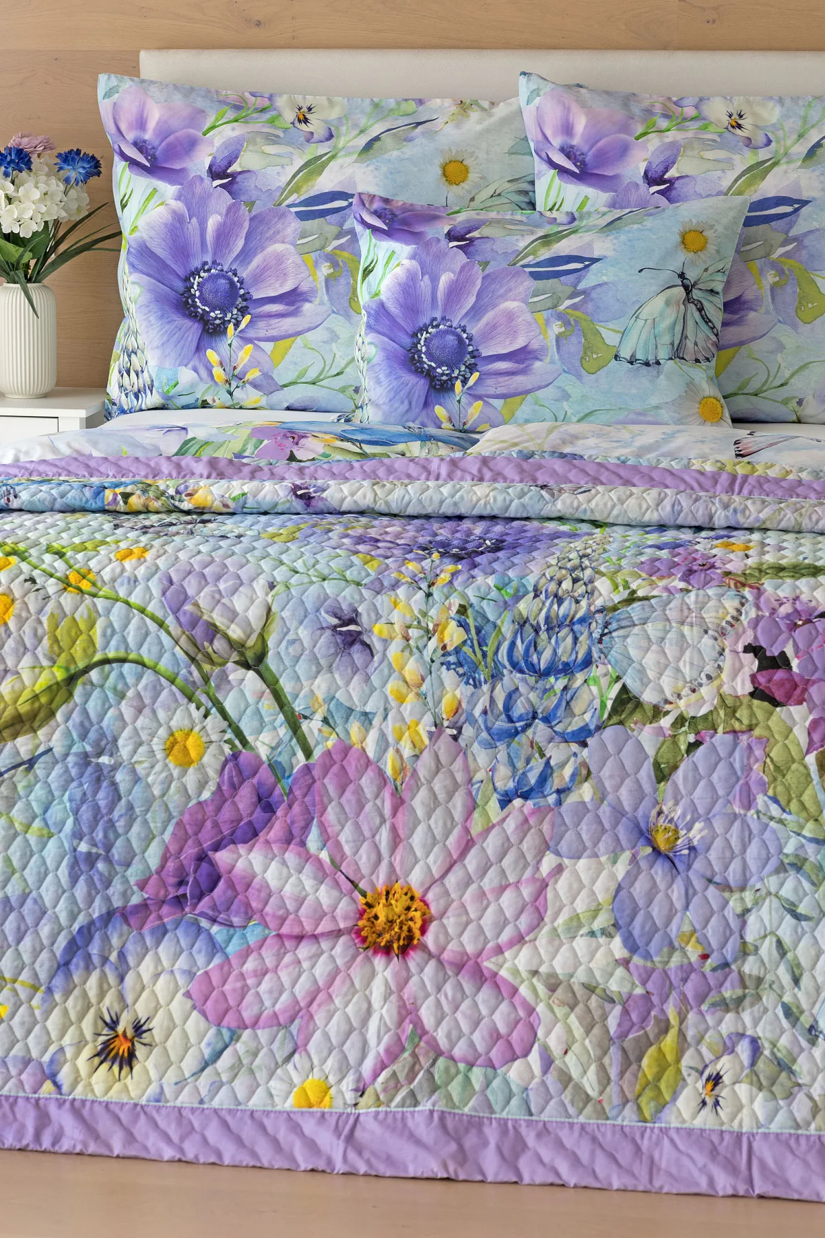 Barevné provedení: Impozantní květinový vzor, který je z obou stran přehozu stejný. Okraje zdobí pastelově fialové lemování doplněné na vrchní straně světle modrou paspulí.