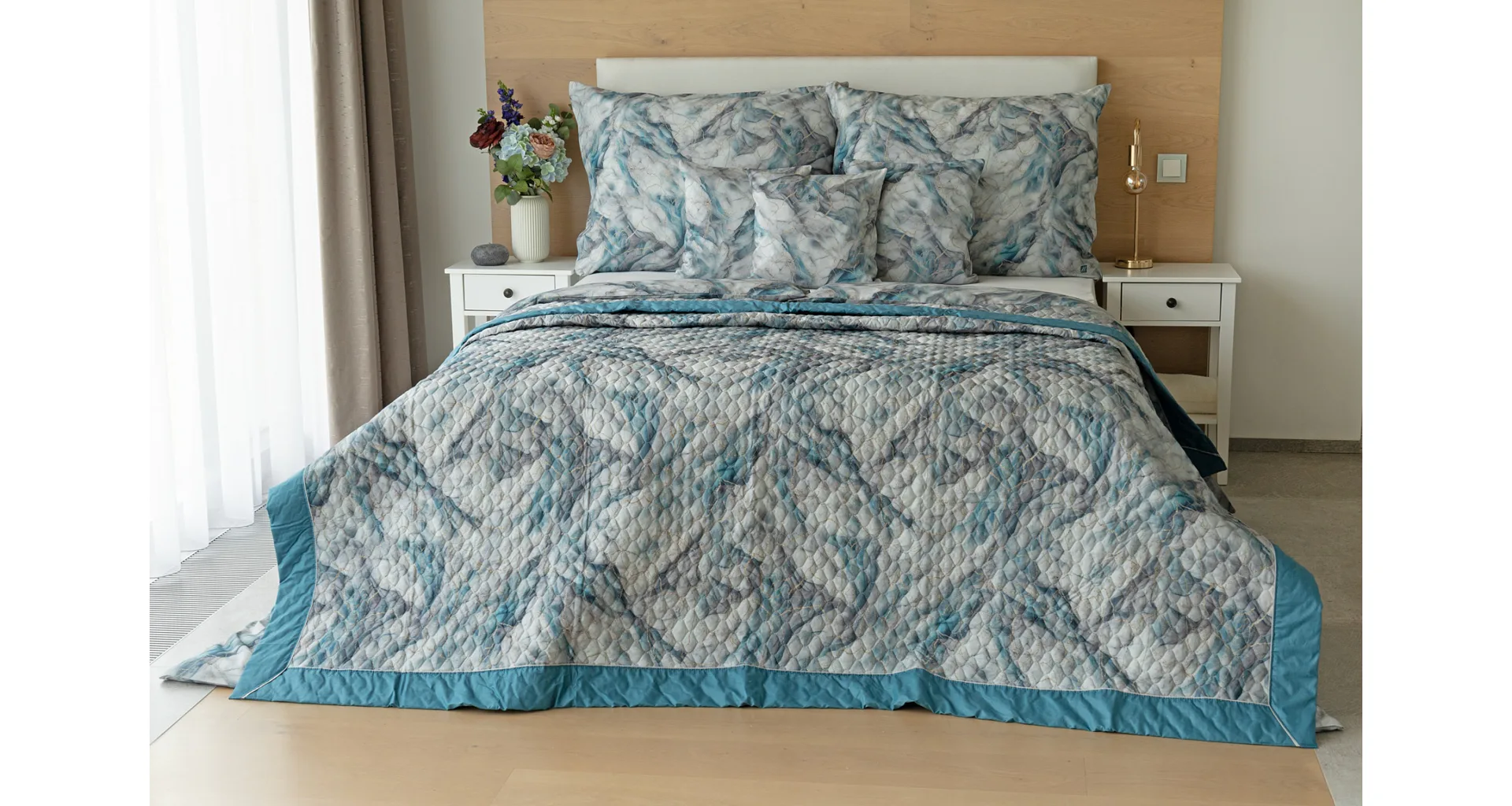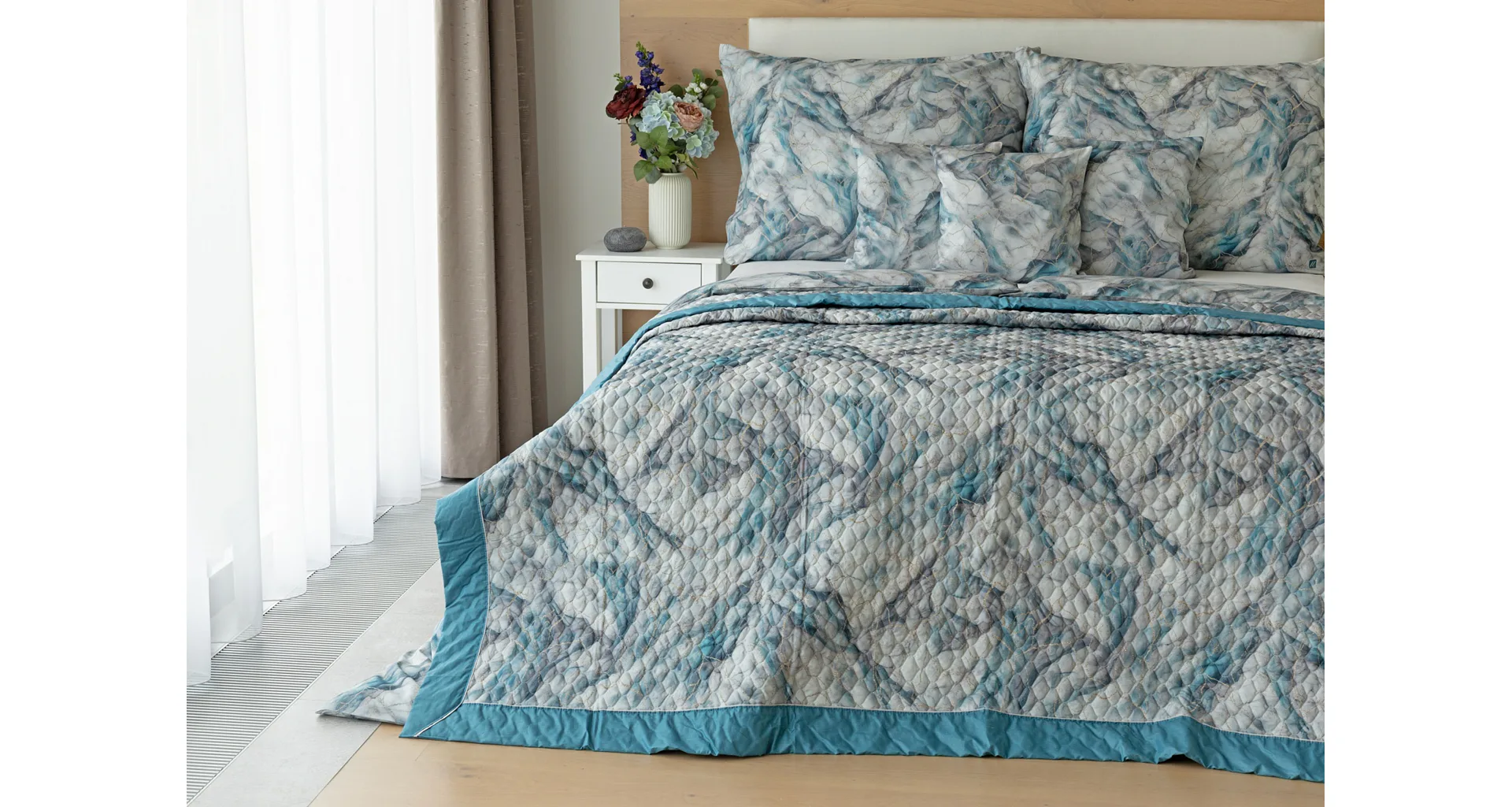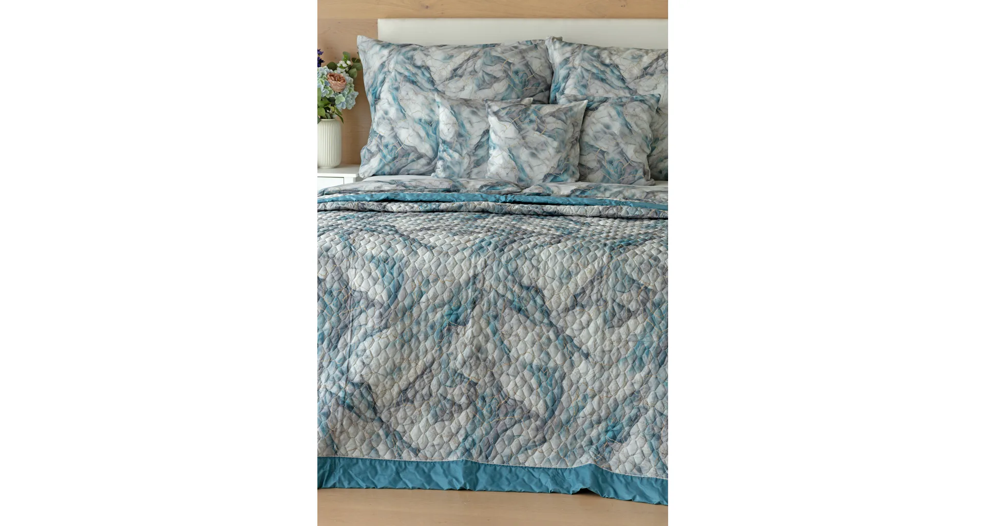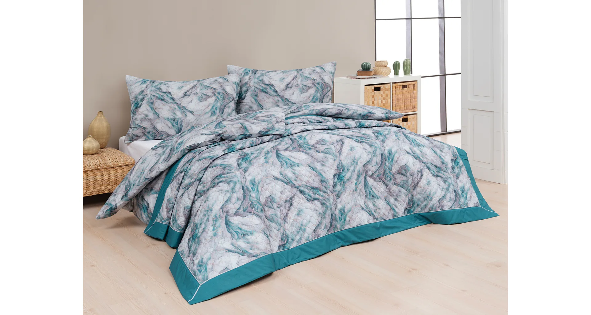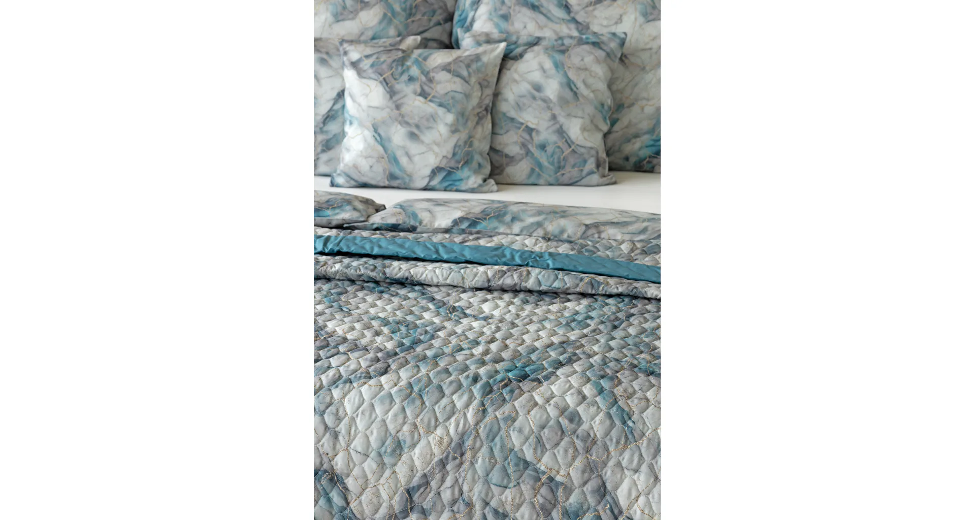 Barevné provedení: Elegantní mramorový vzor, který je z obou stran přehozu stejný. Okraje zdobí petrolejové lemování doplněné na vrchní straně světle šedou paspulí.