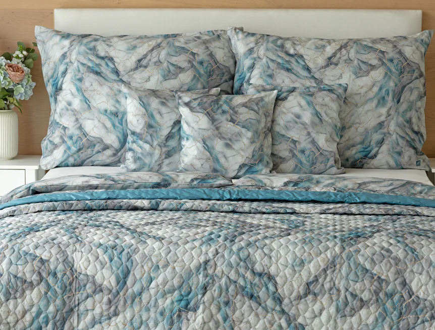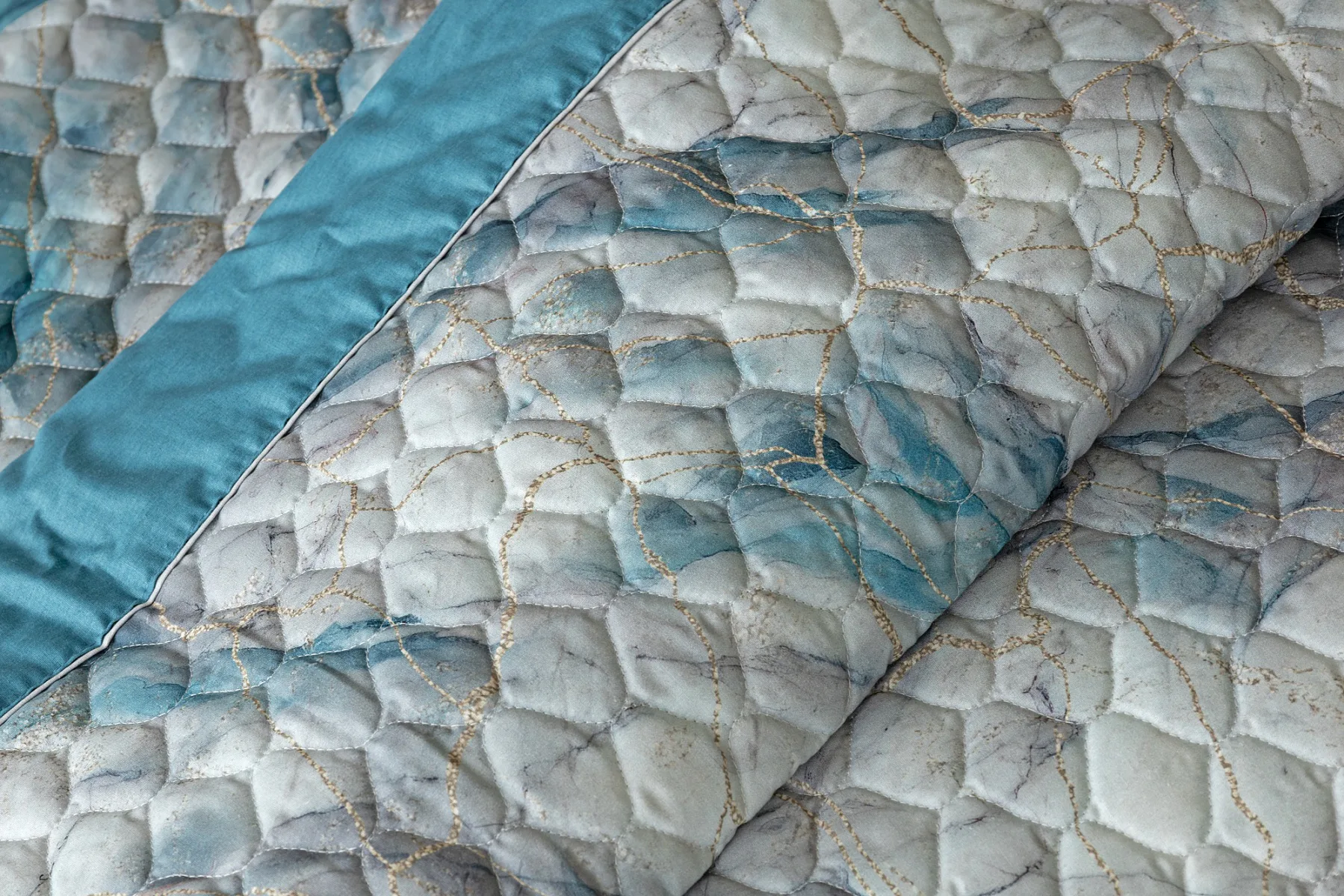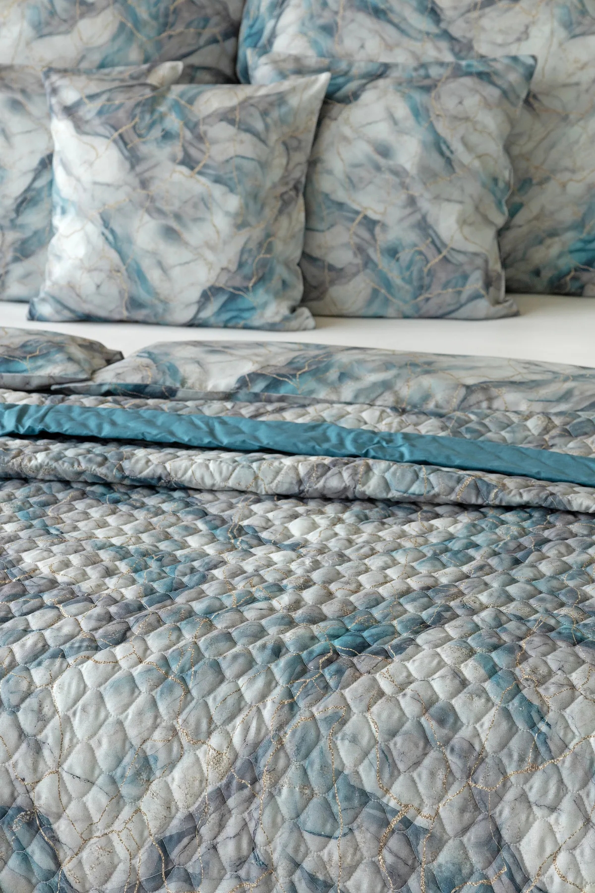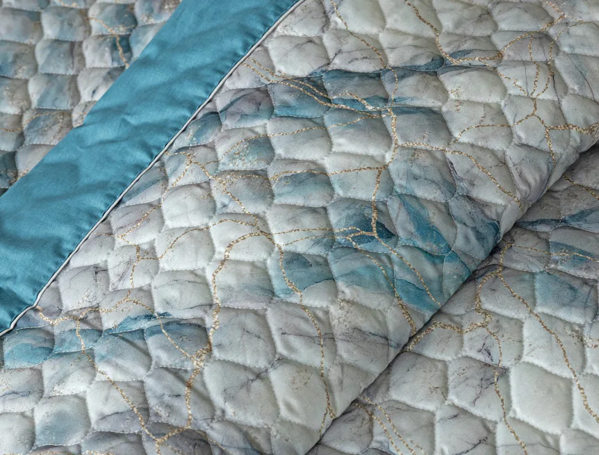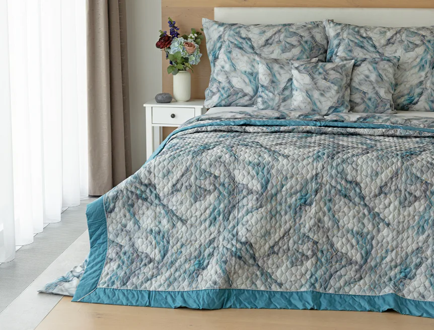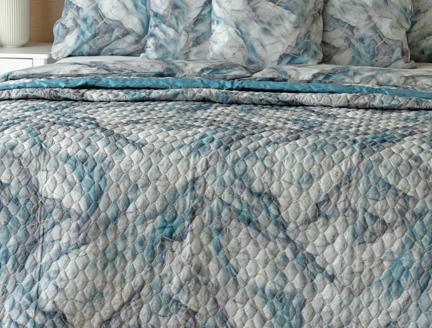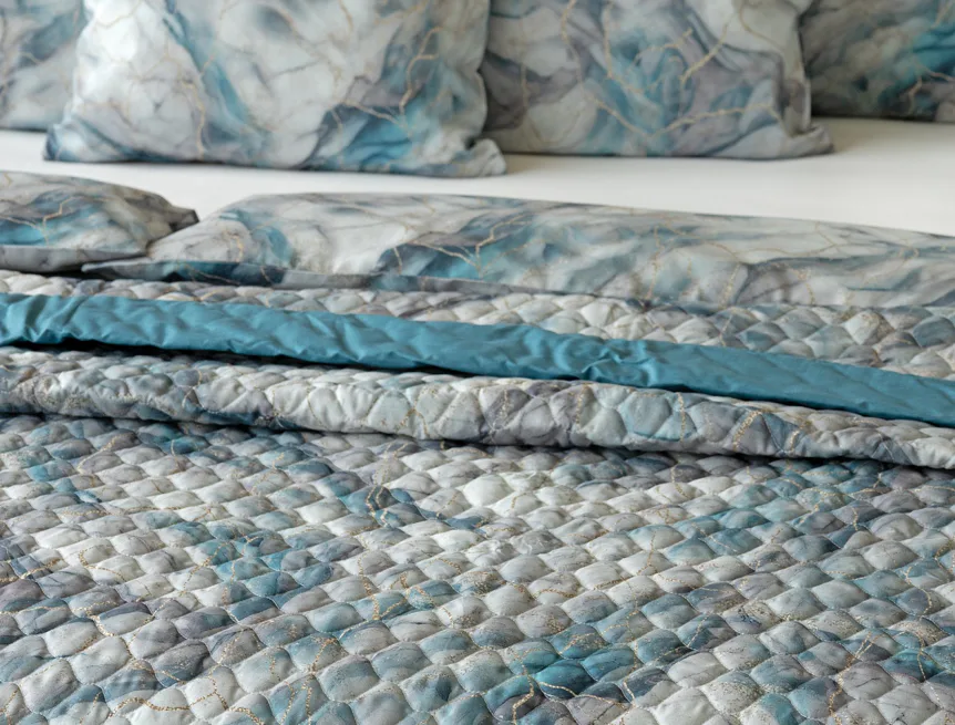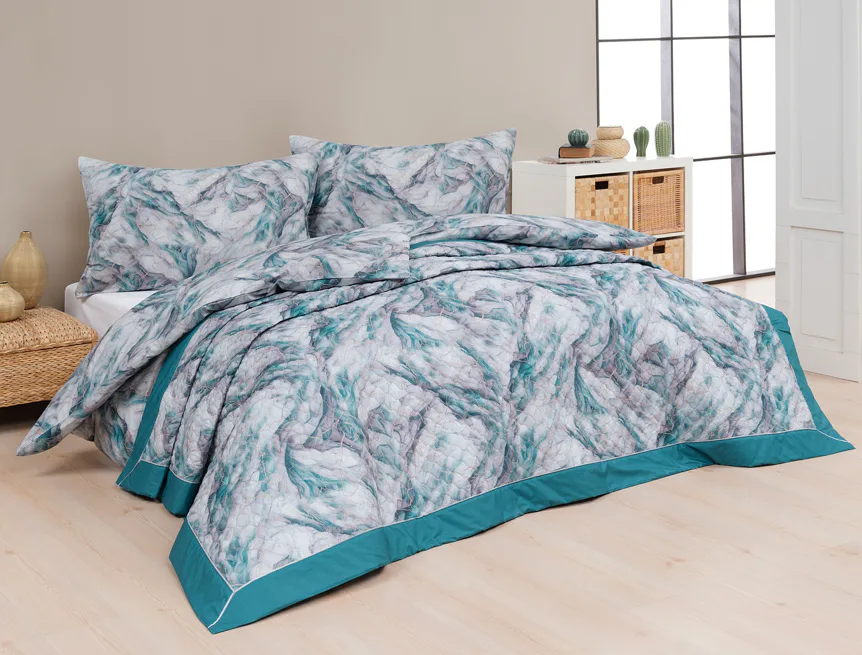 Barevné provedení: Elegantní mramorový vzor, který je z obou stran přehozu stejný. Okraje zdobí petrolejové lemování doplněné na vrchní straně světle šedou paspulí.