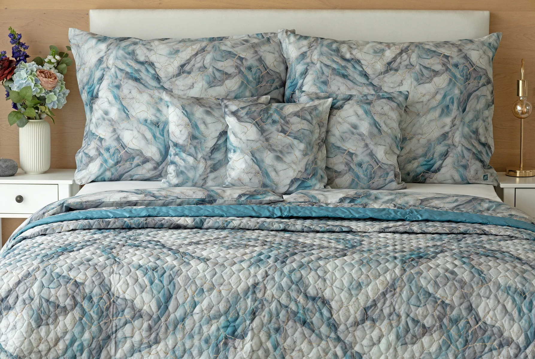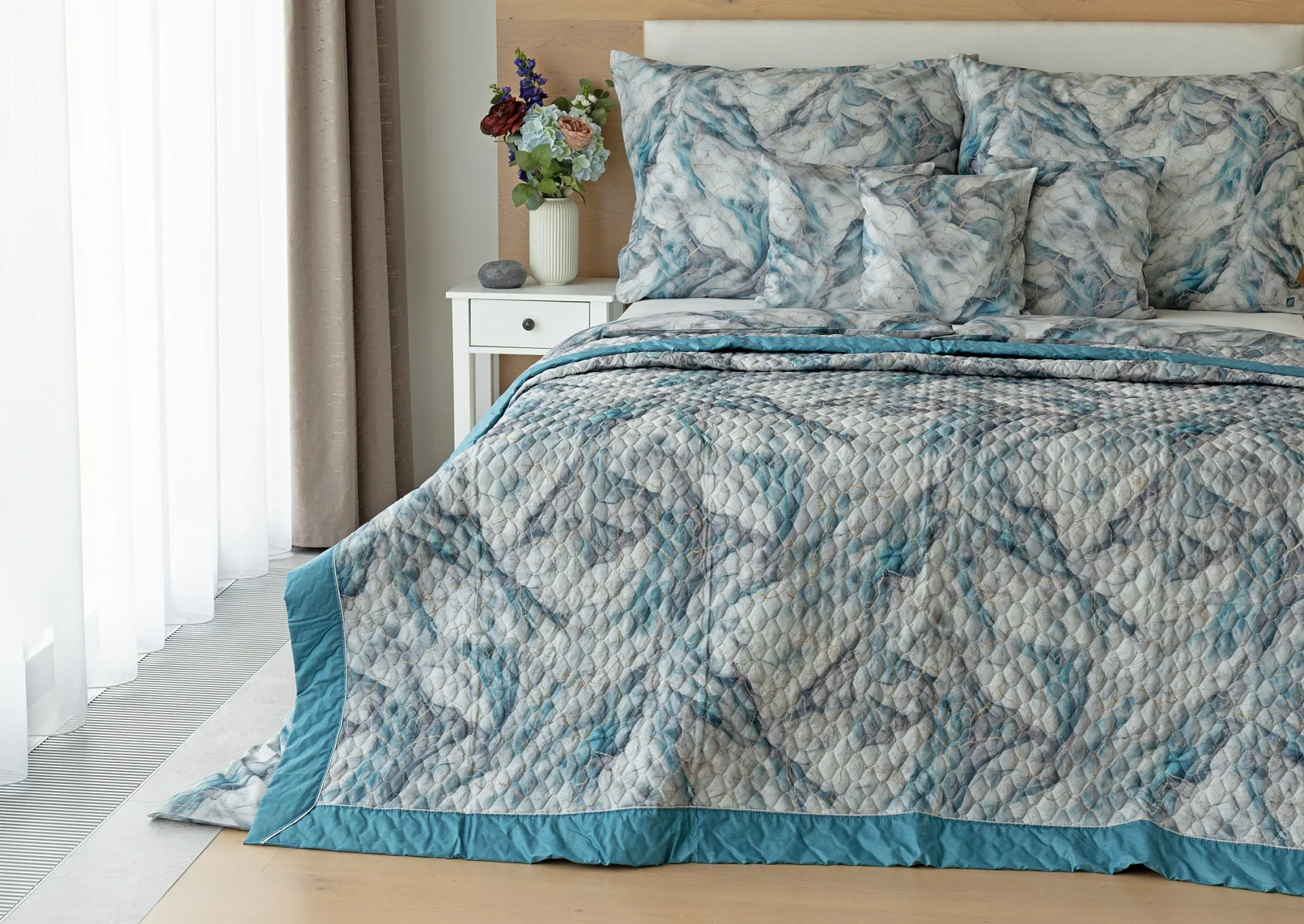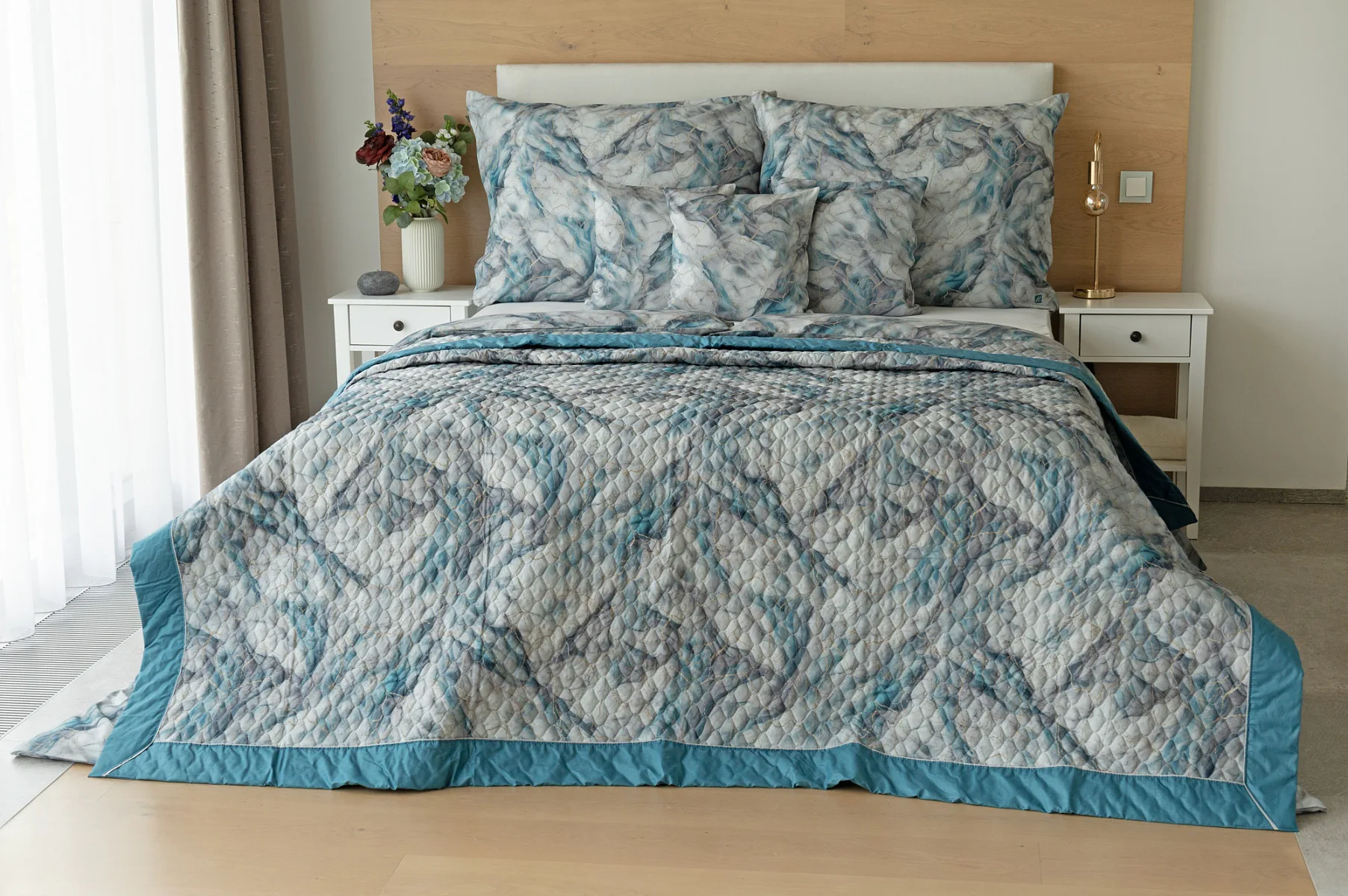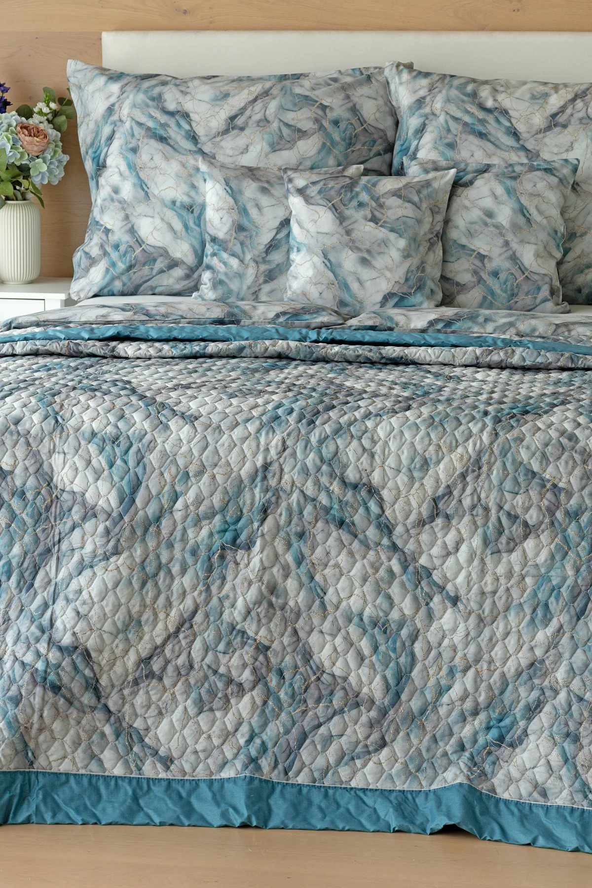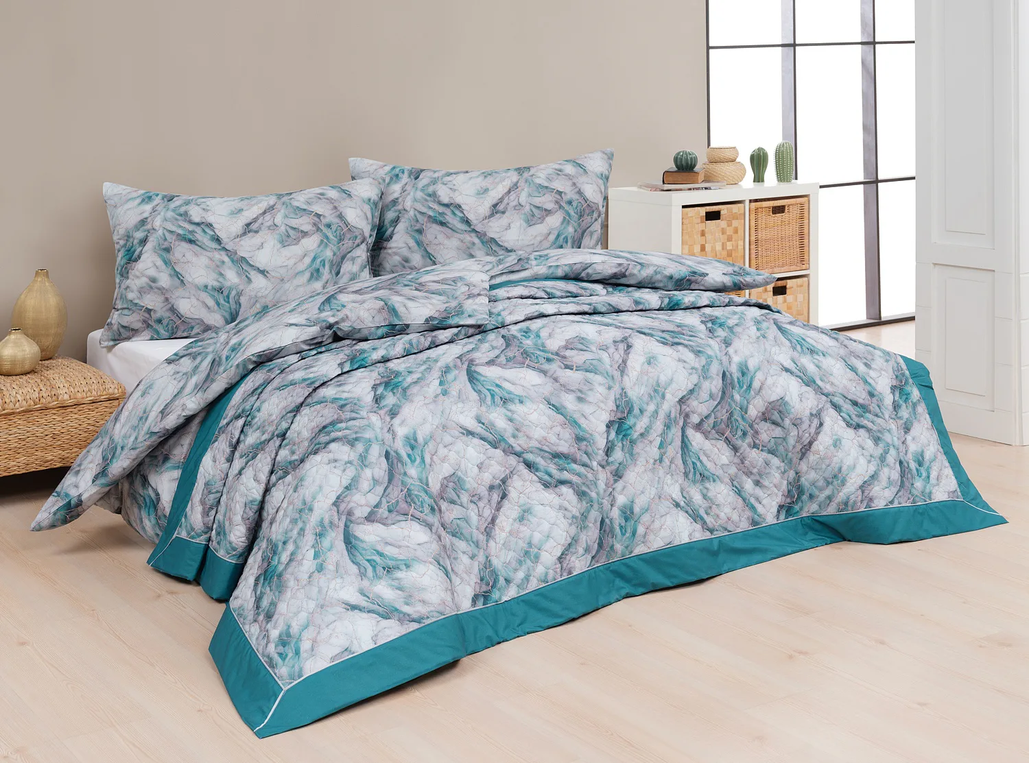 Barevné provedení: Elegantní mramorový vzor, který je z obou stran přehozu stejný. Okraje zdobí petrolejové lemování doplněné na vrchní straně světle šedou paspulí.