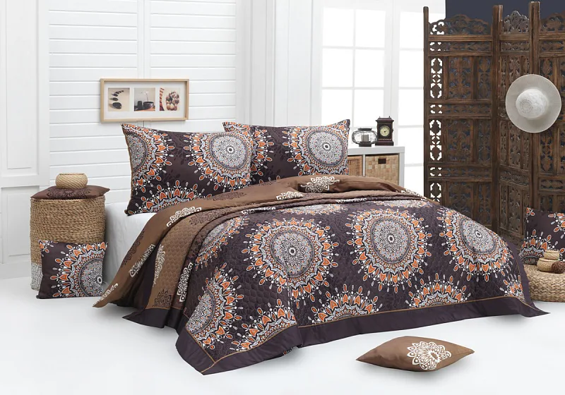 Přehoz CARAMEL je okouzlující a praktický doplněk, se kterým bude Vaše postel vždy dokonale ustlaná. Jako výplň je použito vrstvené duté vlákno. Barevné provedení odpovídá vzoru na povlečení, obě strany přehozu jsou stejné. Povrchový materiál je 100% bavlněná látka, přehoz je navíc doplněný o barevně sladěnou paspuli. Po celé ploše je aplikováno ozdobné prošití, aby se zajistila stabilita výplně a současně podtrhl celkový vzhled přehozu.