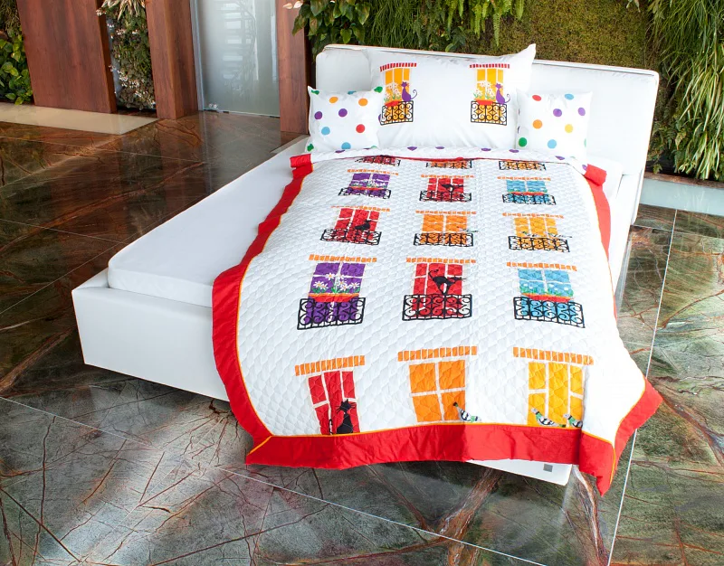 Přehoz CAT STORY je jedinečný, estetický a praktický doplněk, se kterým bude Vaše postel vždy dokonale ustlaná. Jako výplň je použito vrstvené duté vlákno, potvrchový materiál je 100 % bavlněná látka, ve stejném dezénu jako ložní povlečení. Po celé ploše je aplikováno ozdobné prošití, tak aby se zajistila stabilita výplně a současně podtrhl celkový vzhled přehozu.