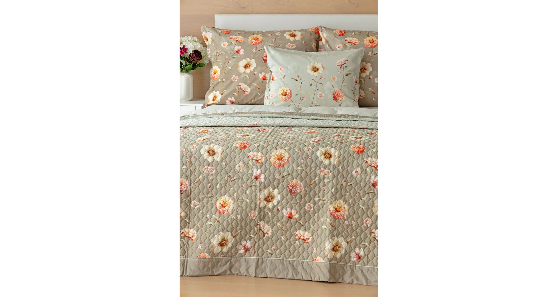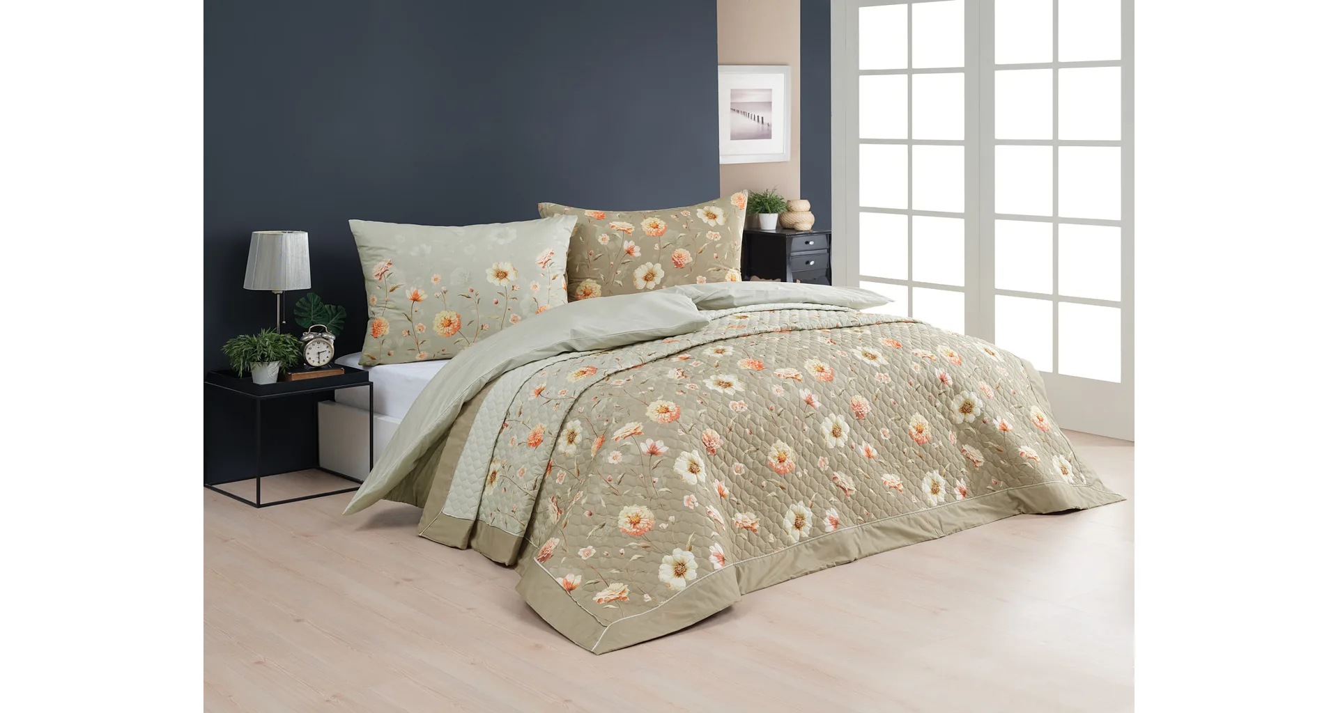 Barevné provedení: Jemný květinový vzor, který je z obou stran přehozu stejný. Okraje zdobí barevně sladěné šedozelené lemování doplněné na vrchní straně světlounce šedou paspulí.