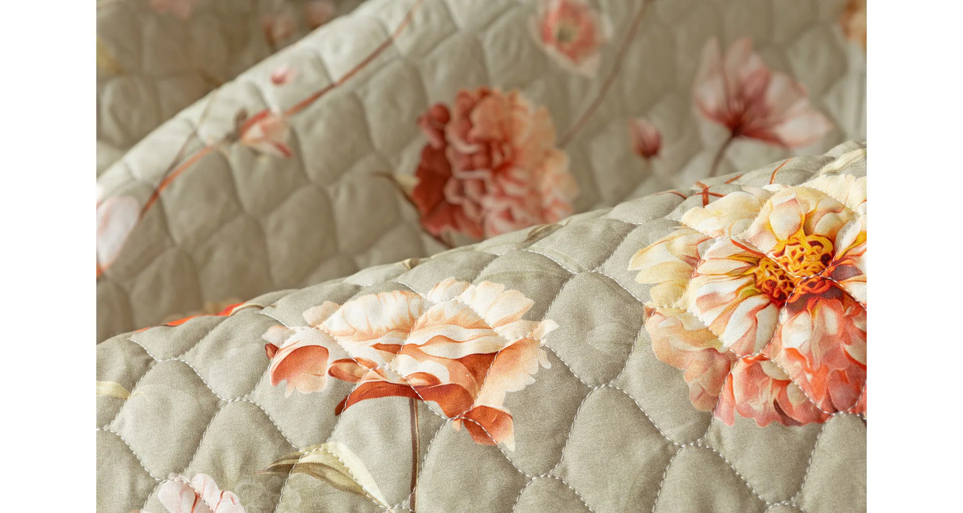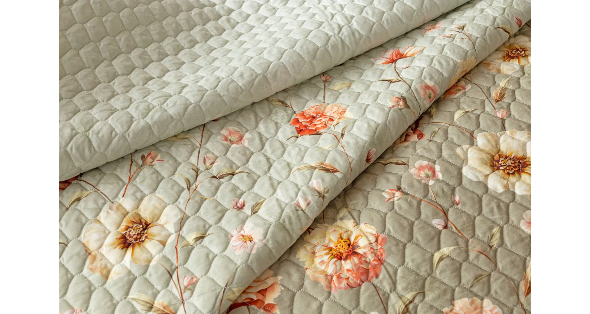 Přehoz Floral je jedinečný estetický a praktický doplněk, se kterým bude vaše postel vždy dokonale ustlaná. Jako výplň je použito vrstvené duté vlákno se sníženou gramáží. Povrchový materiál tvoří 100% bavlněná látka ve stejném dezénu jako ložní povlečení. Po celé ploše je aplikováno ozdobné prošití, aby se zajistila stabilita výplně a současně podtrhl celkový vzhled přehozu.