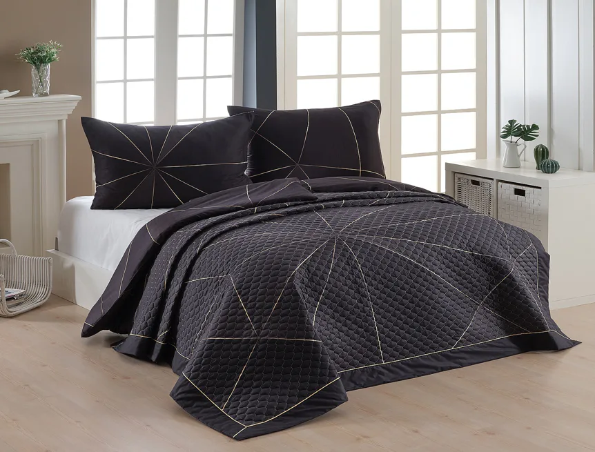 Barevné provedení: Poutavý geometrický vzor, který je z obou stran přehozu stejný. Okraje zdobí černé lemování doplněné na vrchní straně zlatavou paspulí.