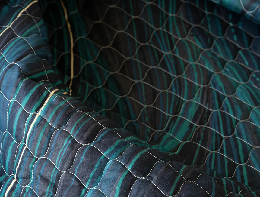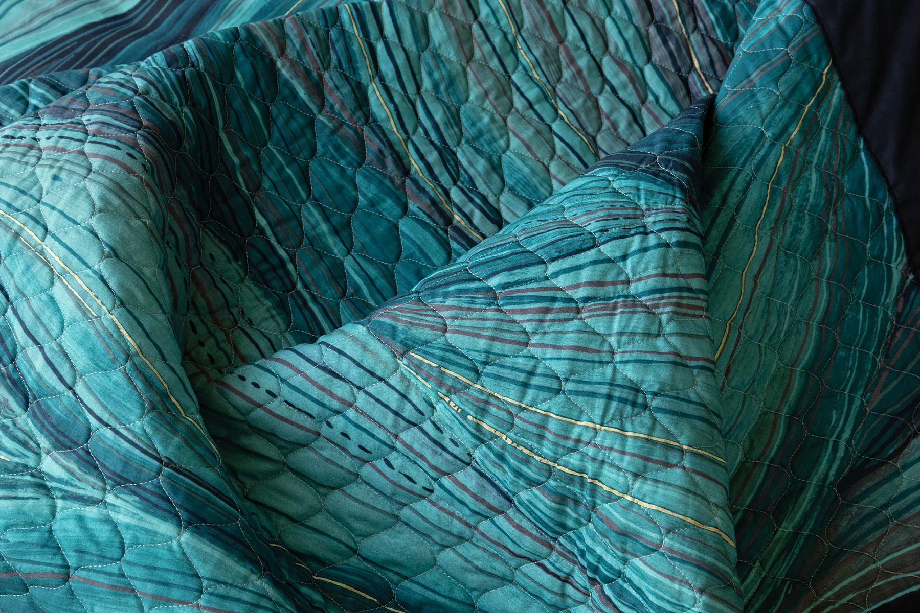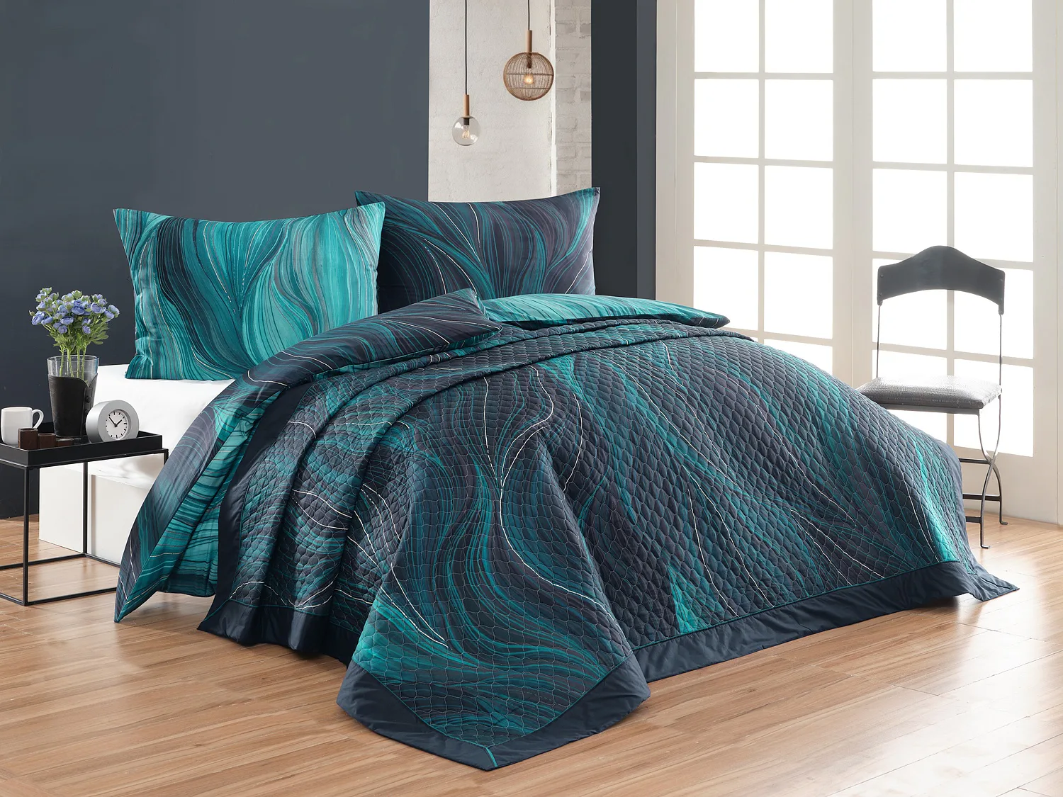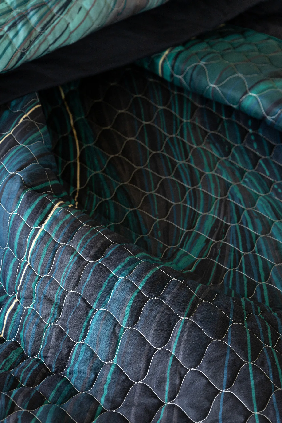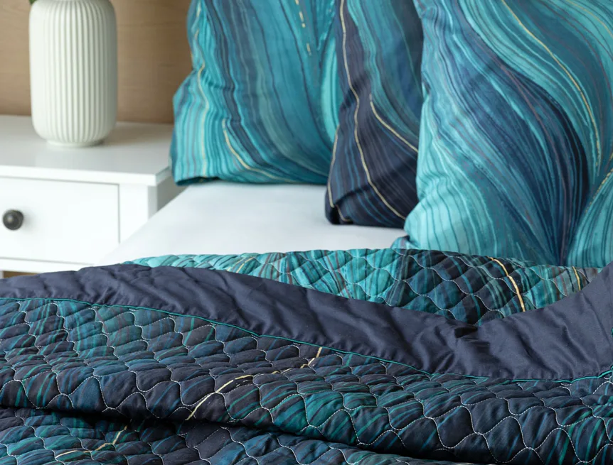 Barevné provedení: Abstraktní vzor s prvky ruční malby, který je z každé strany přehozu jinak barevný. Vrchní straně dominuje zářivá petrolejová barva, spodní strana je laděná do tmavých tónů. Okraje zdobí temně modré lemování doplněné na vrchní straně petrolejovou paspulí.
