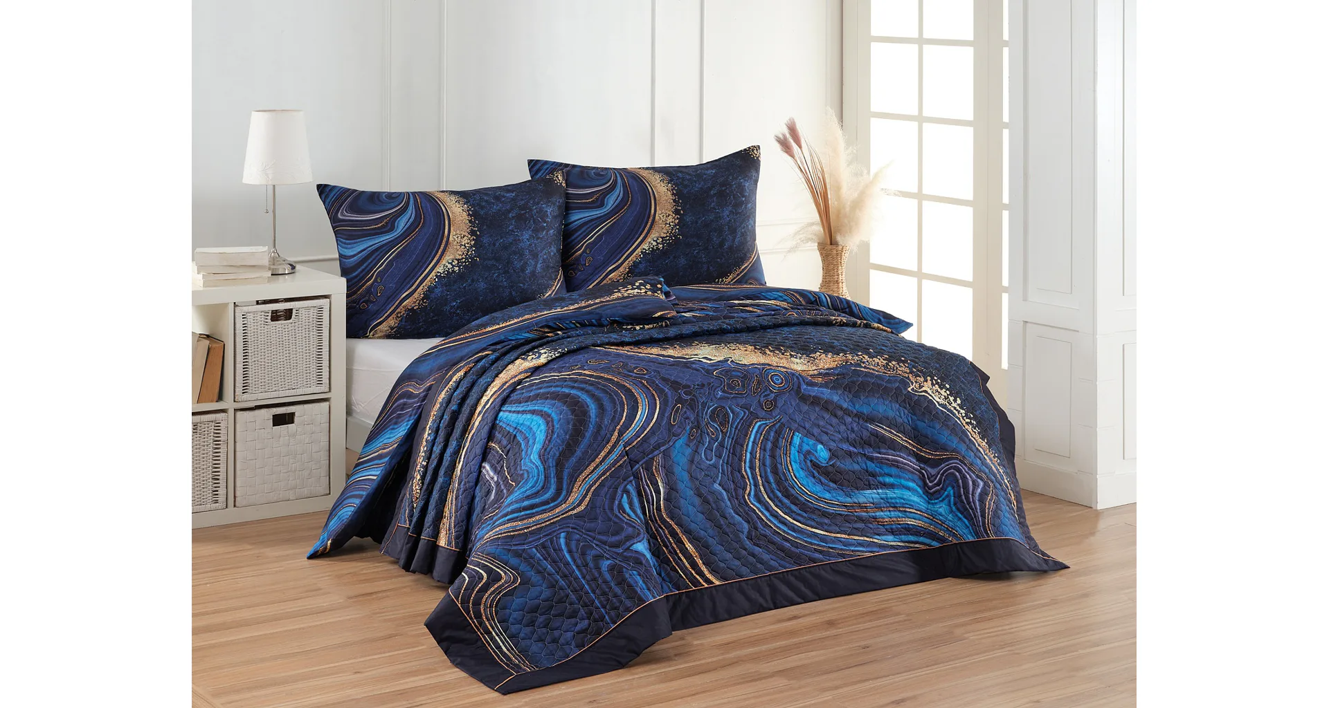Barevné provedení: Abstraktní vzor v paletě modrých tónů se zlatavými prvky, který je z obou stran přehozu stejný. Okraje zdobí temně modré lemování doplněné na vrchní straně světle hnědou paspulí.