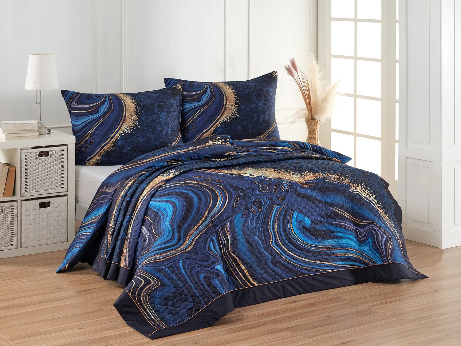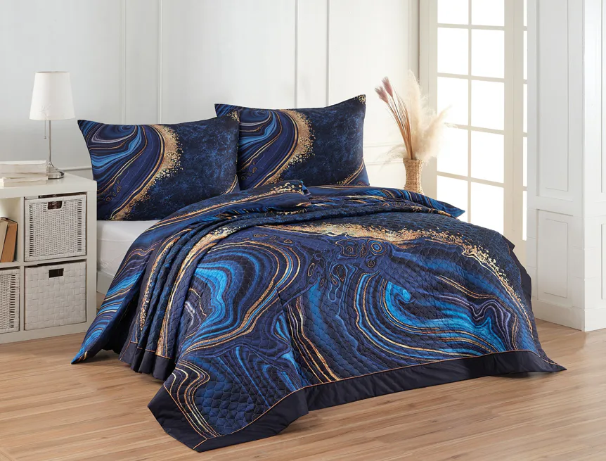 Barevné provedení: Abstraktní vzor v paletě modrých tónů se zlatavými prvky, který je z obou stran přehozu stejný. Okraje zdobí temně modré lemování doplněné na vrchní straně světle hnědou paspulí.