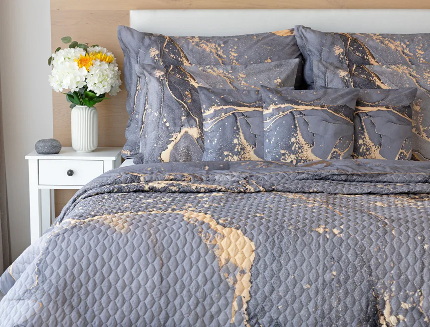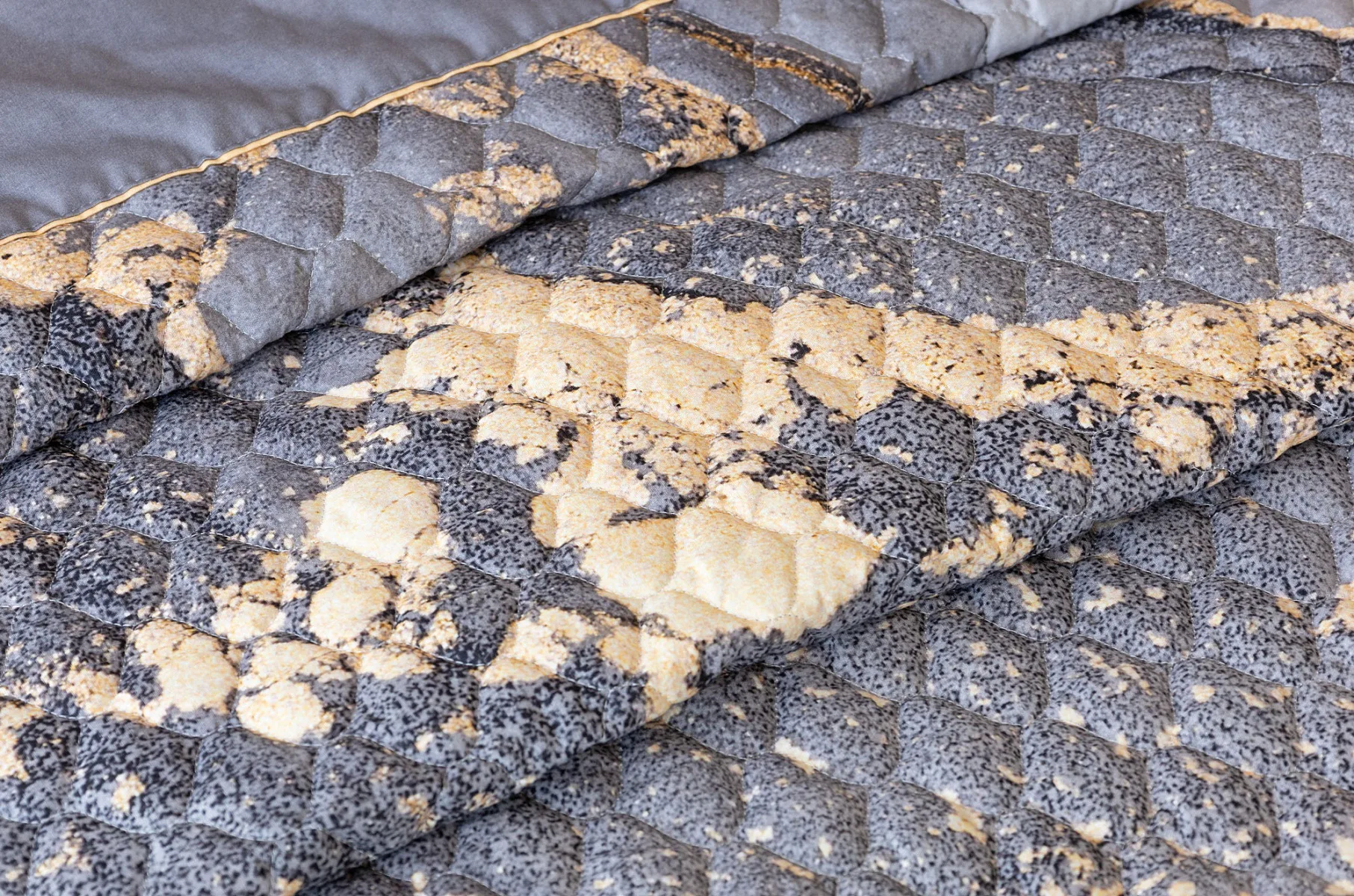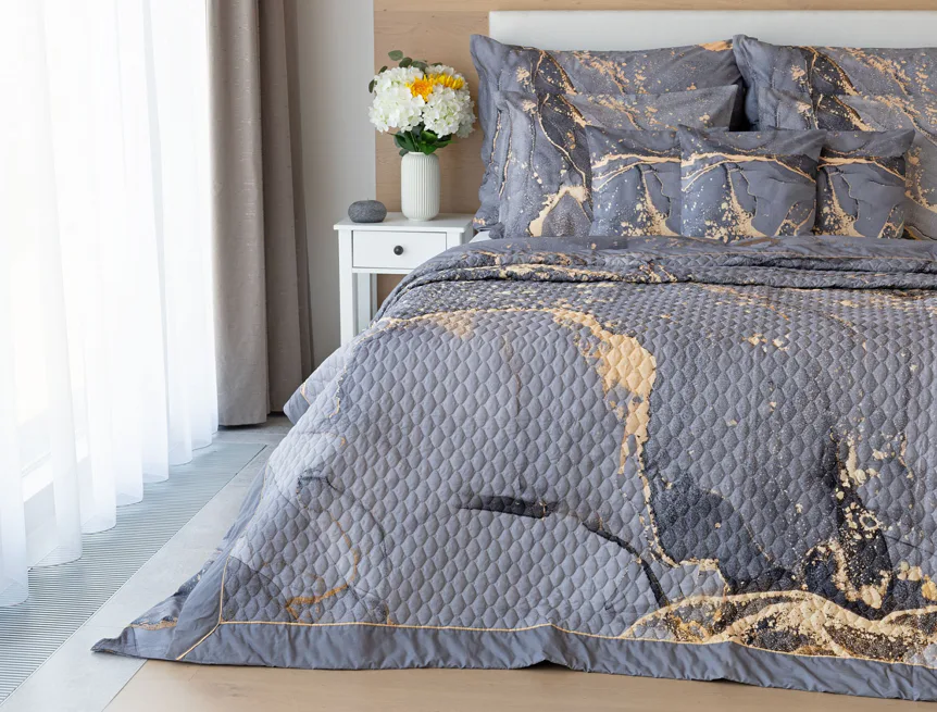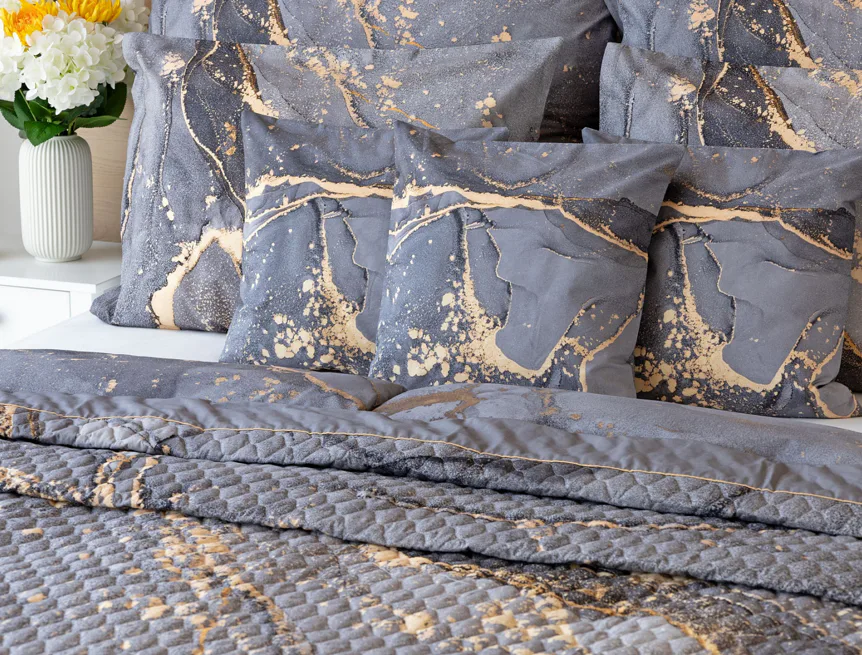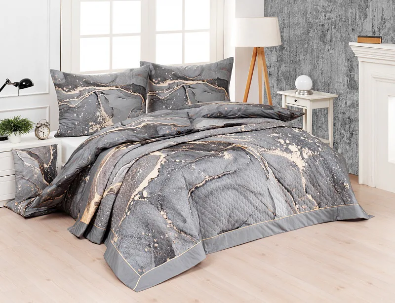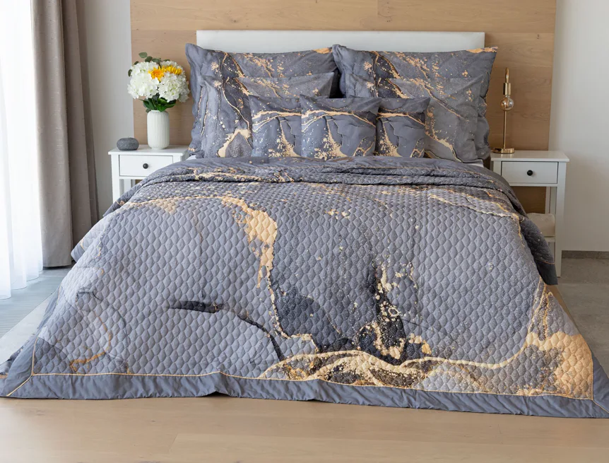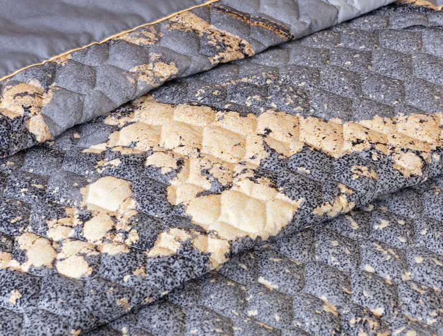 Barevné provedení: Elegantní mramorový vzor, který je z obou stran přehozu stejný. Okraje zdobí šedé lemování doplněné na vrchní straně pískově žlutou paspulí.