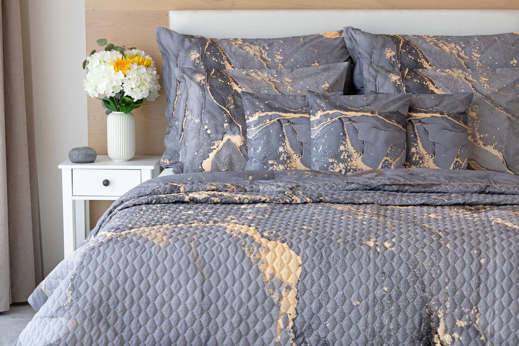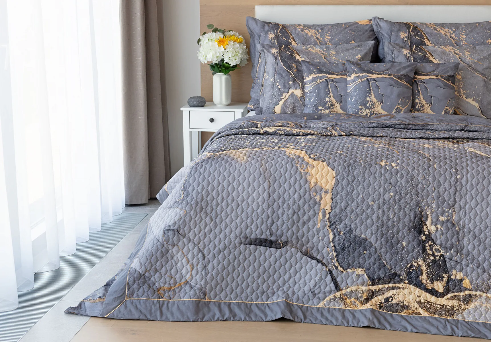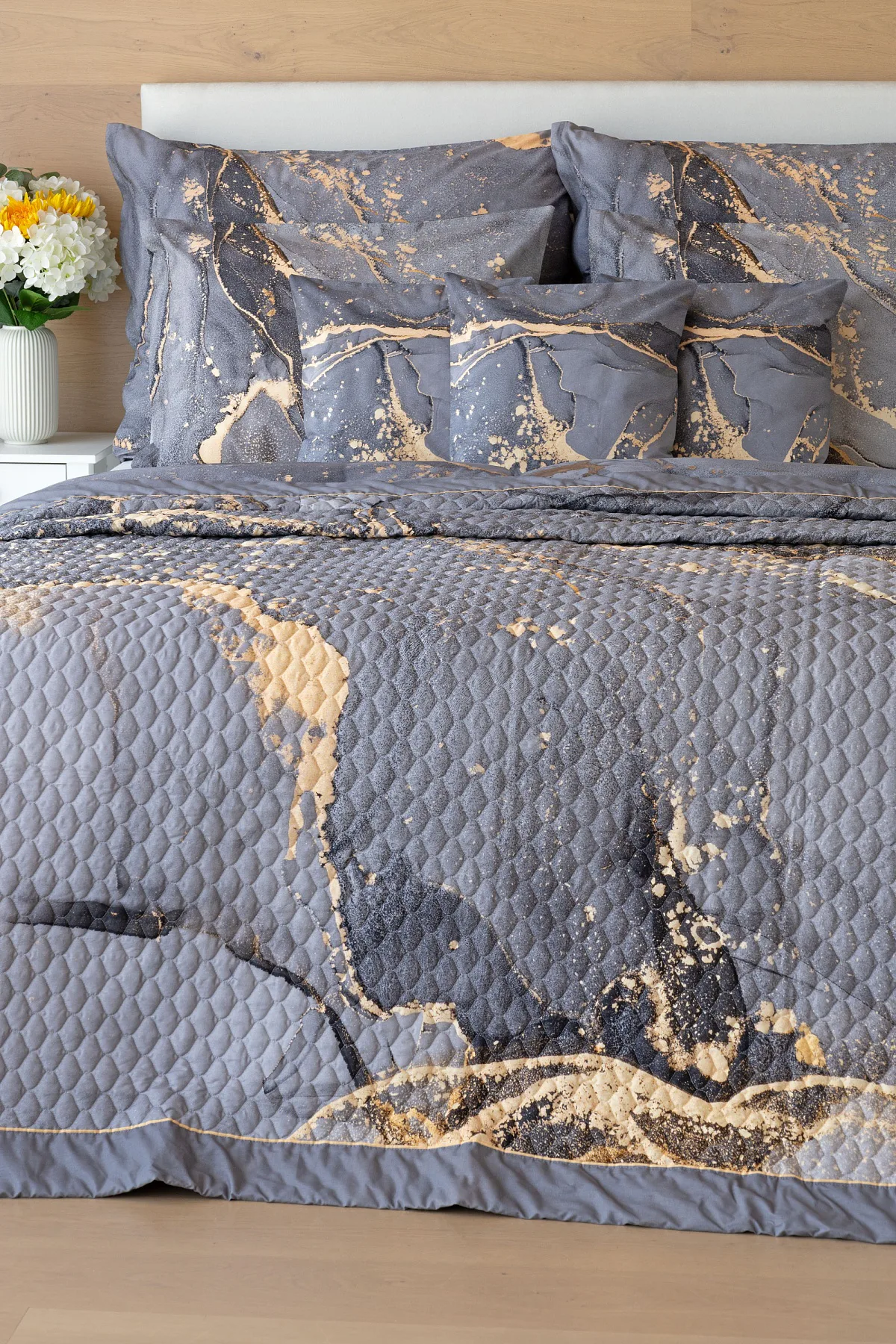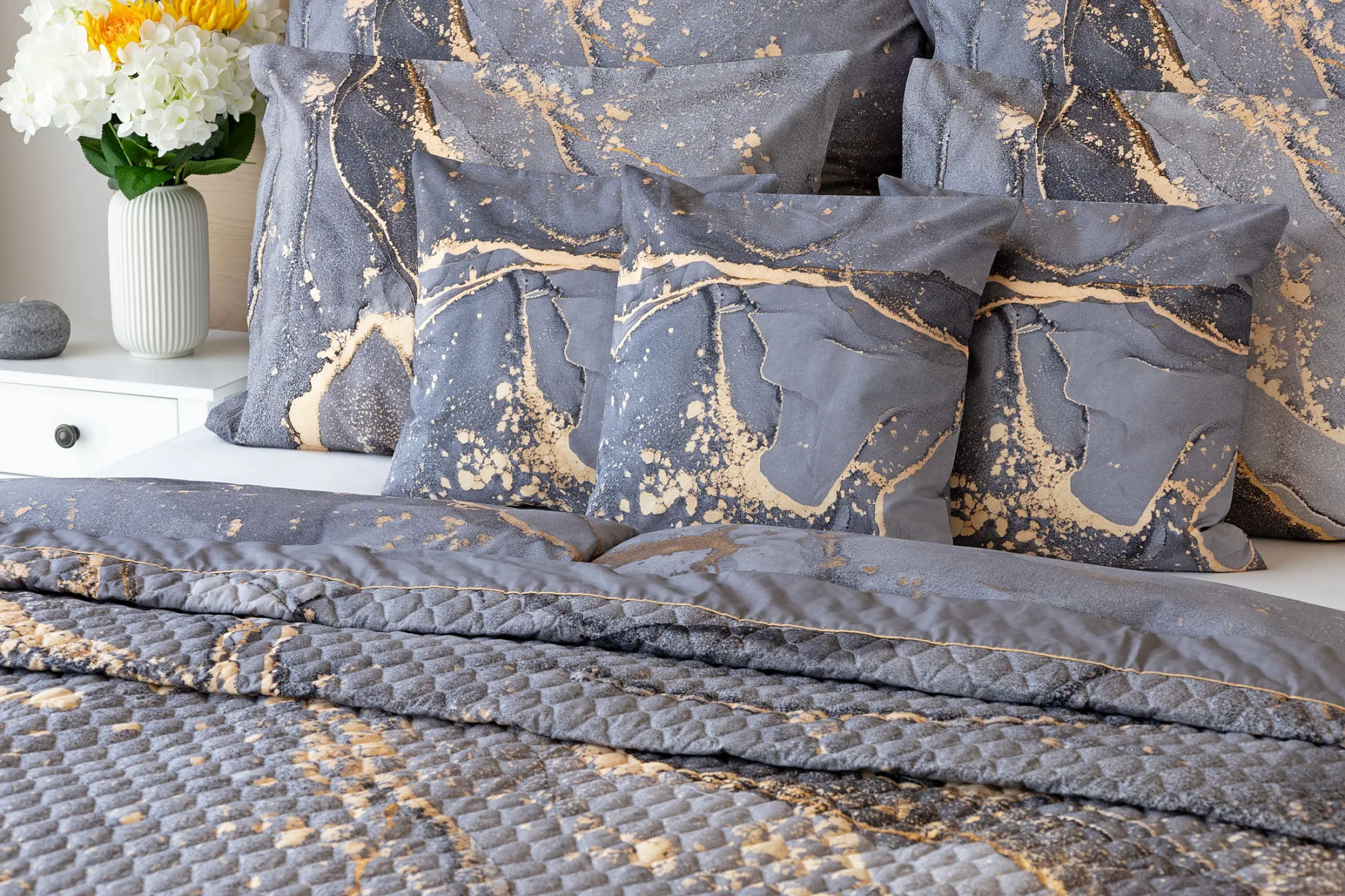 Barevné provedení: Elegantní mramorový vzor, který je z obou stran přehozu stejný. Okraje zdobí šedé lemování doplněné na vrchní straně pískově žlutou paspulí.