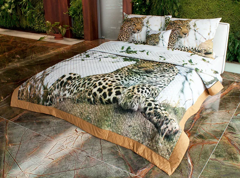 Majestátně vyhlížející leopard, je ideální volbou pro milovníky kočkovitých šelem a divoké přírody, zvlášť v podání jedinečného estetického a praktického doplňku jakým je přehoz. Jako výplň je použito vrstvené duté vlákno, povrchový materiál je 100 % bavlněná látka, ve stejném dezénu jako ložní povlečení s pískovým olemováním. Po celé ploše je aplikováno ozdobné prošití, tak aby se zajistila stabilita výplně a současně podtrhl celkový vzhled přehozu.