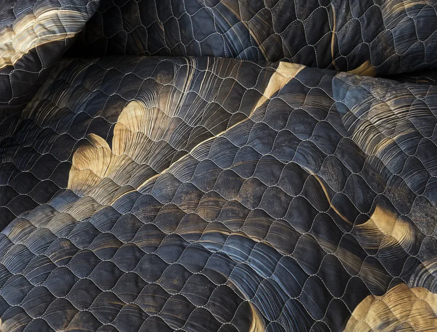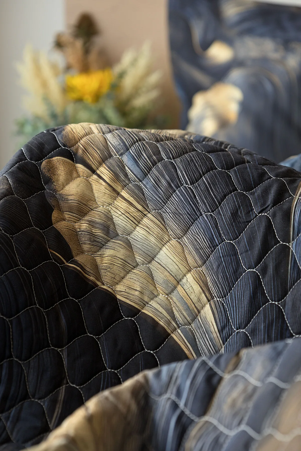 Barevné provedení: Abstraktní motiv ve tvaru lyry v paletě tmavě modrých a pískových tónů, který je z obou stran přehozu stejný. Okraje zdobí černé lemování doplněné na vrchní straně paspulí v pískové barvě.