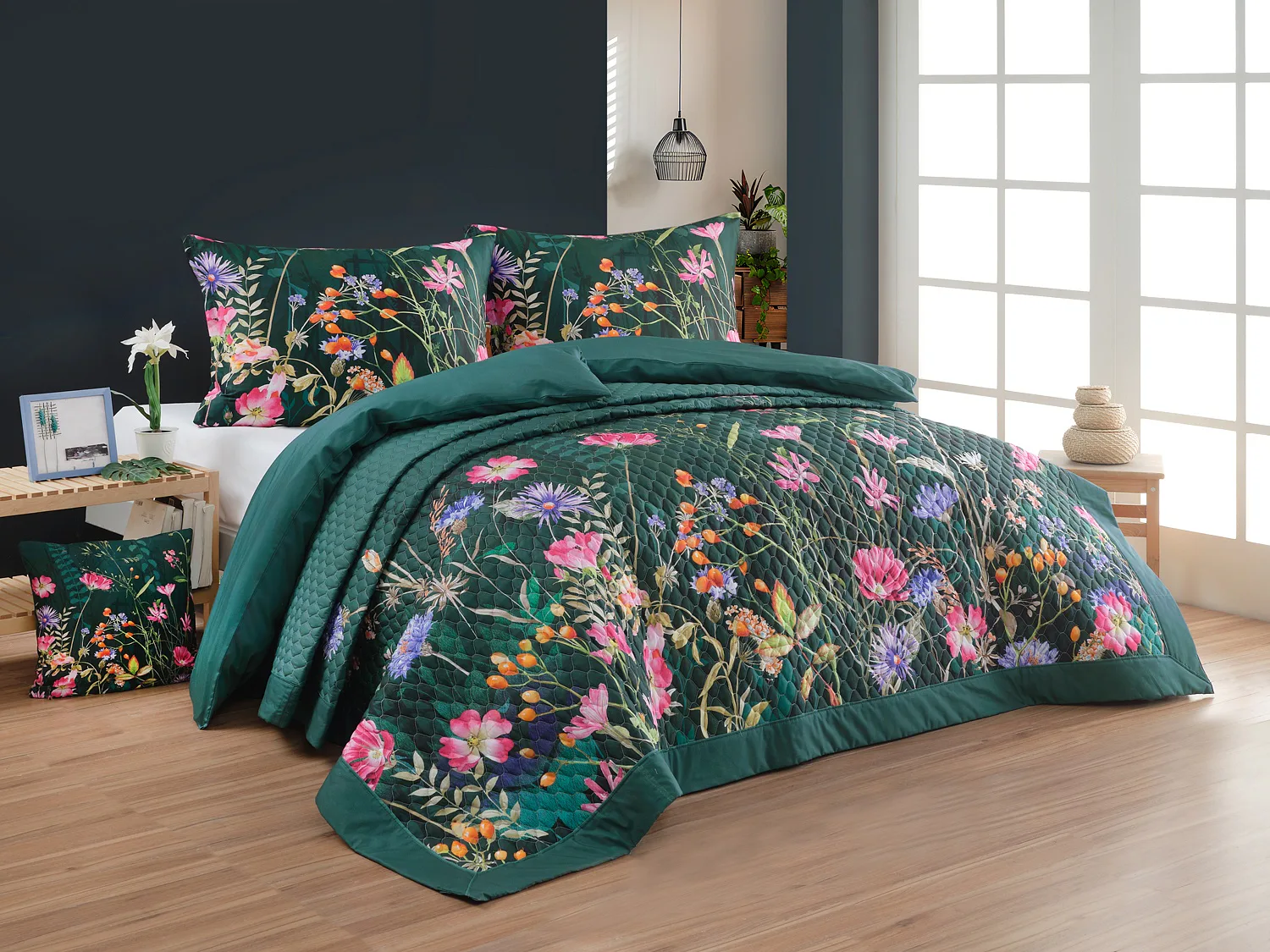 Barevné provedení: Atraktivní motiv pestrobarevných květů na zelenomodrém podkladu, který je z obou stran přehozu stejný. Okraje zdobí zelenomodré lemování doplněné na vrchní straně tlumenou zelenomodrou paspulí.