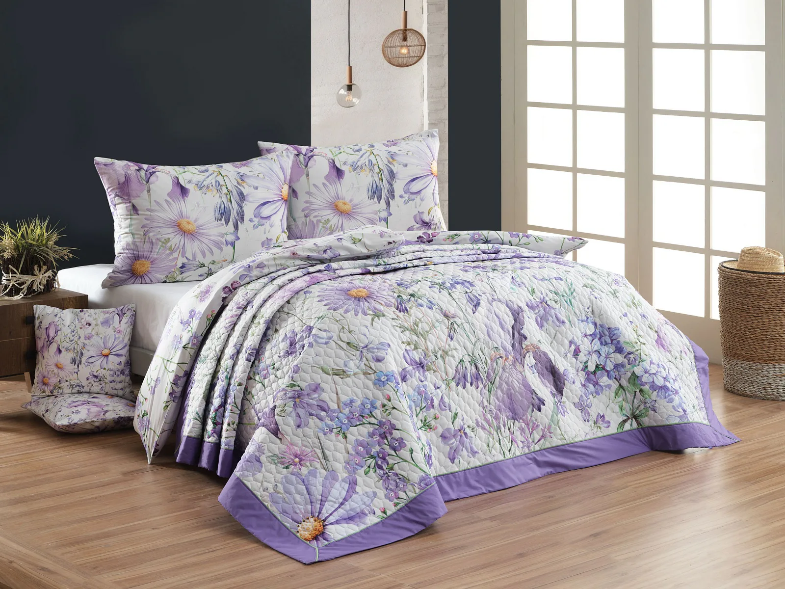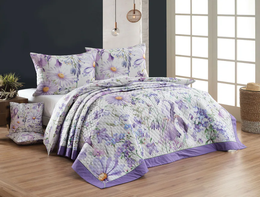 Barevné provedení: Atraktivní květinový vzor v paletě fialových a světle modrých tónů, který je z obou stran přehozu stejný. Okraje zdobí fialové lemování doplněné na vrchní straně sytě zelenou paspulí.
