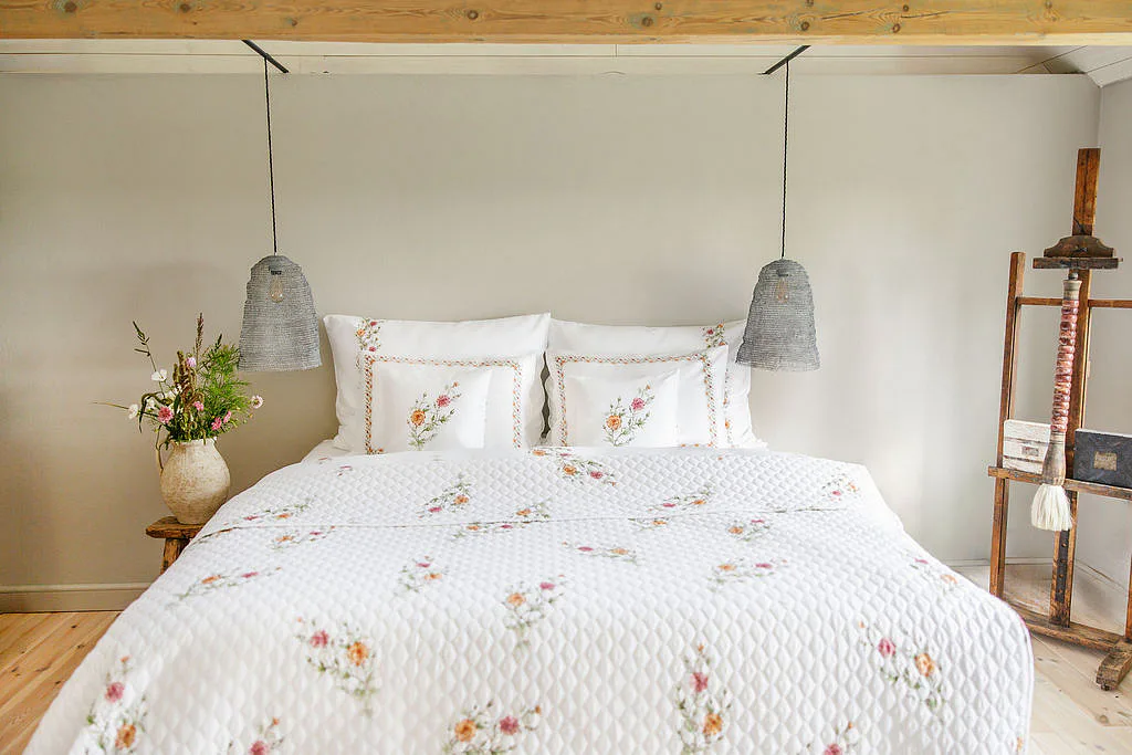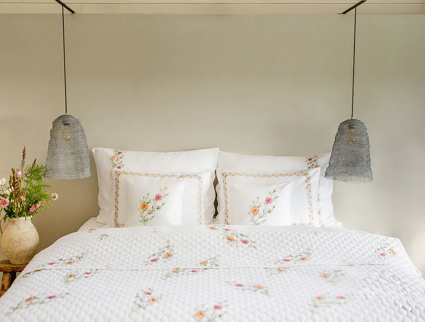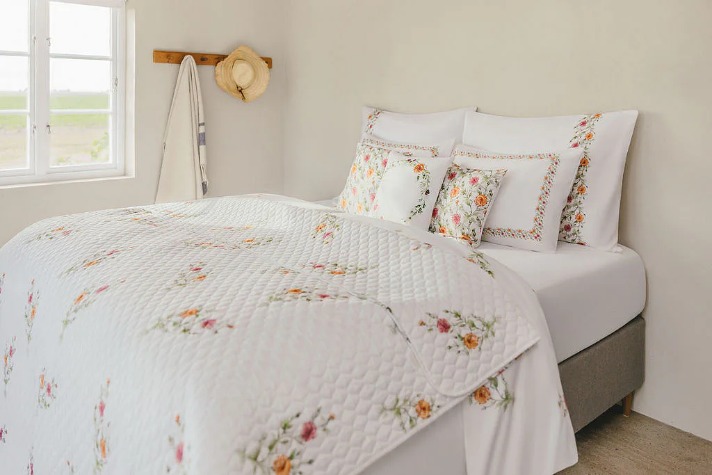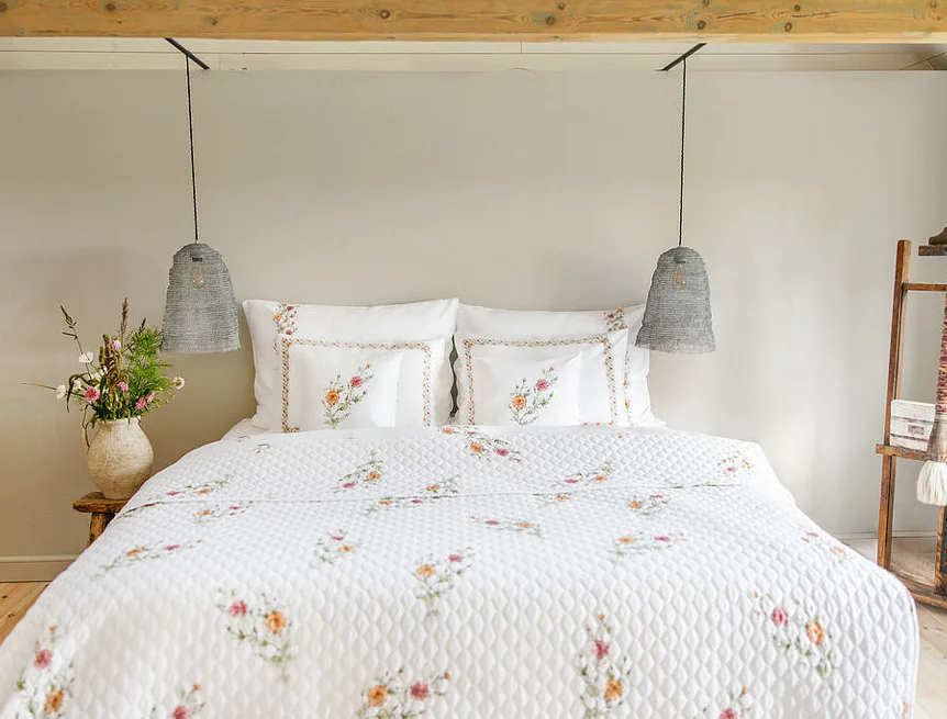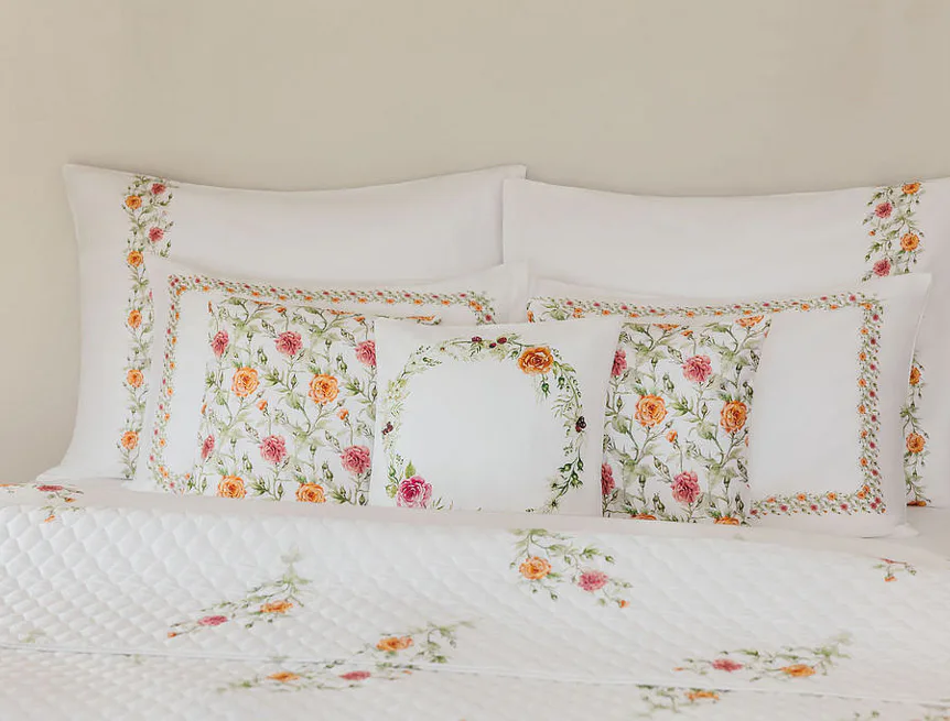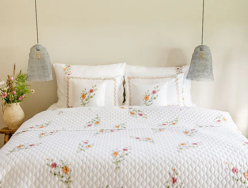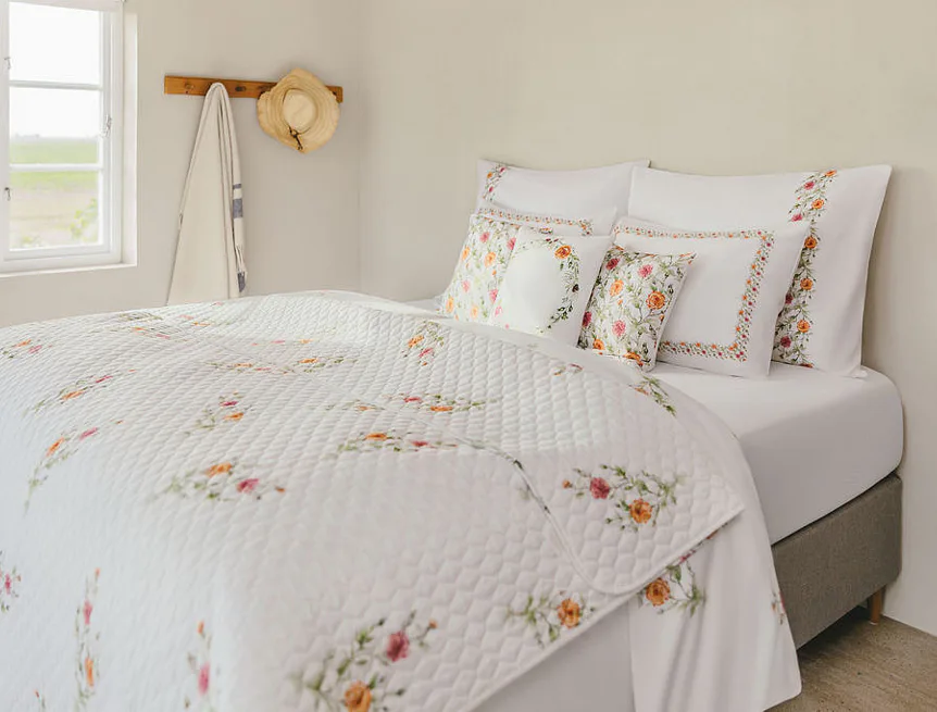 Tečka, která dává scéně řád: kolekce povlečení a dekoračních povlaků s ilustracemi od umělkyně Zuzany Osako je doplěná o nádherně zpracovaný prošívaný přehoz, který promění ložnici v komorní hotelový salón. Jemný lesk bavlněného saténu, rytmus prošívání a motiv Růže spolu vypráví o eleganci, co nic nepředstírá – jen ladně přikrývá den i noc.