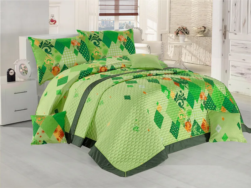 Přehoz VALENCIA GREEN je jedinečný, estetický a praktický doplněk, se kterým bude Vaše postel vždy dokonale ustlaná. Jako výplň je použito vrstvené duté vlákno, povrchový materiál je 100% bavlněná látka, ve stejném dezénu jako ložní povlečení. Po celé ploše je aplikováno ozdobné prošití tak, aby se zajistila stabilita výplně a současně podtrhl celkový vzhled přehozu.