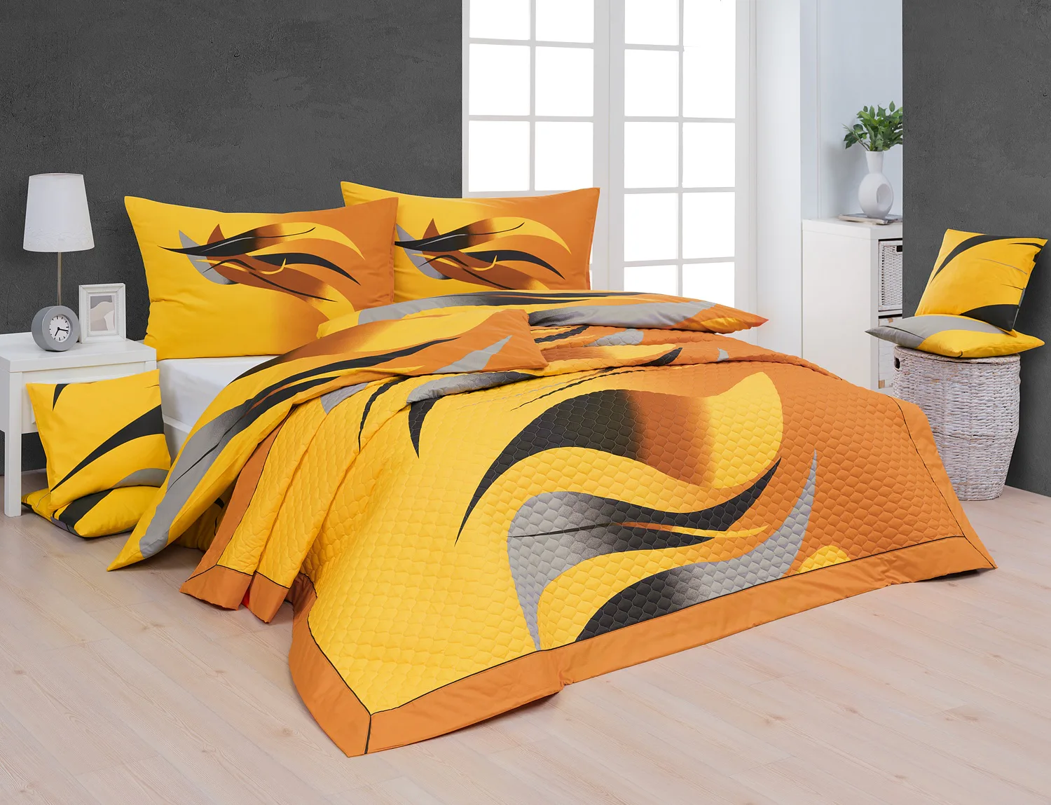 Barevné provedení: Extravagantní moderní vzor, který je z obou stran přehozu stejný. Okraje zdobí oranžové lemování doplněné na vrchní straně černou paspulí.