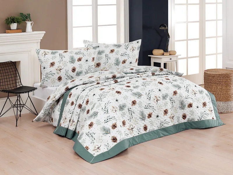 Barevné provedení: Jemný přírodní motiv, který je z obou stran přehozu stejný. Okraje zdobí šedozelené lemování doplněné na vrchní straně zelinkavou paspulí.
