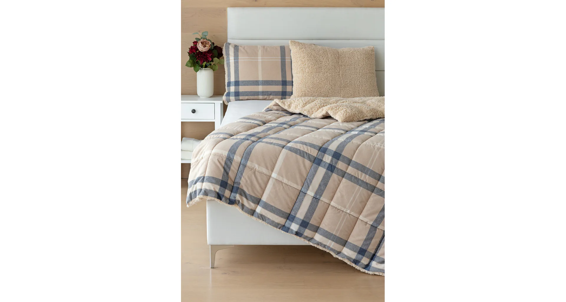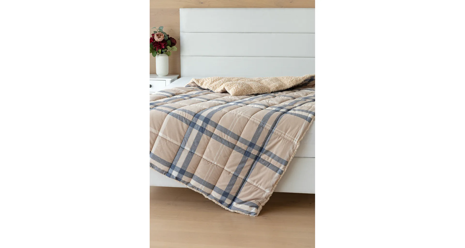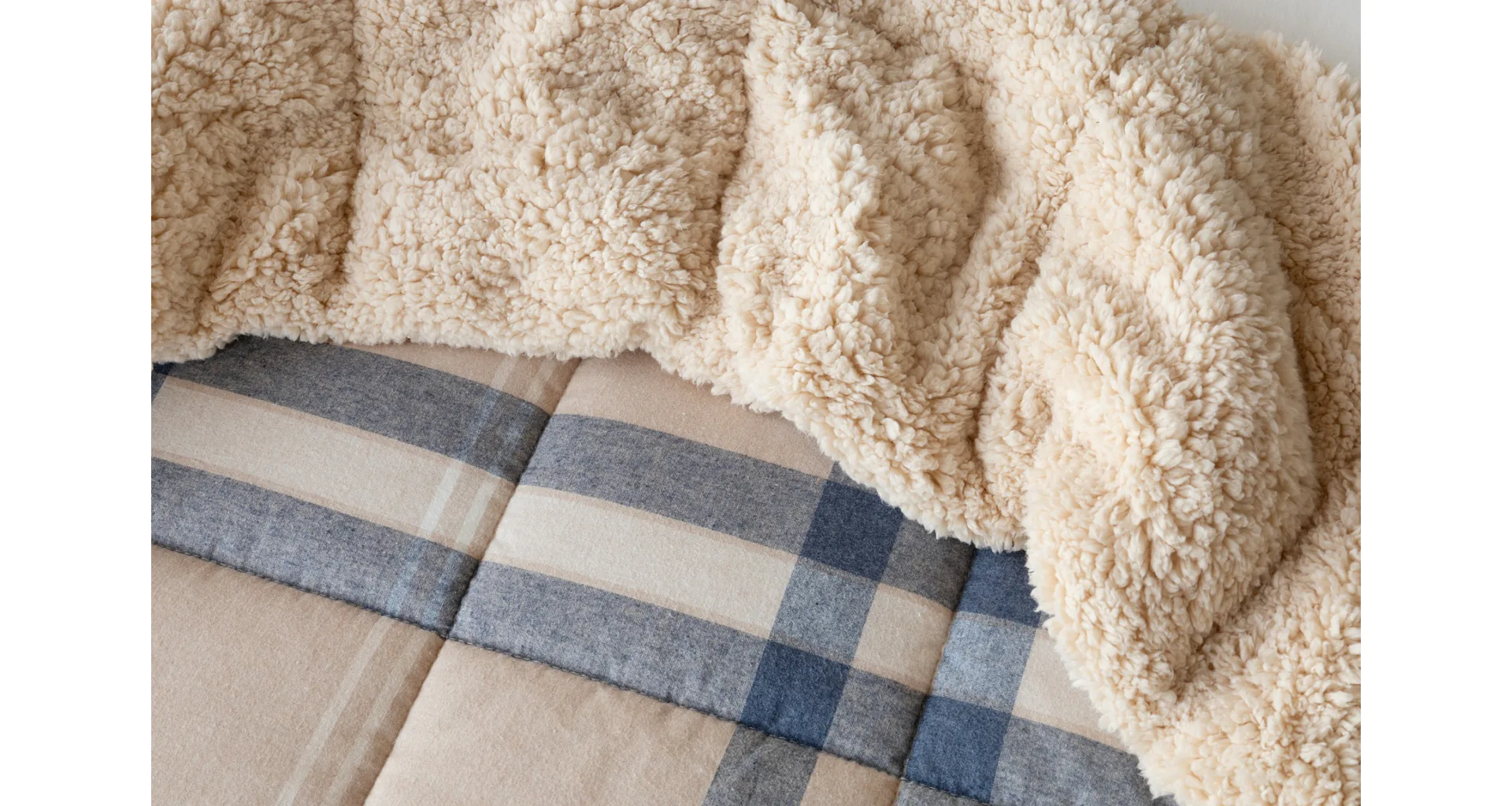 Atraktivní kostkovaný vzor Ella v kombinaci béžové, tmavě modré a bílé doplňuje barevně sladěný beránek v béžovém odstínu. K přikrývce lze dokoupit také polštář ve stejném designu.