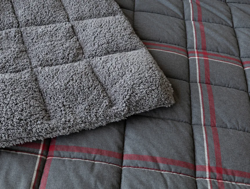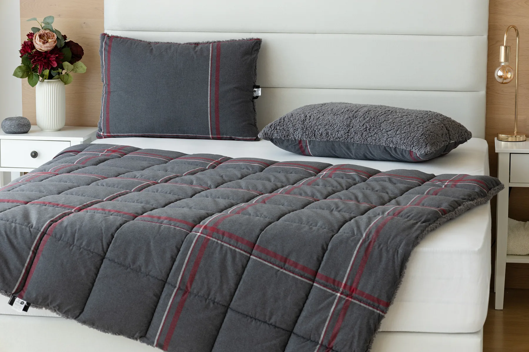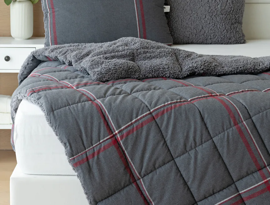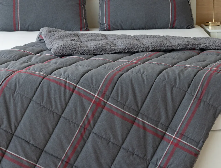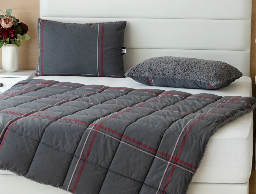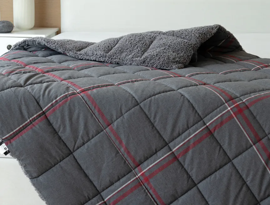 Nová kolekce prošívaných flanelových přikrývek s beránkem vám zajistí jedinečný tepelný komfort a úžasné pohodlí během sychravých dnů, chladných večerů a zimních nocí. Vrchní stranu prošívané deky tvoří hebký flanel s jemným chloupkem, spodní stranu pokrývá hřejivý nadýchaný beránek. Vnitřní výplň s plošnou gramáží 250 g/m2 tvoří mikrogelové polyesterové nano vlákno, které je prodyšné, lehké a nesléhá. Stabilitu výplně zajišťuje precizní prošití po celé ploše.