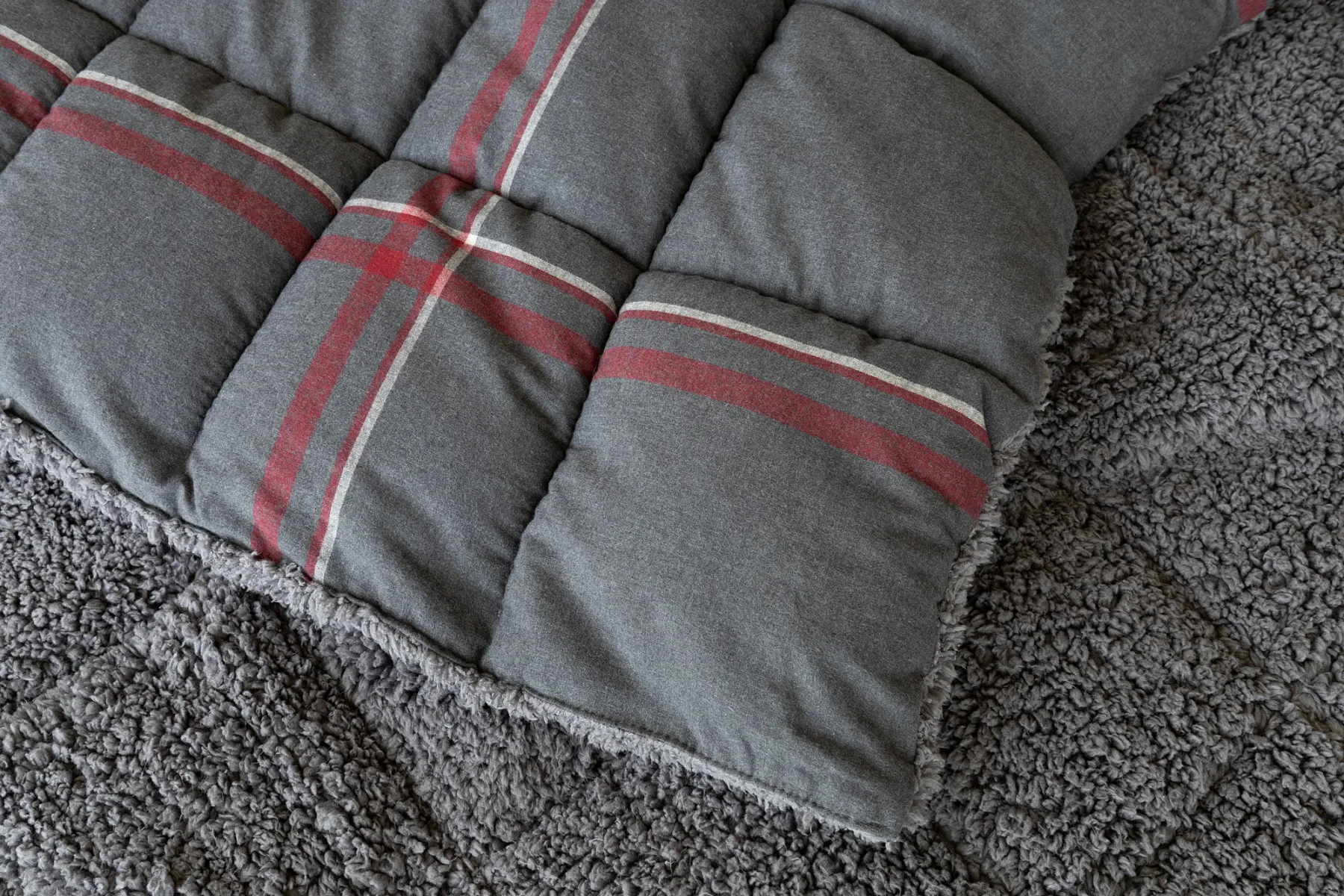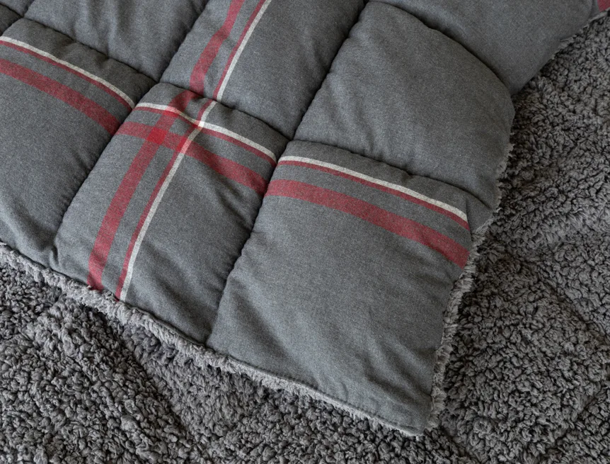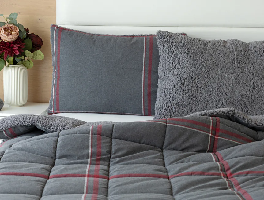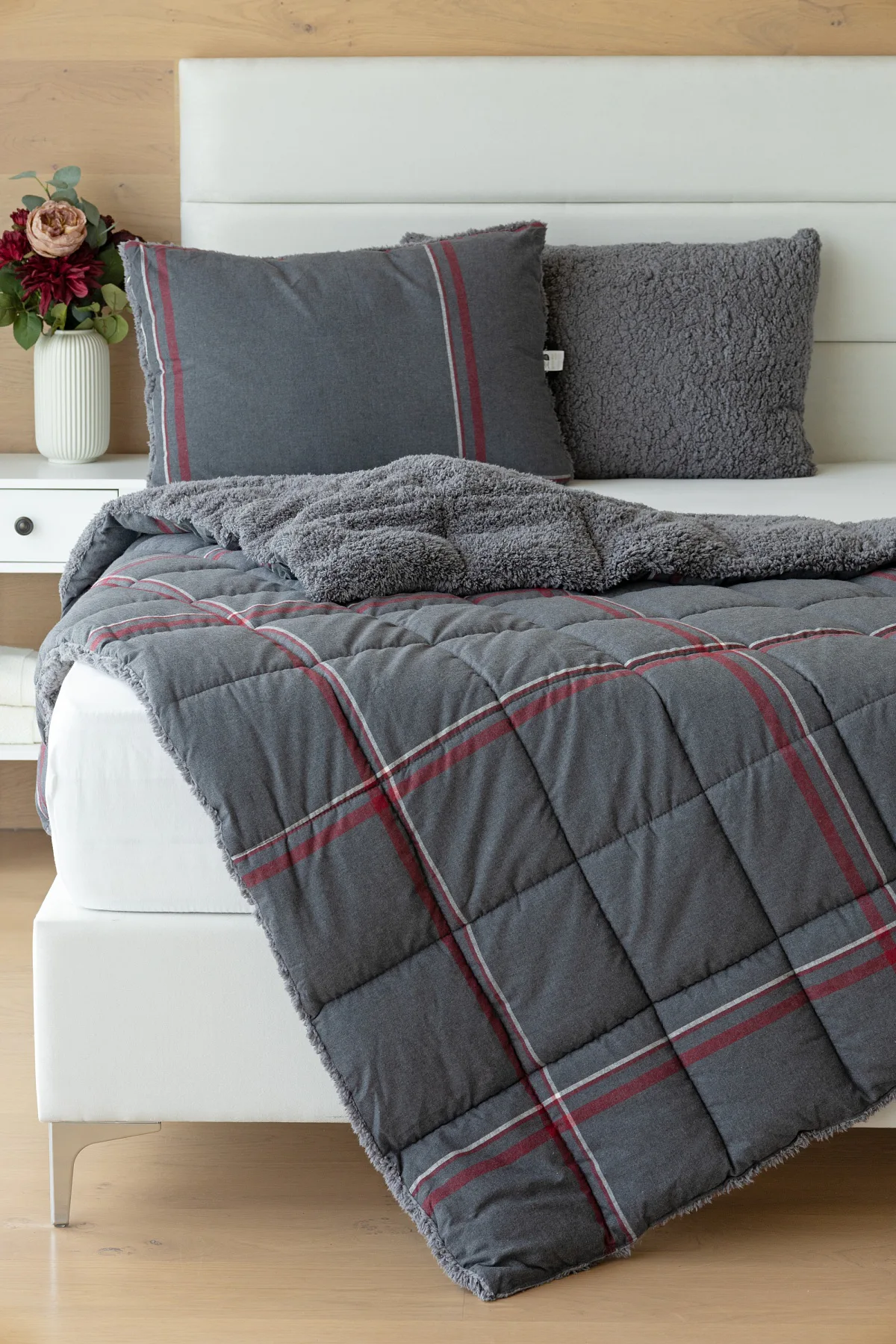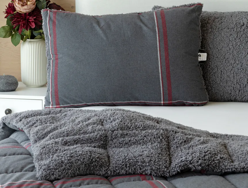 Atraktivní tmavě šedý podklad přikrývky Ida protíná bílá a vínově červená linka, spodní stranu zdobí barevně sladěný beránek v tmavě šedém odstínu. K přikrývce lze dokoupit také polštář ve stejném designu.