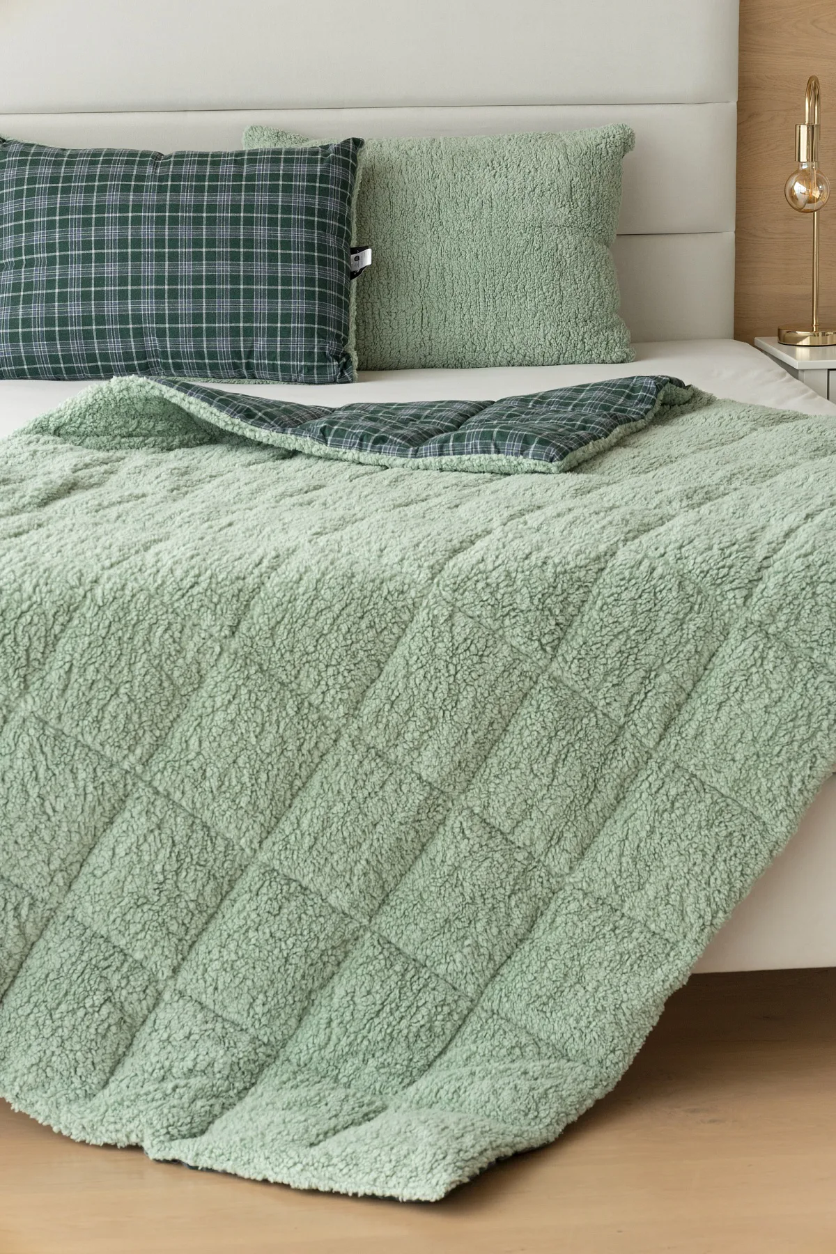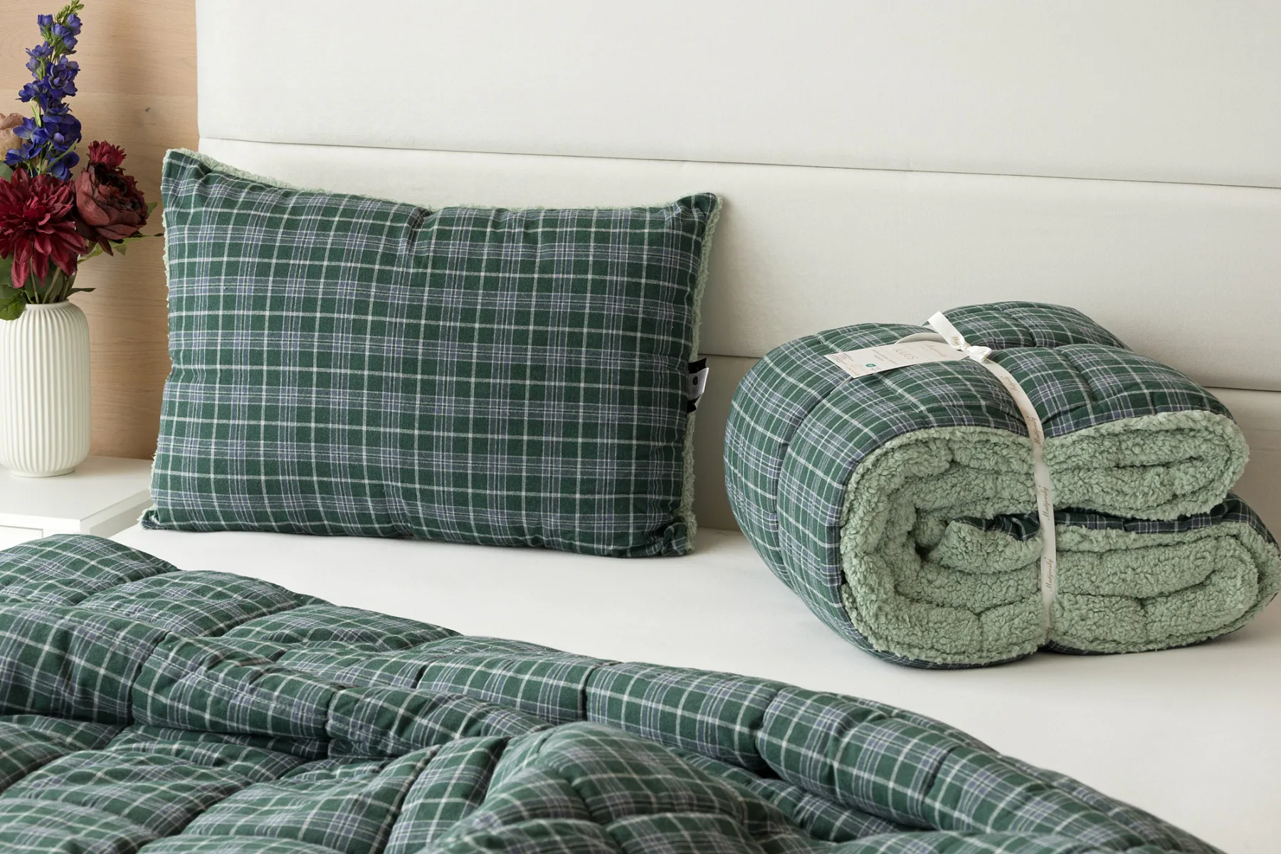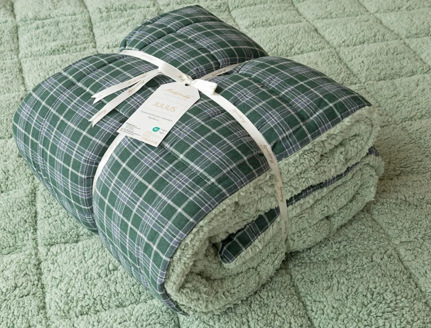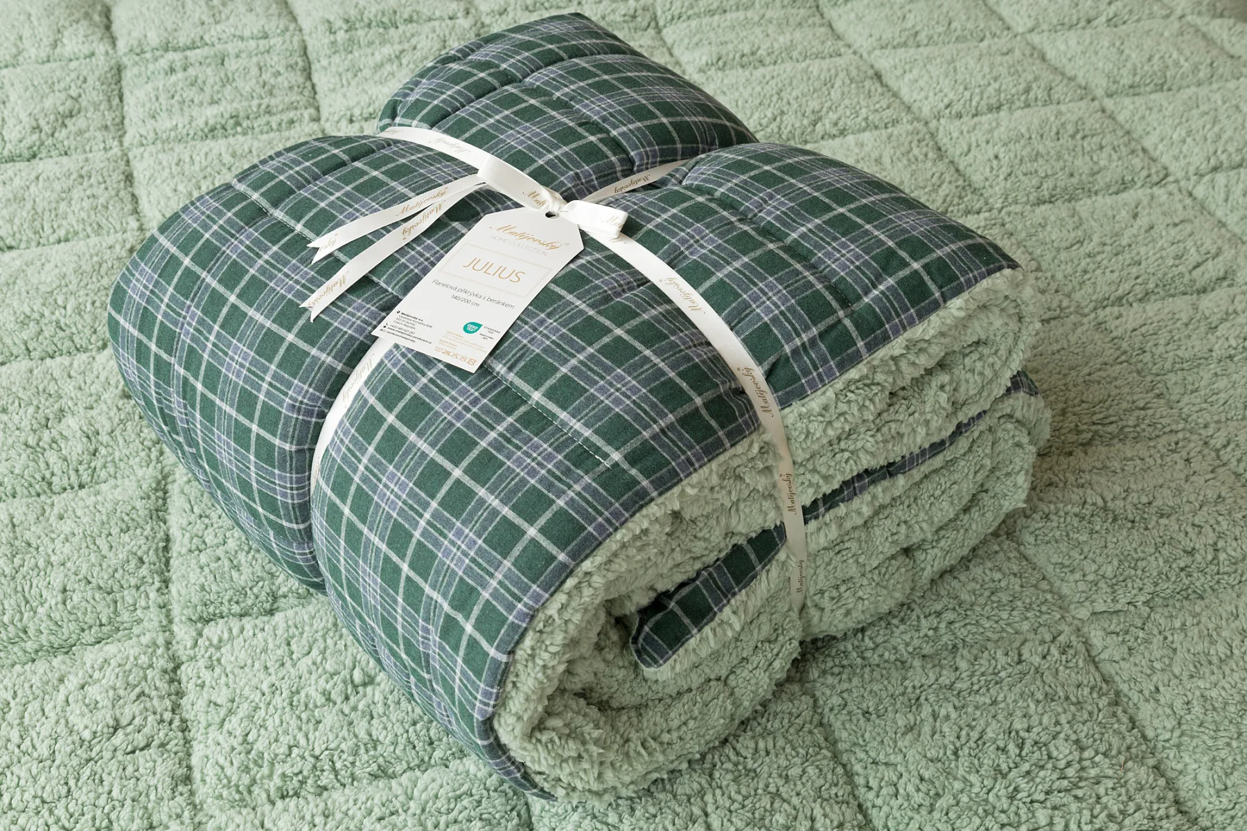 Atraktivní kostkovaný vzor Julius v paletě svátečních zelených a tlumených šedomodrých tónů doplňuje beránek světle zelené barvy. K přikrývce lze dokoupit také polštář ve stejném designu.