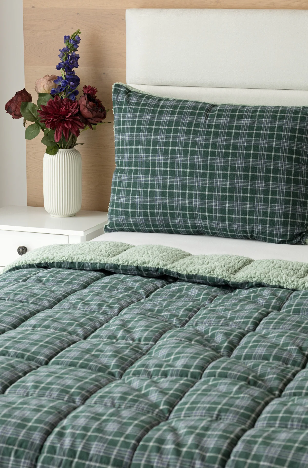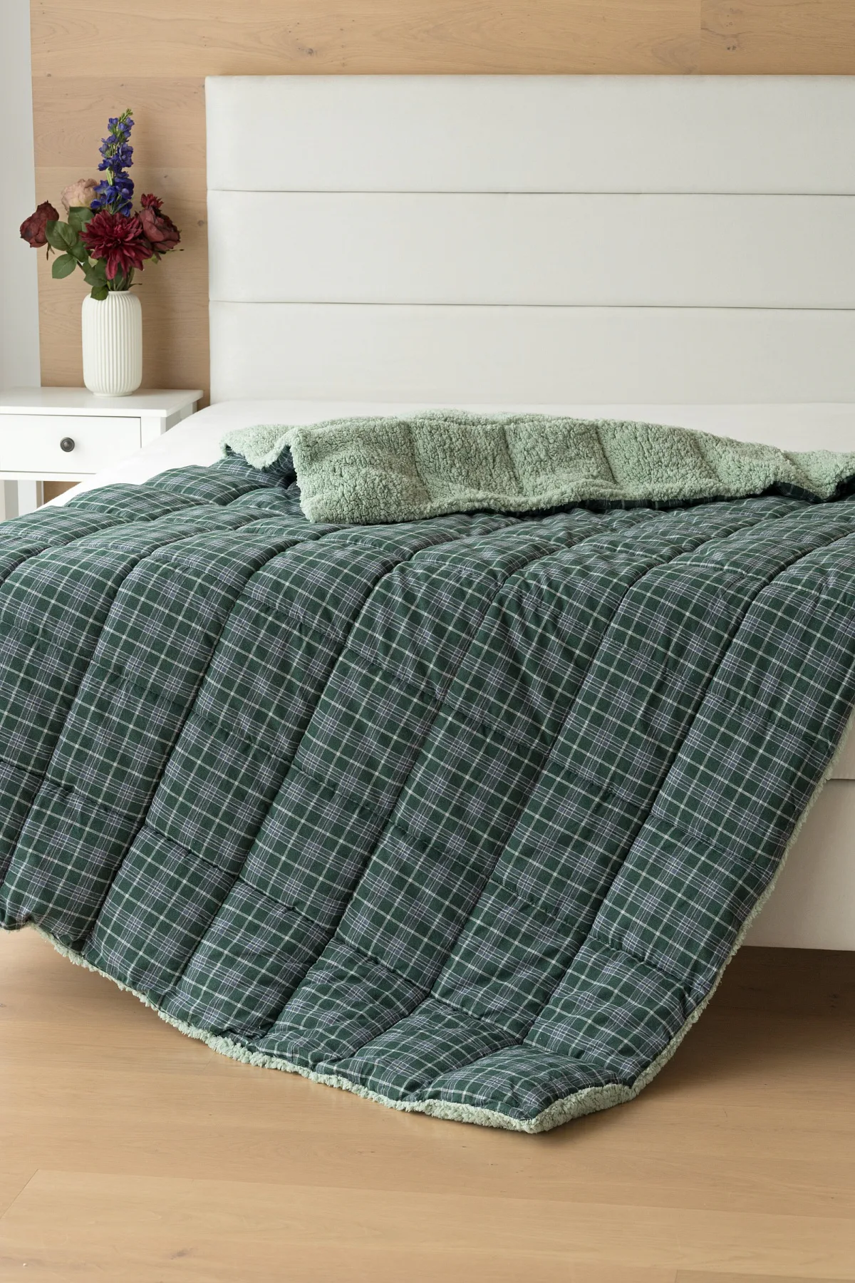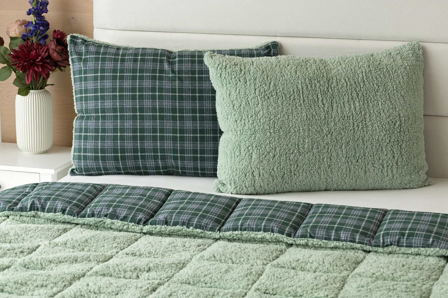 Atraktivní kostkovaný vzor Julius v paletě svátečních zelených a tlumených šedomodrých tónů doplňuje beránek světle zelené barvy. K přikrývce lze dokoupit také polštář ve stejném designu.