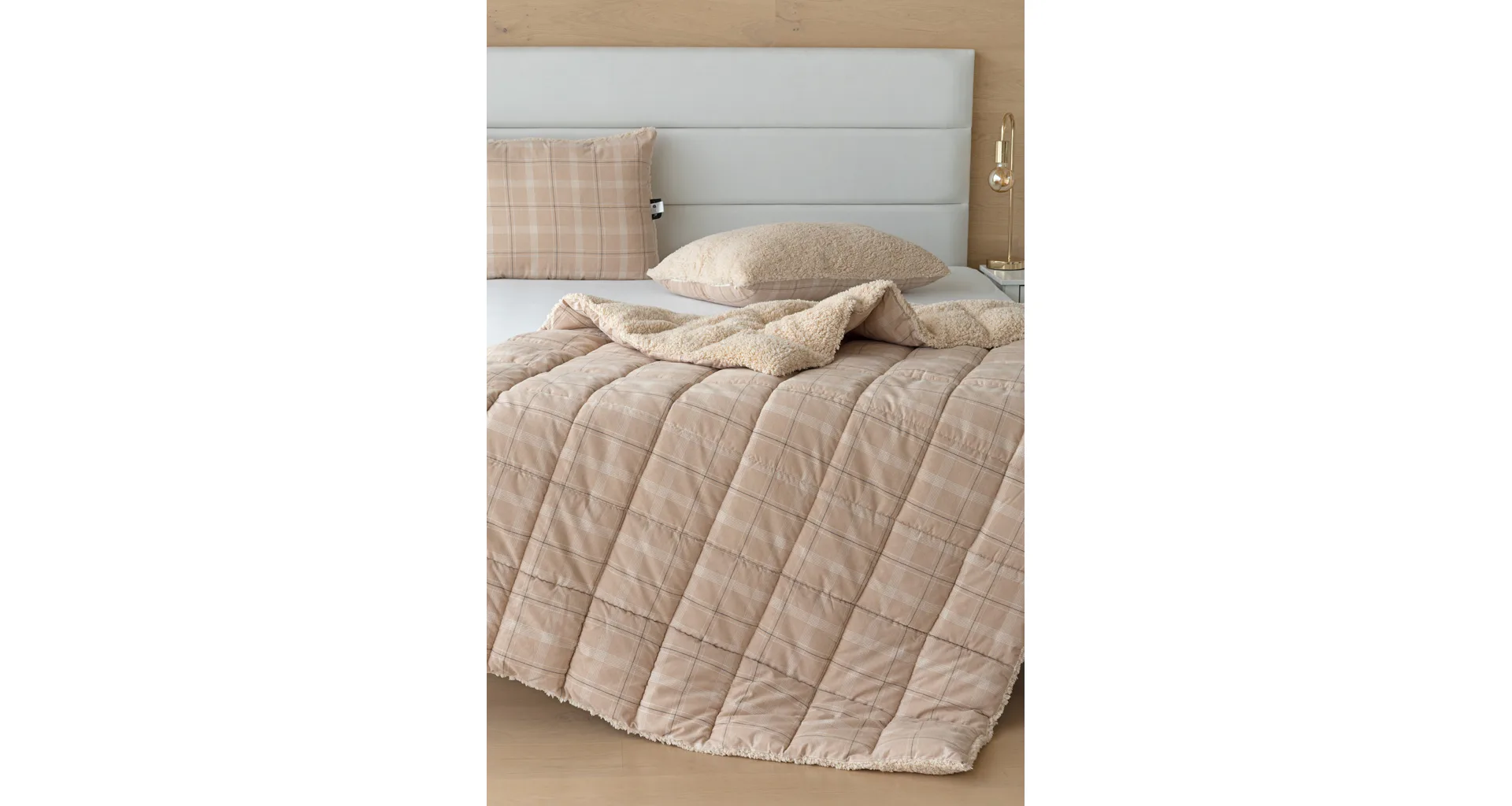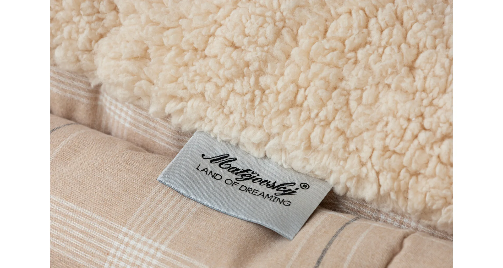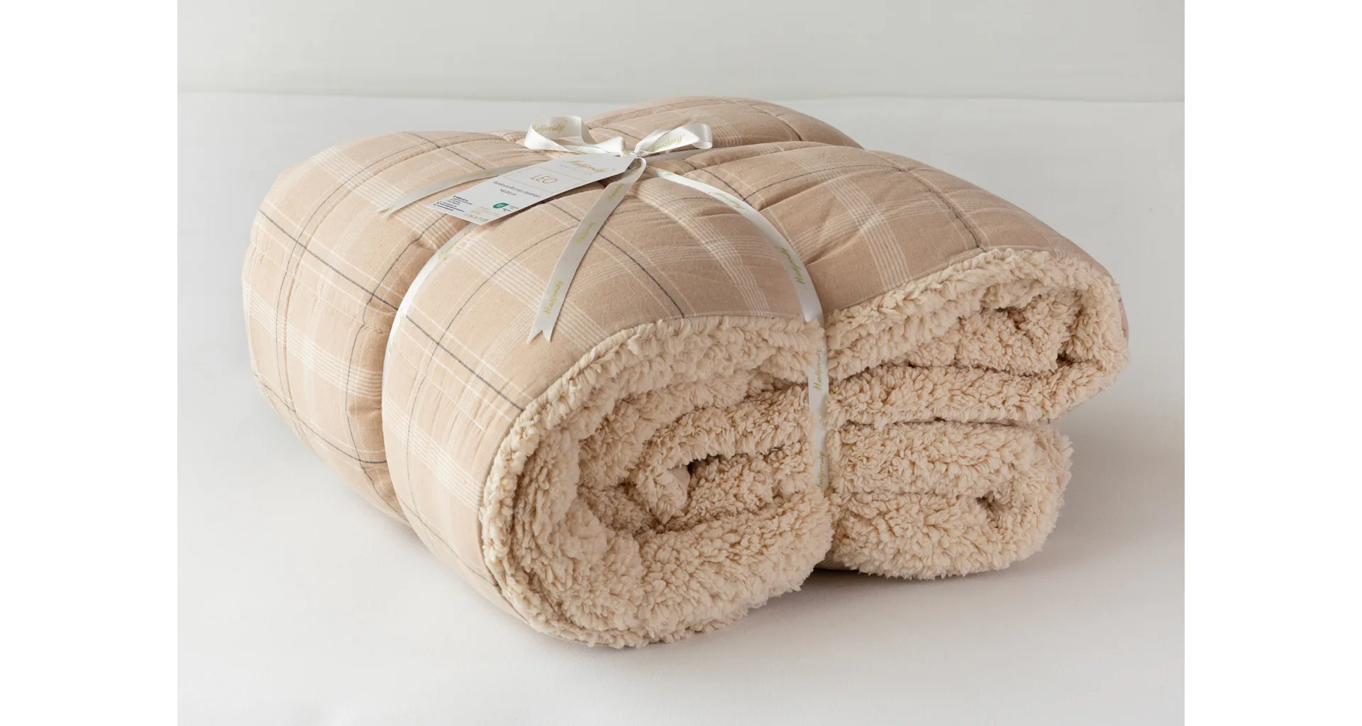Vzor Leo s decentní kostkou v paletě béžových a krémových tónů doplňuje barevně sladěný beránek v béžovém odstínu. K přikrývce lze dokoupit také polštář ve stejném designu.