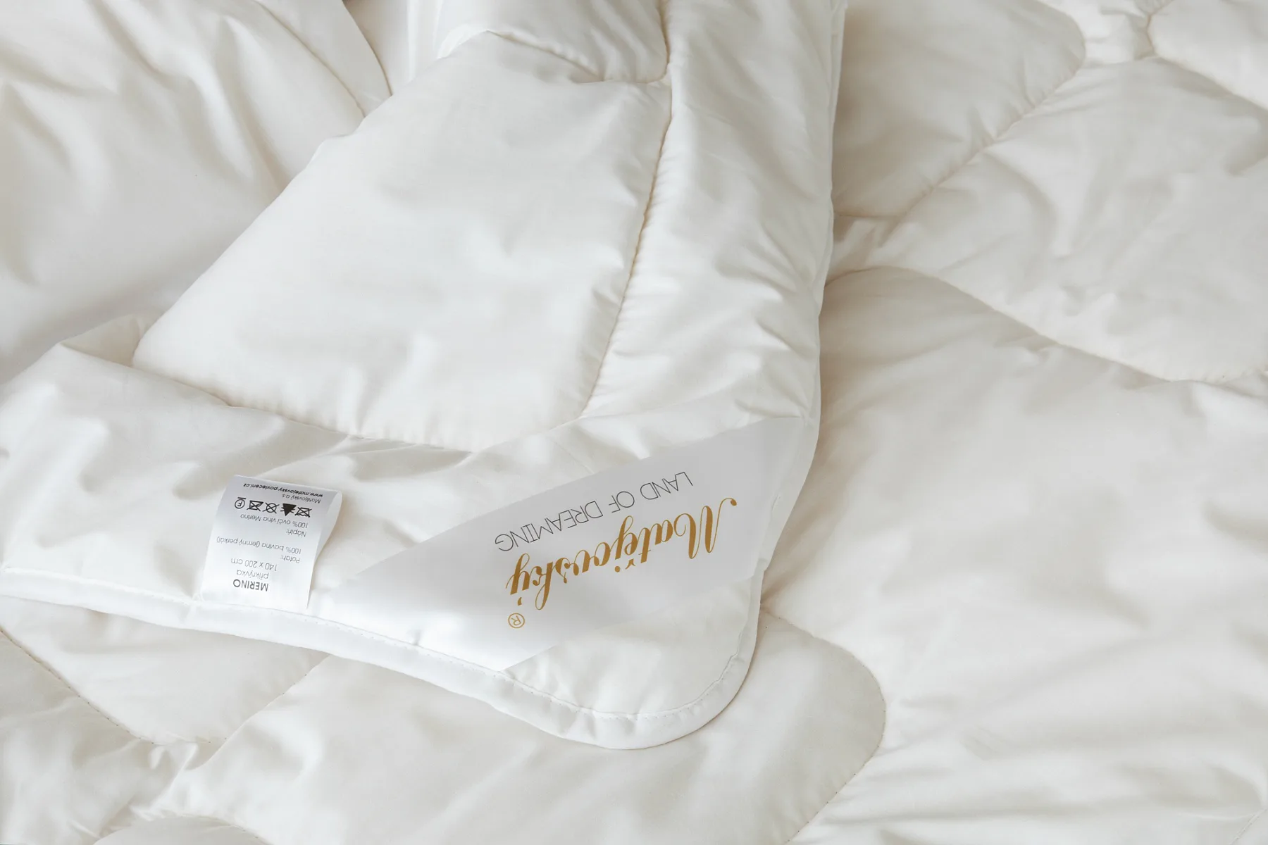 Ovčí vlna Merino tvoří 100% náplně přikrývky, potah je vyrobený ze 100% prvotřídní bavlny. Díky tomuto unikátnímu přírodnímu složení a přirozené termoregulaci je přikrývka Merino navzdory nízké plošné gramáži vhodná pro celoroční použití. Přikrývka Merino je v porovnání s běžnými dekami náročnější na údržbu