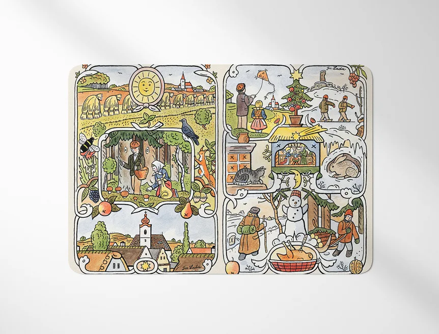 Prostírání z kolekce Josef Lada vnese do vaší jídelny kouzelnou atmosféru. Rozměry: 35x45 cm Materiál: PVC Frontlit - měkký banner s plošnou hmotností 510 g/m2. Matný hladký povrch. Spodní strana...