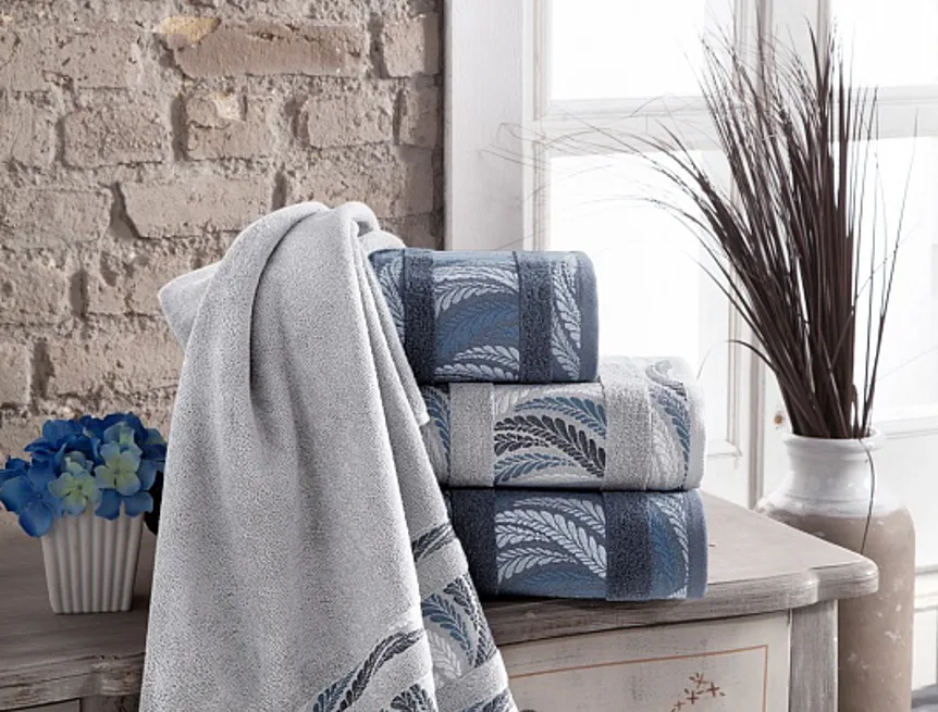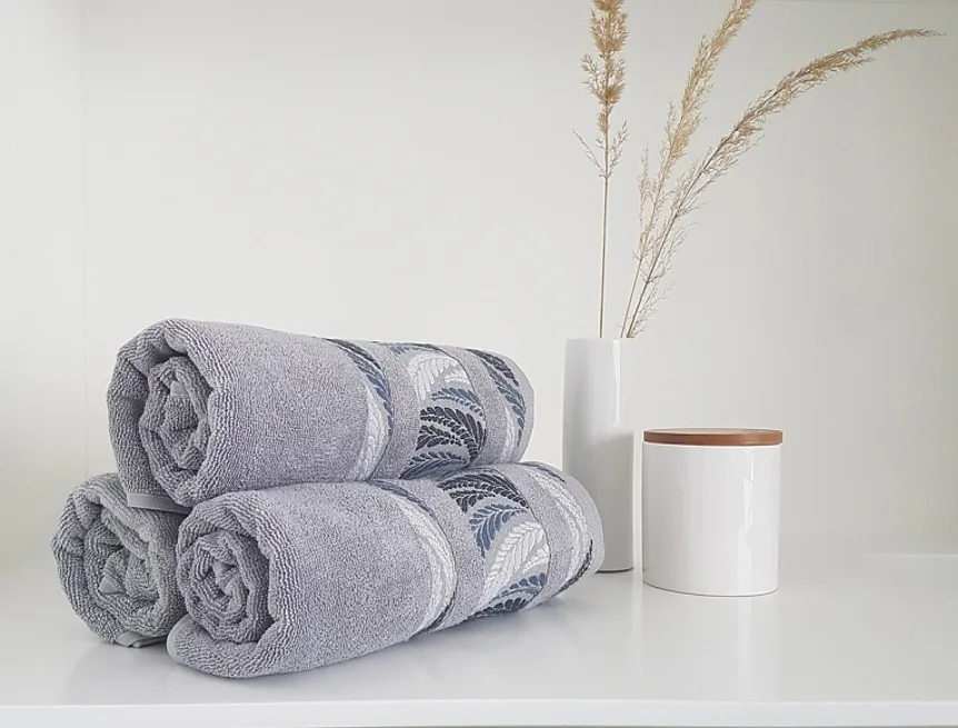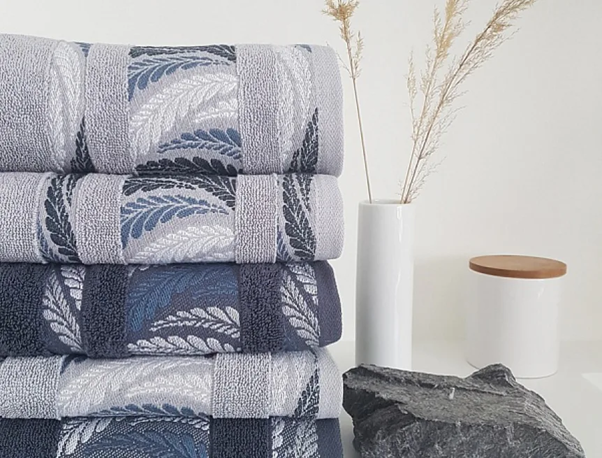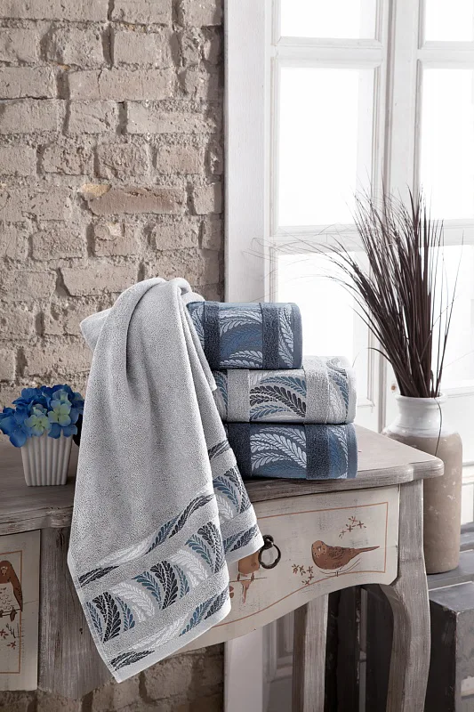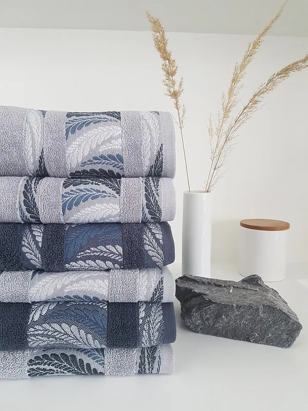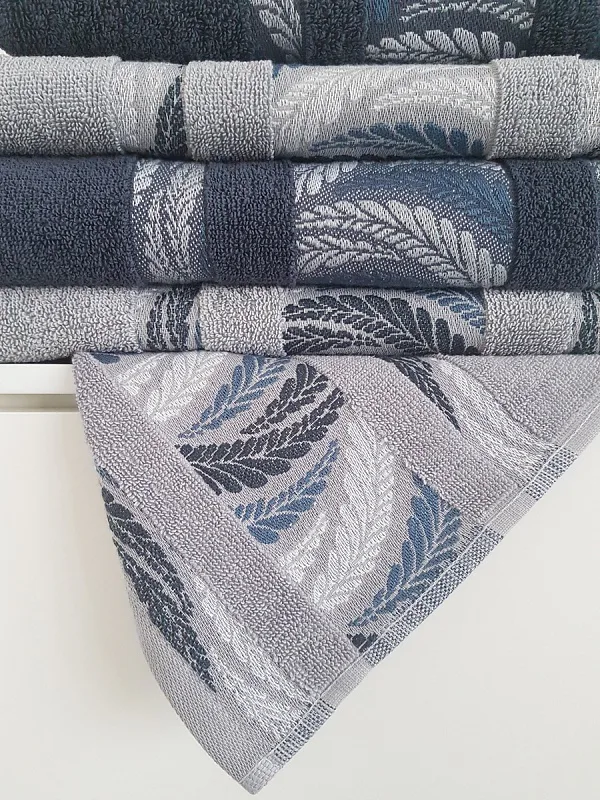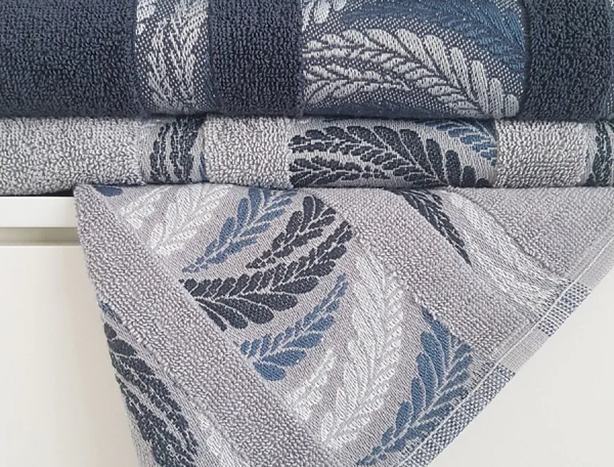 Vybírejte ze dvou okouzlujících barev, které působivě doladí interiér vaší koupelny: světle šedá a antracitová s plnými modrými tóny. Kolekci charakterizuje precizně vytkaná bordura ve světle šedých, středně modrých a antracitových tónech.
