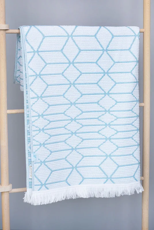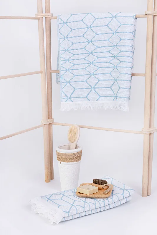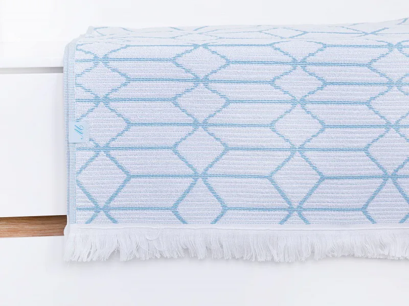 Vytkáváním vzniklo inverzní provedení osušky, která je z jedné strany světlejší a z druhé tmavší. Delší strany osušky jsou olemované a krátké strany zdobí jemné tenké bílé třásně. Poutko pro zavěšení je umístěno na delší straně osušky.