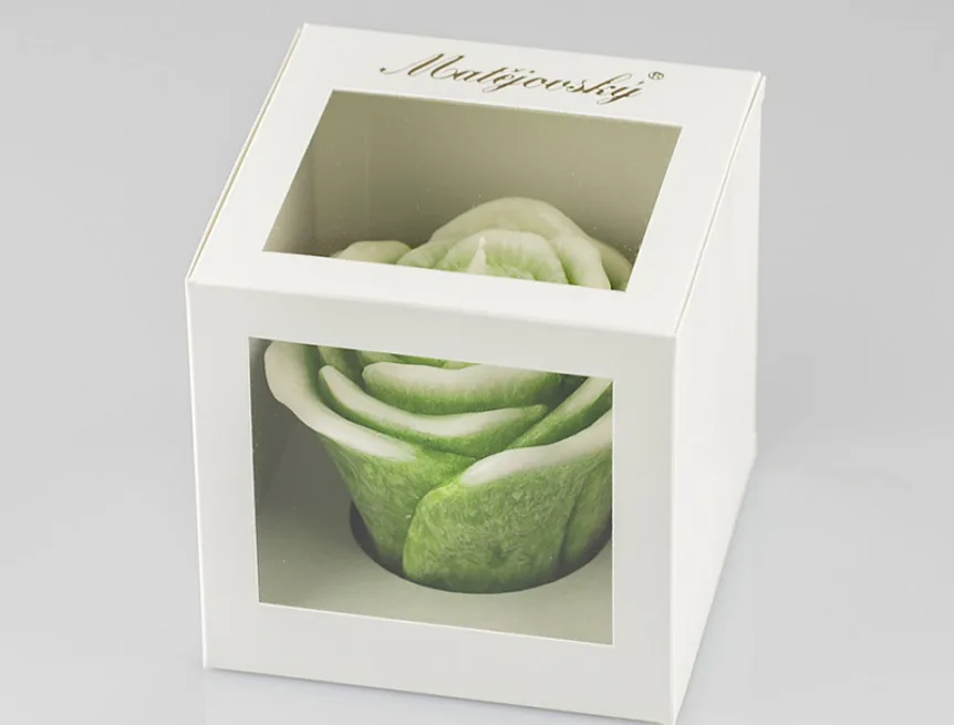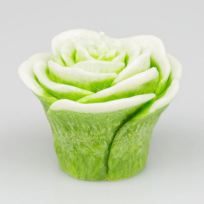 Ručně vyráběná svíčka ve tvaru květu růže v barvě zelené, s jemnou mramorovanou texturou je skvělým tipem na dárek pro každou romantickou duši. Květinová svíčka je vyrobena z kvalitního palmového vosku s jedním bavlněným knotem, odhořívá plynule a nekouří. Originální vzhled svíčky je doplněn sladkou ovocnou vůní, která se uvolňuje hořením.