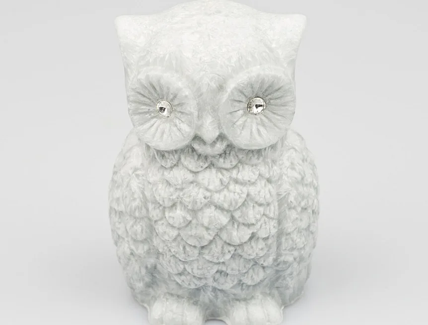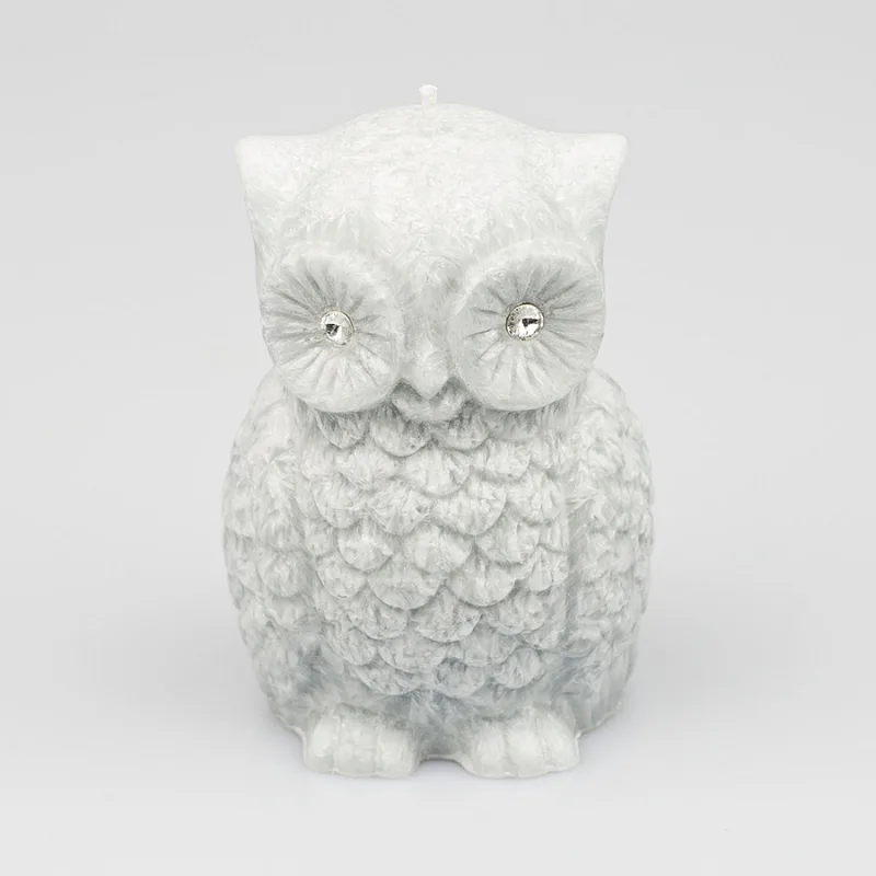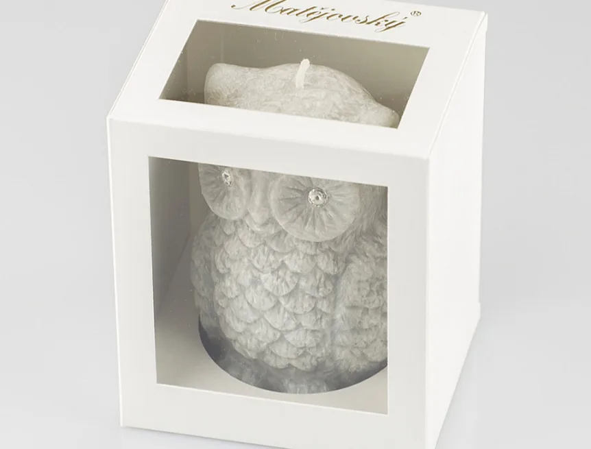 Ručně vyráběná svíčka ve tvaru sovičky v pastelovém odstínu šedé barvy s jemnou mramorovanou texturou je skvělým tipem na originální dárek. Svíčka zdobená kamínky Swarovski je vyrobena z kvalitního palmového vosku a má jeden bavlněný knot. Trendy vzhled svíčky je doplněn sladkou ovocnou vůní. Dodáváme v elegantní dárkové krabičce.
