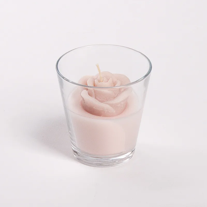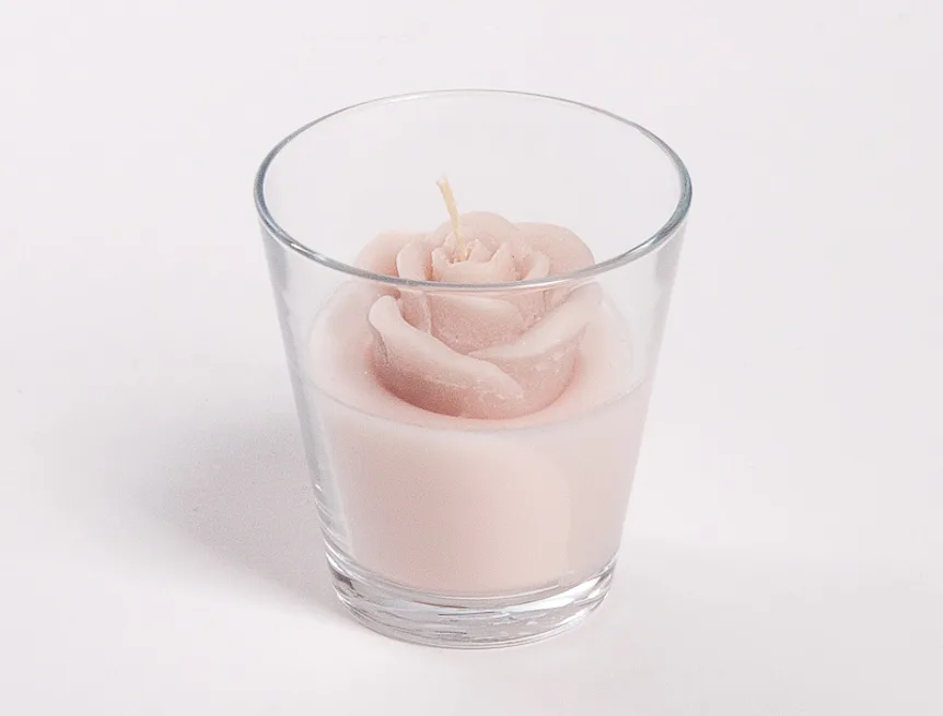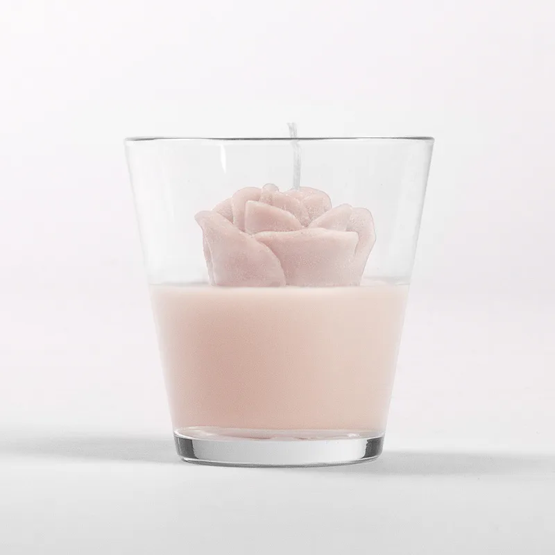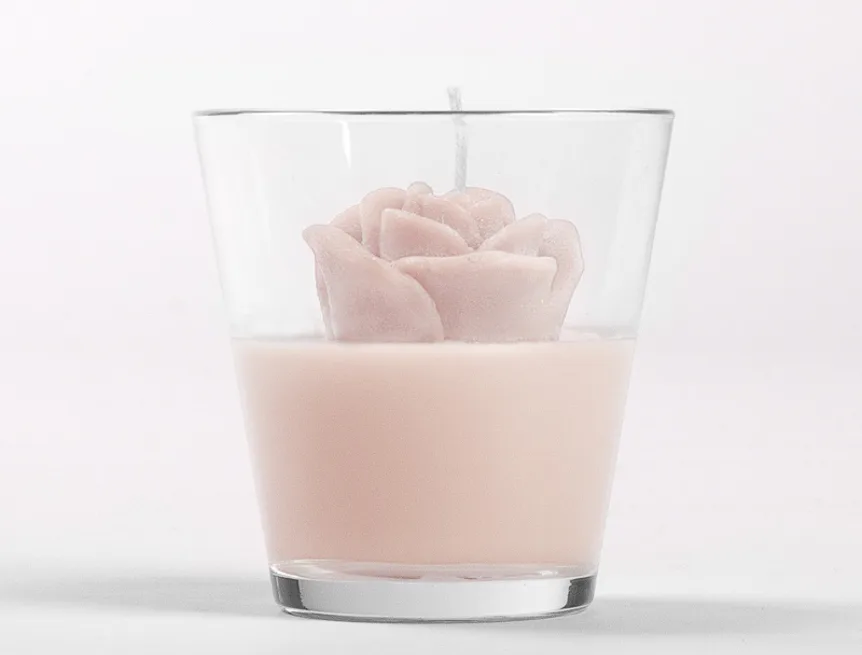 Originální, ručně vyráběná svíčka ve tvaru květu v pastelovém odstínu světlé, pudrově růžové barvy je skvělým tipem na dárek pro každou romantickou duši. Svíčka je dodávána ve skleněném svícnu a průhledném dárkovém balení s mašličkou.