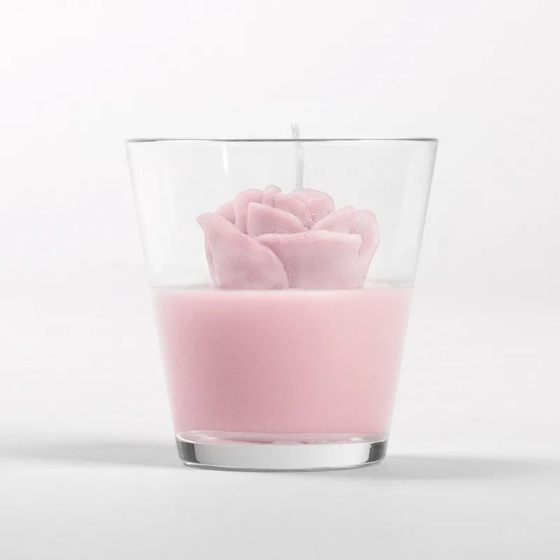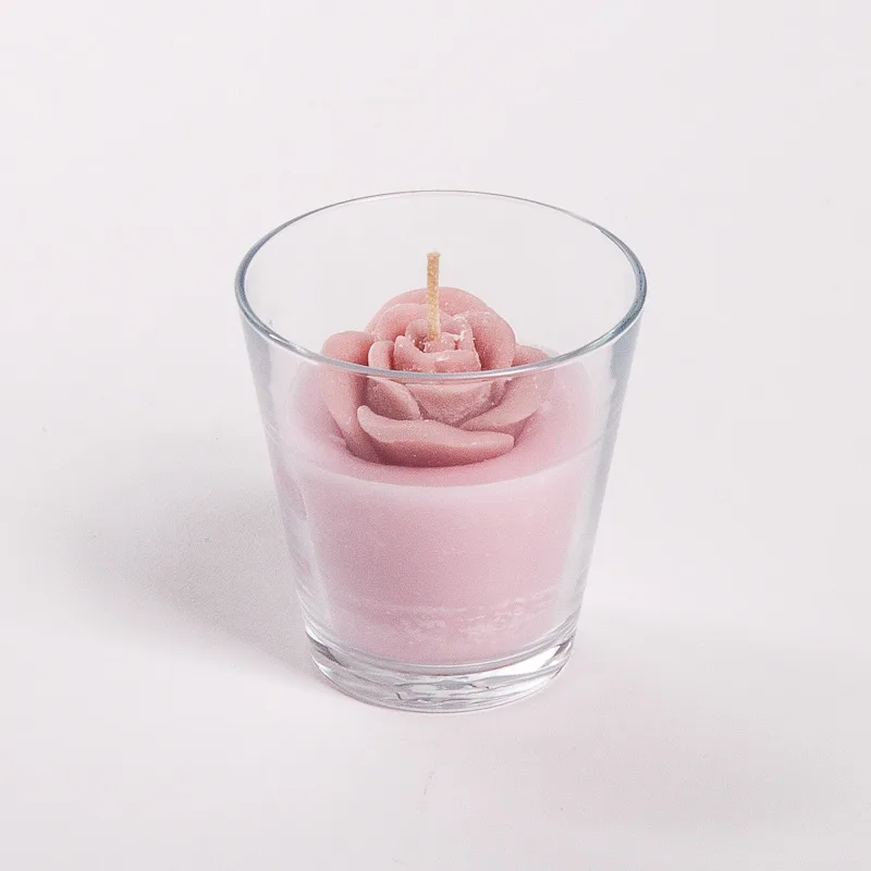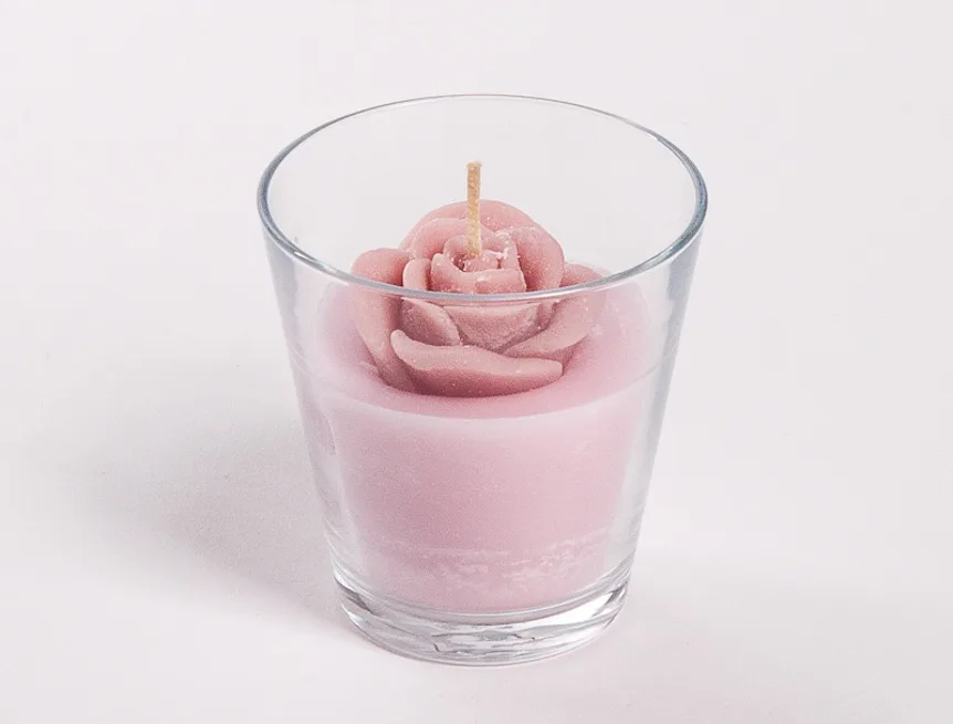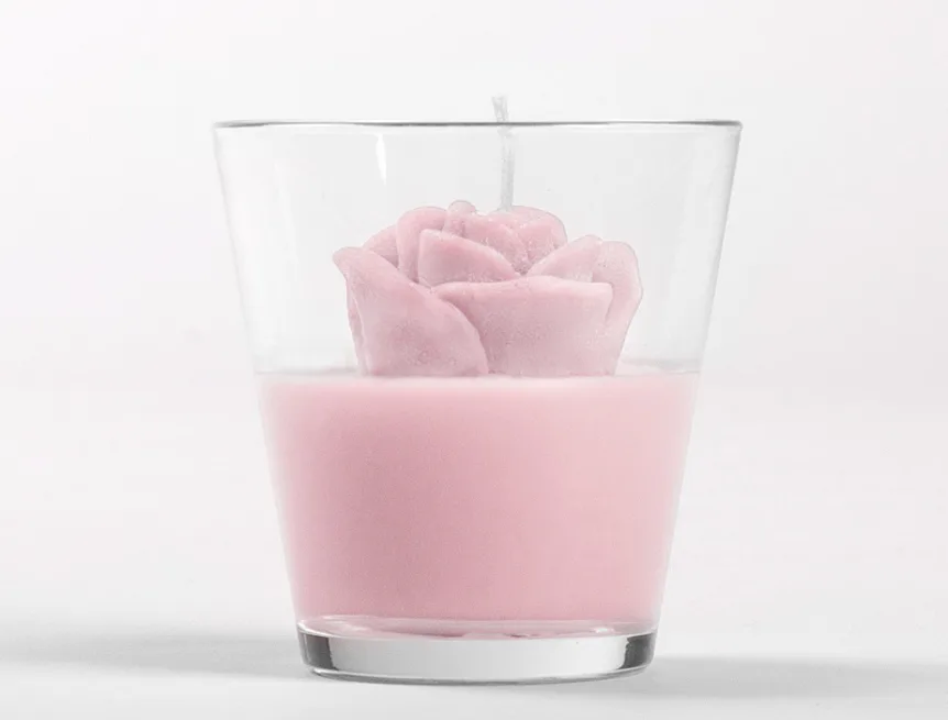 Originální, ručně vyráběná svíčka ve tvaru květu v pastelovém odstínu světle růžové barvy je skvělým tipem na dárek pro každou romantickou duši. Svíčka je dodávána ve skleněném svícnu a průhledném dárkovém balení s mašličkou.