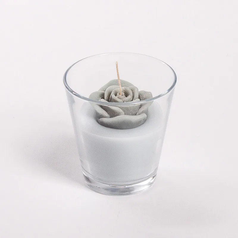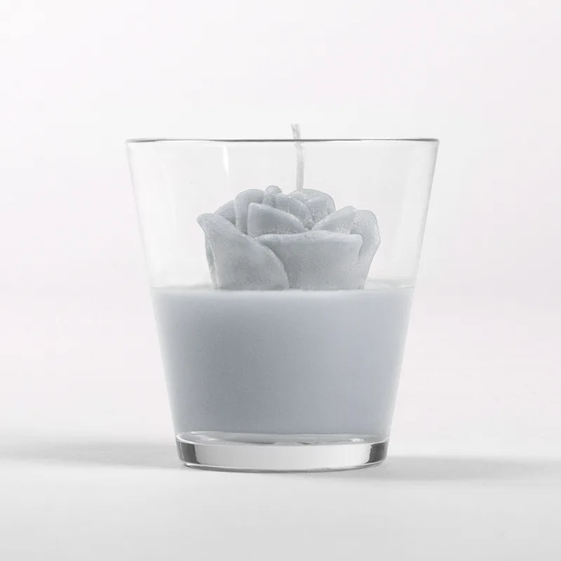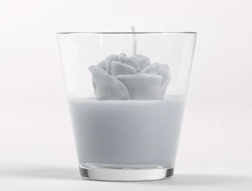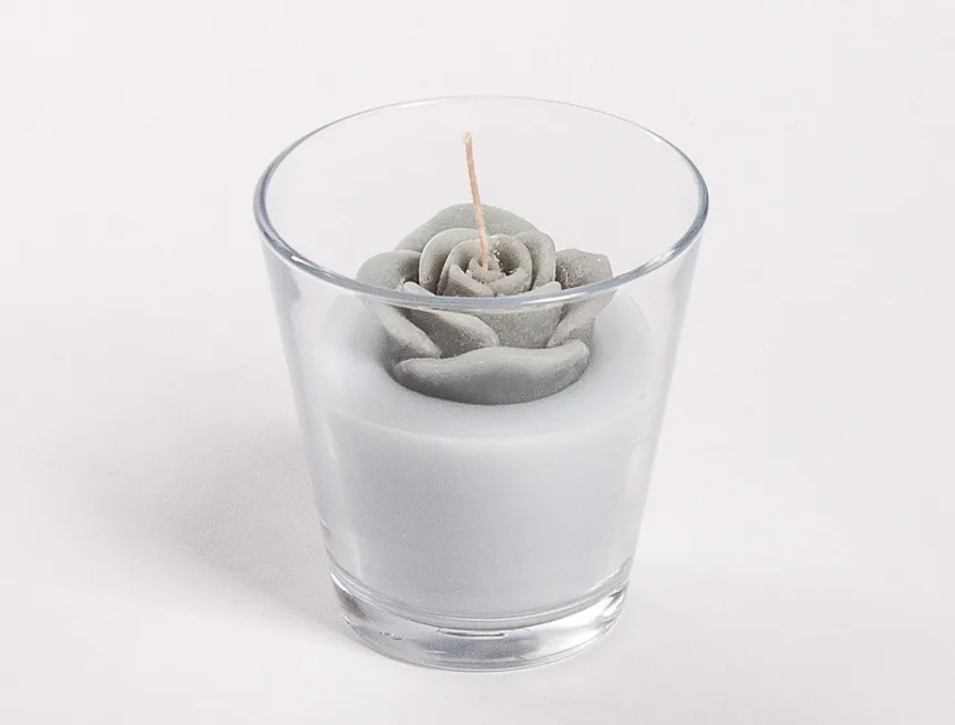 Originální, ručně vyráběná svíčka ve tvaru květu v pastelovém odstínu světlé holubí šedé barvy je skvělým tipem na dárek pro každou romantickou duši. Svíčka je dodávána ve skleněném svícnu a průhledném dárkovém balení s mašličkou.