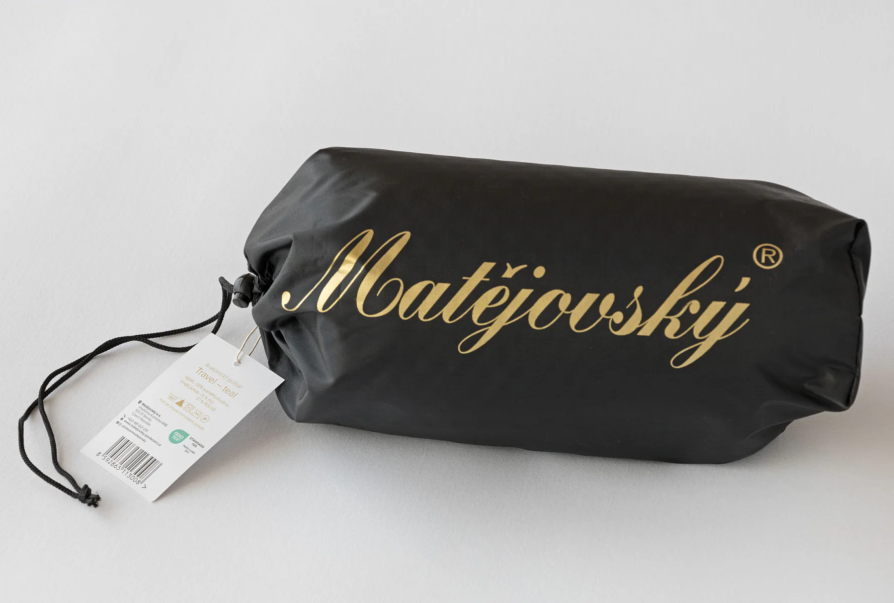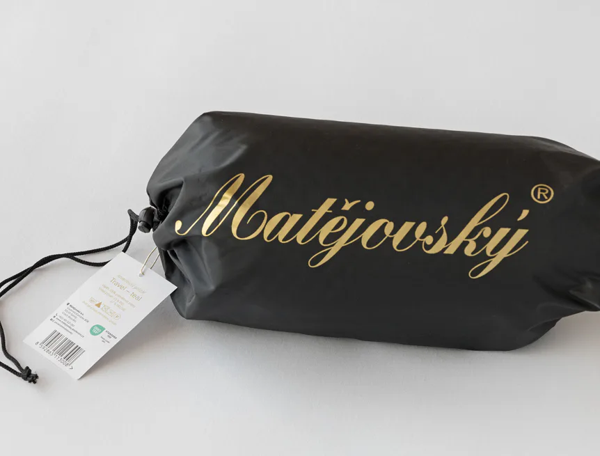 Balení: Anatomický polštář je balený v praktickém cestovním sáčku černé barvy s logem Matějovský.